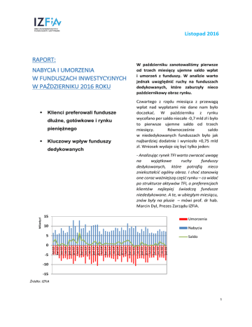 Listopad 2016 RAPORT: NABYCIA I UMORZENIA W FUNDUSZACH INWESTYCYJNYCH W PAŹDZIERNIKU 2016 ROKU Klienci preferowali fundusze dłużne, gotówkowe i rynku pieniężnego Kluczowy wpływ funduszy dedykowanych W październiku zanotowaliśmy pierwsze od trzech miesięcy ujemne saldo wpłat i umorzeń z funduszy. W analizie warto jednak uwzględnić ruchy na funduszach dedykowanych, które zaburzyły nieco październikowy obraz rynku. Czwartego z rzędu miesiąca z przewagą wpłat nad wypłatami nie dane nam było doczekać. W październiku z rynku wycofano per saldo niecałe -0,7 mld zł i było to pierwsze ujemne saldo od trzech miesięcy. Równocześnie saldo w niededykowanych funduszach było jak najbardziej dodatnie i wyniosło +0,75 mld zł. Wniosek wydaje się być tylko jeden: Miliardy zł - Analizując rynek TFI warto zwracać uwagę na wyjątkowe ruchy funduszy dedykowanych, które potrafią nieco zniekształcić ogólny obraz. I choć stanowią one coraz ważniejszą część rynku – co widać po strukturze aktywów TFI, o preferencjach klientów najlepiej świadczą fundusze niededykowane. A te, w ubiegłym miesiącu, znów były na plusie – mówi prof. dr hab. Marcin Dyl, Prezes Zarządu IZFiA. 15 Umorzenia 10 Nabycia 5 -5 lut-12 kwi-12 cze-12 sie-12 paź-12 gru-12 lut-13 kwi-13 cze-13 sie-13 paź-13 gru-13 lut-14 kwi-14 cze-14 sie-14 paź-14 gru-14 lut-15 kwi-15 cze-15 sie-15 paź-15 gru-15 lut-16 kwi-16 cze-16 sie-16 paź-16 0 Saldo -10 -15 Źródło: IZFiA 1 Listopad 2016 Bez względu na grupę klientów, ponownie największą popularnością mogły pochwalić się fundusze dłużne, do których wpłacono per saldo ponad +0,5 mld zł. To także czwarty miesiąc z rzędu, w którym kategoria ta pozyskała nowe środki z rynku. Widać również, że klienci preferują dług przedsiębiorstw: od lipca tego roku obligacje korporacyjne za każdym razem pozyskiwały więcej środków niż obligacje skarbowe. W całym 2016 r. tylko trzy razy zanotowały gorszy wynik. Wysoką korelację z funduszami dłużnymi, wykazują również fundusze gotówkowe i rynku pieniężnego, również wpadające w kategorię potencjalnie niższego ryzyka niż fundusze z wysokim komponentem akcyjnym. W październiku wpłacono do nich + 0,25 mld zł, co było drugim wynikiem po względem wartości w ubiegłym miesiącu. Dosyć podobną sytuację, podobnie jak we wrześniu, zaobserwować można było też w kategorii funduszy absolutnej stopy zwrotu, do których wpłacono prawie + 0,2 mld zł. I co ciekawe, grupa ta stała się w tej chwili drugą najpopularniejszą grupą inwestycji w tym roku, po tym jak nieznacznie wyprzedziła pod względem wpłaconych środków, wspomniane fundusze dłużne. A jeśliby wziąć pod uwagę tylko fundusze rynku publicznego, mielibyśmy tutaj zdecydowanego lidera. Przypomnijmy tylko, lidera, który jeszcze kilka lat temu, ledwo odnotowywał obecność na polskim rynku TFI. Kategoria funduszy Nabycia Umorzenia Saldo Saldo od początku roku Akcyjne 1 648,8 -2 957,6 -1 308,8 -3 818,1 Uniwersalne i Indeksowe Sektorowe Małych i Średnich Spółek 1 371,6 34,5 -2 553,5 -81,2 -1 181,9 -46,7 242,7 -322,9 -80,2 -2 808,6 -393,8 -615,7 Mieszane 845,0 -967,9 -122,9 -1 269,4 Aktywnej Alokacji i Selektywne Zrównoważone Ochrony Kapitału Stabilnego Wzrostu Inne 70,7 107,1 228,7 336,5 102,0 -90,3 -183,5 -135,7 -506,9 -51,5 -19,6 -76,4 93,0 -170,4 50,5 -163,7 -945,3 555,2 -1 103,4 387,8 Dłużne 1 525,3 -993,9 531,4 2 209,2 Bez głównej waluty Złotówkowe Inne waluty 486,6 986,7 52,0 -322,4 -643,6 -27,9 164,2 343,1 24,1 418,2 1 537,1 253,9 Gotówkowe i Rynku Pieniężnego Absolutnej stopy zwrotu Surowcowe Rynku niepublicznego* Suma końcowa W tym fundusze dedykowane: 2 140,4 390,3 134,9 480,8 7 166,0 413,2 -1 887,8 -195,6 -104,5 -740,7 -7 848,5 -1 843,9 252,6 194,7 30,4 -259,9 -682,4 -1 430,7 1 534,9 2 269,6 334,6 2 929,5 4 190,3 -875,6 Źródło: IZFiA (dane w mln zł, ze względu na zaokrąglone wartości poszczególne sumy mogą się nieznacznie różnić od rzeczywistych wartości) * Fundusze aktywów niepublicznych, nieruchomości i sekurytyzacyjne Zgoła odmienna sytuacja panuje na rynku akcji, i to zarówno bezpośrednio na GPW, jak i w odzwierciedleniu w postaci funduszy inwestycyjnych. Odpływ rzędu -1,3 mld zł to znów zasługa „jednorazowego” wpływu funduszy dedykowanych (saldo -1,1 mld zł w kategorii funduszy akcji). 2 Listopad 2016 Jednak już w grupie funduszy przeznaczonych dla szerokiego grona inwestorów, czyli tych niededykowanych, saldo netto było zdecydowanie niższe i wyniosło -0,2 mld zł. Reasumując, gdyby nie wpływ funduszy dedykowanych, październik nie odbiegał by wiele, od tego, czego świadkami jesteśmy od przynajmniej połowy tego roku. Czyli sukcesywnego, choć niełatwego, zwiększania aktywów TFI z nowych środków klientów, przerywanego od czasu do czasu, większymi, jednorazowymi odpływami. Świadczy to o sile rynku, jeśli weźmiemy kontekstt nie tylko polskiego rynku kapitałowego, ale również zapowiedzi zmian regulacyjnych w nim i jego otoczeniu. Raport przygotował: Zespół Izby Zarządzających Funduszami i Aktywami Raport powstał na bazie 565 funduszy, które zaraportowały do IZFiA. Izba Zarządzających Funduszami i Aktywami jest organizacją zrzeszającą, na zasadach dobrowolności, działające w Polsce towarzystwa funduszy inwestycyjnych, działa na mocy ustawy z dnia 27 maja 2004 roku o funduszach inwestycyjnych. Izba została powołana 28 października 2004 roku (wcześniej – od 1997 roku środowisko było reprezentowane przez Stowarzyszenie Towarzystw Funduszy Inwestycyjnych, którego następcą jest Izba). Członkami Izby jest obecnie 17 działających w Polsce towarzystw funduszy inwestycyjnych. Do Izby należy również 5 agentów transferowych. Kontakt: Izba Zarządzających Funduszami i Aktywami ul. Książęca 4 00-498 Warszawa e-mail: [email protected] Tel. +48 22 537 76 30 www.izfa.pl 3
