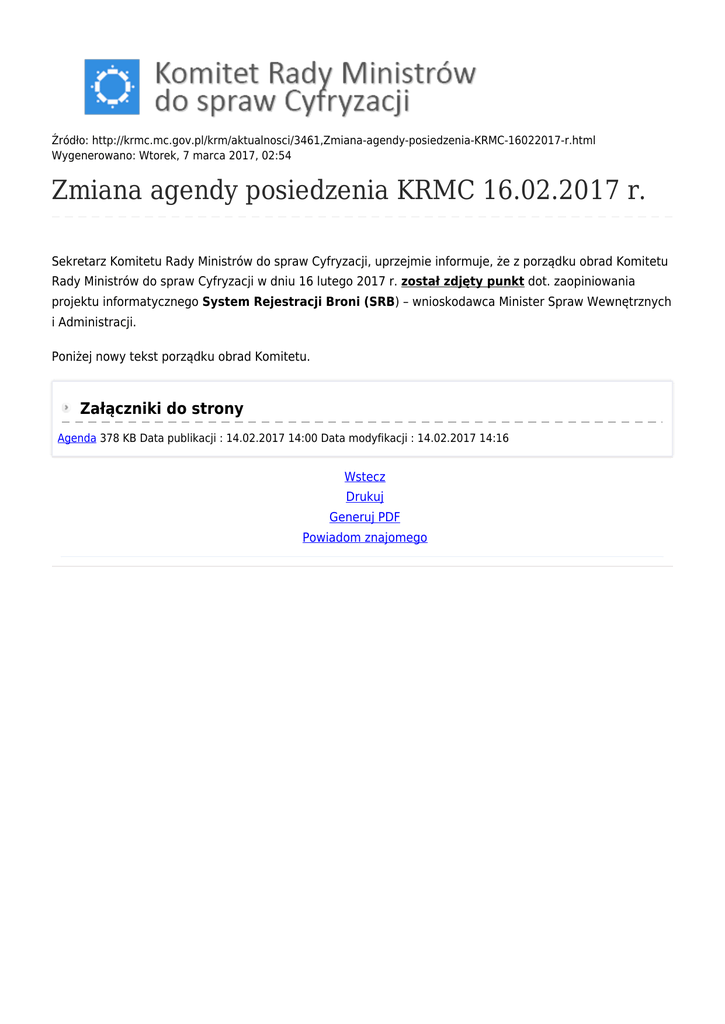 Źródło: http://krmc.mc.gov.pl/krm/aktualnosci/3461,Zmiana-agendy-posiedzenia-KRMC-16022017-r.html Wygenerowano: Wtorek, 7 marca 2017, 02:54 Zmiana agendy posiedzenia KRMC 16.02.2017 r. Sekretarz Komitetu Rady Ministrów do spraw Cyfryzacji, uprzejmie informuje, że z porządku obrad Komitetu Rady Ministrów do spraw Cyfryzacji w dniu 16 lutego 2017 r. został zdjęty punkt dot. zaopiniowania projektu informatycznego System Rejestracji Broni (SRB) – wnioskodawca Minister Spraw Wewnętrznych i Administracji. Poniżej nowy tekst porządku obrad Komitetu. Załączniki do strony Agenda 378 KB Data publikacji : 14.02.2017 14:00 Data modyfikacji : 14.02.2017 14:16 Wstecz Drukuj Generuj PDF Powiadom znajomego