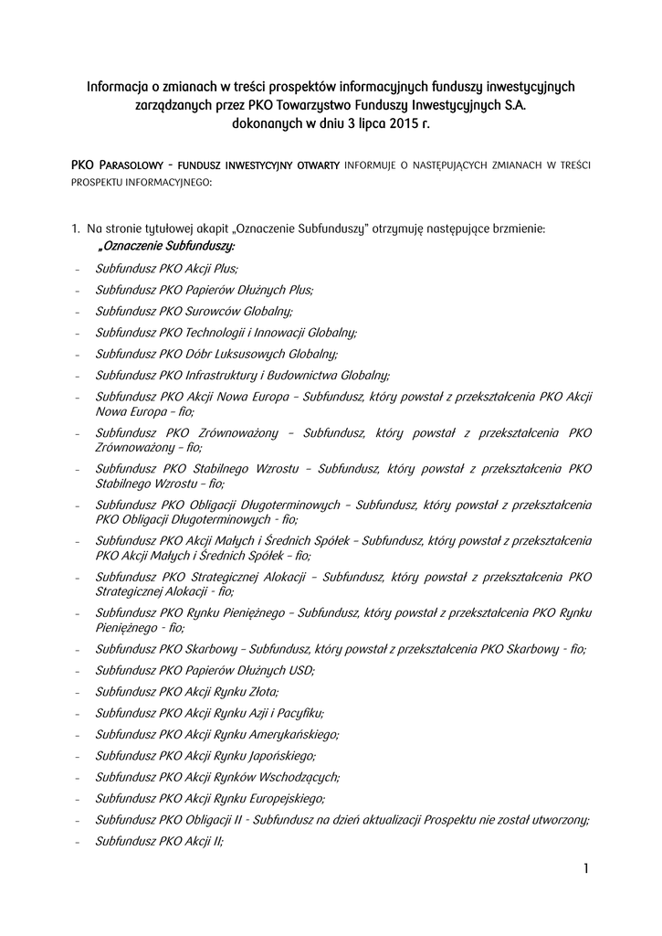 Informacja o zmianach w treści prospektów informacyjnych funduszy inwestycyjnych zarządzanych przez PKO Towarzystwo Funduszy Inwestycyjnych S.A. dokonanych w dniu 3 lipca 2015 r. PKO PARASOLOWY - FUNDUSZ INWESTYCYJNY OTWARTY INFORMUJE O NASTĘPUJĄCYCH ZMIANACH W TREŚCI PROSPEKTU INFORMACYJNEGO: 1. Na stronie tytułowej akapit „Oznaczenie Subfunduszy” otrzymuję następujące brzmienie: „Oznaczenie Subfunduszy: - Subfundusz PKO Akcji Plus; - Subfundusz PKO Papierów Dłużnych Plus; - Subfundusz PKO Surowców Globalny; - Subfundusz PKO Technologii i Innowacji Globalny; - Subfundusz PKO Dóbr Luksusowych Globalny; - Subfundusz PKO Infrastruktury i Budownictwa Globalny; - Subfundusz PKO Akcji Nowa Europa – Subfundusz, który powstał z przekształcenia PKO Akcji Nowa Europa – fio; - Subfundusz PKO Zrównoważony – Subfundusz, który powstał z przekształcenia PKO Zrównoważony – fio; - Subfundusz PKO Stabilnego Wzrostu – Subfundusz, który powstał z przekształcenia PKO Stabilnego Wzrostu – fio; - Subfundusz PKO Obligacji Długoterminowych – Subfundusz, który powstał z przekształcenia PKO Obligacji Długoterminowych - fio; - Subfundusz PKO Akcji Małych i Średnich Spółek – Subfundusz, który powstał z przekształcenia PKO Akcji Małych i Średnich Spółek – fio; - Subfundusz PKO Strategicznej Alokacji – Subfundusz, który powstał z przekształcenia PKO Strategicznej Alokacji - fio; - Subfundusz PKO Rynku Pieniężnego – Subfundusz, który powstał z przekształcenia PKO Rynku Pieniężnego - fio; - Subfundusz PKO Skarbowy – Subfundusz, który powstał z przekształcenia PKO Skarbowy - fio; - Subfundusz PKO Papierów Dłużnych USD; - Subfundusz PKO Akcji Rynku Złota; - Subfundusz PKO Akcji Rynku Azji i Pacyfiku; - Subfundusz PKO Akcji Rynku Amerykańskiego; - Subfundusz PKO Akcji Rynku Japońskiego; - Subfundusz PKO Akcji Rynków Wschodzących; - Subfundusz PKO Akcji Rynku Europejskiego; - Subfundusz PKO Obligacji II - Subfundusz na dzień aktualizacji Prospektu nie został utworzony; - Subfundusz PKO Akcji II; 1 - Subfundusz PKO Akcji III - Subfunudsz na dzień aktualizacji Prospektu nie został utworzony.”. 2. Na stronie tytułowej w punkcie 5 datę „26 czerwca 2015 r.” zastępuje się datą „3 lipca 2015 r.”. 3. W Rozdziale II w pkt 9 po podpunkcie 9.13. dodaje się podpunkt 9.14. w brzmieniu: „9.14. NEPTUN – fundusz inwestycyjny zamknięty aktywów niepublicznych.”. 4. W Rozdziale III skreśla się podrozdziały: „Podrozdział IIIj Subfundusz PKO Skarbowy Plus”, „Podrozdział IIIk Subfundusz PKO Akcji”, „Podrozdział IIIo Subfundusz PKO Obligacji”. 5. W Rozdziale V pkt. 2 wykreśla się nazwy następujących subfunduszy: „PKO Skarbowy Plus”, „PKO Akcji”, „PKO Obligacji”. 6. W Rozdziale VI w pkt. 1 po ppkt 1.5. dodaje się ppkt 1.6. w następującym brzmieniu: „1.6. Do dnia 3 lipca 2015 r. w Funduszu działał: - Subfundusz PKO Skarbowy Plus. W dniu 3 lipca 2015 r. został on połączony z Subfunduszem Skarbowy, jako subfundusz przejmowany. - Subfundusz PKO PKO Akcji. W dniu 3 lipca 2015 r. został on połączony z Subfunduszem PKO Akcji Plus, jako subfundusz przejmowany. - Subfundusz PKO Obligacji. W dniu 3 lipca 2015 r. został on połączony z Subfunduszem PKO Papierów Dłużnych Plus jako subfundusz przejmowany.” 7. Załącza się aktualny statut PKO Parasolowy – funduszu inwestycyjnego otwartego stanowiący załącznik nr 2 do prospektu informacyjnego. 8. Spis treści otrzymuje nowe następujące brzmienie. „Spis Treści Prospekt informacyjny PKO Parasolowy - fundusz inwestycyjny otwarty. Rozdział I Osoby odpowiedzialne za informacje zawarte w prospekcie. Rozdział II Dane o PKO Towarzystwie Funduszy Inwestycyjnych S.A. Rozdział III Dane o PKO Parasolowy - fundusz inwestycyjny otwarty. Podrozdział IIIa Dane o PKO Akcji Plus Podrozdział IIIb Dane o PKO Zrównoważony Plus (skreślony) Podrozdział IIIc Dane o PKO Stabilnego Wzrostu Plus (skreślony) Podrozdział IIId Dane o PKO Papierów Dłużnych Plus Podrozdział IIIe Dane o PKO Surowców Globalny Podrozdział IIIf Dane o PKO Technologii i Innowacji Globalny Podrozdział IIIg Dane o PKO Dóbr Luksusowych Globalny Podrozdział IIIh Dane o PKO Infrastruktury i Budownictwa Globalny Podrozdział IIIi Dane o PKO Akcji Małych i Średnich Spółek Plus (skreślony) Podrozdział IIIj Dane o PKO Skarbowy Plus (skreślony) 2 Podrozdział IIIk Dane o PKO Akcji (skreślony) Podrozdział III l Dane o PKO Akcji Nowa Europa Podrozdział IIIm Dane o PKO Zrównoważony Podrozdział IIIn Dane o PKO Stabilnego Wzrostu Podrozdział IIIo Dane o PKO Obligacji (skreślony) Podrozdział IIIp Dane o PKO Obligacji Długoterminowych Podrozdział IIIr Dane o PKO Akcji Małych i Średnich Spółek Podrozdział IIIs Dane o PKO Strategicznej Alokacji Podrozdział IIIt Dane o PKO Rynku Pieniężnego Podrozdział IIIu Dane o PKO Skarbowy Podrozdział IIIv Dane o PKO Papierów Dłużnych USD Podrozdział IIIw Dane o PKO Akcji Rynku Złota Podrozdział IIIx Dane o PKO Akcji Azji i Pacyfiku Podrozdział IIIy Dane o PKO Akcji Rynku Amerykańskiego Podrozdział IIIz Dane o PKO Akcji Rynku Japońskiego Podrozdział IIIaa Dane o PKO Akcji Rynków Wschodzących Podrozdział IIIab Dane o PKO Akcji Rynku Europejskiego Podrozdział IIIac Dane o PKO Obligacji II Podrozdział IIIad Dane o PKO Akcji II; Podrozdział IIIae Dane o PKO Akcji III; Rozdział IV Dane o Depozytariuszu. Rozdział V Dane o podmiotach obsługujących Fundusz. Rozdział VI Informacje dodatkowe. Rozdział VII Załączniki (definicje pojęć i objaśnienia skrótów, Statut).” 3