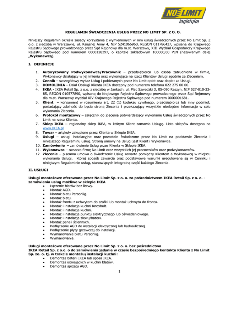 REGULAMIN ŚWIADCZENIA USŁUG PRZEZ NO LIMIT SP. Z O. O. Niniejszy Regulamin określa zasady korzystania z wymienionych w nim usług świadczonych przez No Limit Sp. Z o.o. z siedzibą w Warszawie, ul. Księżnej Anny 4, NIP 5241066960, REGON 011786437, wpisaną do Krajowego Rejestru Sądowego prowadzonego przez Sąd Rejonowy dla m.st. Warszawy, XIII Wydział Gospodarczy Krajowego Rejestru Sądowego pod numerem 0000128397, o kapitale zakładowym 100000,00 PLN (nazywanym dalej „Wykonawcą). I. DEFINICJE 1. Autoryzowany Podwykonawca/Pracownik – przedsiębiorca lub osoba zatrudniona w firmie, Wykonawcy działający w jej imieniu oraz wykonująca na rzecz Klientów Usługi zgodnie ze Zleceniem. 2. Cennik – szczegółowy wykaz Usług i pobieranych przez No Limit opłat oraz dopłat za Usługi. 3. DOMOLINIA – Dział Obsługi Klienta IKEA dostępny pod numerem telefonu 022 275 00 00. 4. IKEA - IKEA Retail Sp. z o.o. z siedzibą w Jankach, ul. Plac Szwedzki 3, 05-090 Raszyn, NIP 527-010-3385, REGON 010577890, wpisaną do Krajowego Rejestru Sądowego prowadzonego przez Sąd Rejonowy dla m.st. Warszawy wydział XIV Krajowego Rejestru Sądowego pod numerem 0000091681. 5. Klient – konsument w rozumieniu art. 22 (1) kodeksu cywilnego, przedsiębiorca lub inny podmiot, posiadający zdolność do bycia stroną Zlecenia i przekazujący wszystkie niezbędne informacje w celu wykonania Zlecenia. 6. Protokół montażowy – załącznik do Zlecenia potwierdzający wykonanie Usług świadczonych przez No Limit na rzecz Klienta. 7. Sklep IKEA – regionalny sklep IKEA, w którym Klient zamawia Usługę. Lista sklepów dostępna na www.IKEA.pl 8. Towar – artykuły zakupione przez Klienta w Sklepie IKEA. 9. Usługi – usługi instalacyjne oraz pozostałe świadczone przez No Limit na podstawie Zlecenia i niniejszego Regulaminu usług. Stroną umowy na Usługi jest Klient i Wykonawca. 10. Zamówienie – zamówienie Usług przez Klienta w Sklepie IKEA. 11. Wykonawca – oznacza firmę No Limit oraz wszystkich jej pracowników oraz podwykonawców. 12. Zlecenie – pisemna umowa o świadczenie Usług zawarta pomiędzy Klientem a Wykonawcą w miejscu wykonania Usługi, której sposób zawarcia oraz podstawowe warunki uregulowane są w Cenniku i niniejszym Regulaminie usług, stanowiących integralną część każdego Zlecenia. II. USŁUGI Usługi montażowe oferowane przez No Limit Sp. z o. o. za pośrednictwem IKEA Retail Sp. z o. o. zamówienia usług możliwe w sklepie IKEA Łączenie blatów bez listwy. Montaż AGD. Montaż blatu Personlig. Montaż blatu. Montaż frontu z uchwytem do szafki lub montaż uchwytu do frontu. Montaż i instalacja kuchni Knoxhult. Montaż i instalacja kuchni. Montaż i instalacja punktu elektrycznego lub oświetleniowego. Montaż i instalacja zlewu/baterii. Montaż paneli ściennych. Podłączenie AGD do instalacji elektrycznej lub hydraulicznej. Podłączenie płyty grzewczej do instalacji. Wymiarowanie blatu Personlig. Wymiarowanie. Usługi montażowe oferowane przez No Limit Sp. z o. o. bez pośrednictwa IKEA Retail Sp. z o.o. o do zamówienia jedynie w czasie bezpośredniego kontaktu Klienta z No Limit Sp. zo. o. tj. w trakcie montażu/instalacji kuchni: Demontaż baterii IKEA lub spoza IKEA. Demontaż istniejących w kuchni blatów. Demontaż sprzętu AGD. 1 1. 2. 3. 4. 5. 6. 7. 8. Demontaż zlewu IKEA lub spoza IKEA. Instalacja gniazd elektrycznych 230V Instalacja zaworów hydraulicznych. Montaż akcesoriów dodatkowych. Montaż i podłączenie dodatkowego oświetlenia IKEA. Montaż i podłączenie punktu oświetlenia spoza IKEA. Montaż i podłączenie taśmy LED spoza IKEA. Montaż nóżek kuchennych spoza IKEA. Przerabianie szafek kuchennych. Przerobienie blatów Personlig przy wymiarowaniu klienta. Wykonanie szafki/półek z paneli maskujących/blatów z montażem. Cena za Usługi zamawiane w IKEA są wyliczane według Cennika ( Załącznik nr. 1 A ) i zakresu zlecanych prac. Ceny za usługi montażowe oferowane przez No Limit Sp. z o.o. bez pośrednictwa IKEA, są wymienione w Cenniku ( Załącznik nr. 1B ). IKEA w zakresie Usług wynikających z Cennika i Regulaminu Usług pełni rolę pomocniczą dla Klienta i Wykonawcy. W Sklepie IKEA Klient dokonuje Zamówienia, które przekazywane jest do Wykonawcy. Przekazane zlecenie zawiera ostateczną datę wykonania Usług oraz inne niezbędne informacje do prawidłowego wykonania Usług. IKEA nie jest stroną umowy między Klientem a Wykonawcą i nie ponosi odpowiedzialności za ewentualne nieprawidłowości w wykonaniu Zlecenia. Cena wskazana w Zamówieniu jest szacunkowa i nie wiążąca, za wyjątkiem sytuacji jej potwierdzenia przez Punkt Obsługi Transportowej IKEA (dotyczy tylko: zakup Usług za pomocą kredytu w banku Ikano Bank GmbH (Sp. z o.o.) Oddział w Polsce, bądź ich opłacenia przelewem bankowym). Klient dokonuje opłaty gotówką za Usługę bezpośrednio u Autoryzowanego Podwykonawcy/ Pracownika po jej zrealizowaniu, z zastrzeżeniem punktu 6 poniżej. Opłata za zrealizowaną Usługę pobierana jest zgodnie z uzgodnionym i zaakceptowanym przez Klienta przed rozpoczęciem montażu ostatecznym zakresem prac i kosztem ustalonym przez Autoryzowanego Podwykonawcę/Pracownika w Zleceniu. Po wykonanej usłudze klient otrzymuje protokół montażowy na którym widnieje kwota za zrealizowaną usługę, na życzenie klienta wykonawca wysyła fakturę lub paragon w ciągu 7 dni od zakończenia usługi. W sytuacji gdy finansowanie Usług ma się odbyć za pomocą kredytu w Ikano Bank GmbH (Sp. z o.o.) Oddział w Polsce, bądź ich opłacenia przelewem bankowym zapłata za Usług dokonywana jest w Sklepie IKEA po złożeniu Zamówienia.. W przypadku płatności za Usługę w Sklepie IKEA Klient zobowiązany jest do okazania dowodu płatności ( paragon lub faktura VAT ) za Usługę Autoryzowanemu Podwykonawcy/Pracownikowi firmy No Limit. Potwierdzenie wykonania Usługi następuje w momencie złożenia podpi
