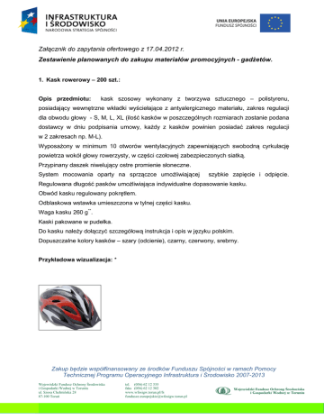 Załącznik do zapytania ofertowego z 17.04.2012 r. Zestawienie planowanych do zakupu materiałów promocyjnych - gadżetów. 1. Kask rowerowy – 200 szt.: Opis przedmiotu: kask szosowy wykonany z tworzywa sztucznego – polistyrenu, posiadający wewnętrzne wkładki wyściełające z antyalergicznego materiału, zakres regulacji dla obwodu głowy - S, M, L, XL (ilość kasków w poszczególnych rozmiarach zostanie podana dostawcy w dniu podpisania umowy, każdy z kasków powinien posiadać zakres regulacji w 2 zakresach np. M-L). Wyposażony w minimum 10 otworów wentylacyjnych zapewniających swobodną cyrkulację powietrza wokół głowy rowerzysty, w części czołowej zabezpieczonych siatką. Przypinany daszek niwelujący ostre promienie słoneczne. System mocowania oparty na sprzączce umożliwiającej szybkie zapięcie i odpięcie. Regulowana długość pasków umożliwiająca indywidualne dopasowanie kasku. Obwód kasku regulowany pokrętłem. Odblaskowa wstawka umieszczona w tylnej części kasku. Waga kasku 260 g**. Kaski pakowane w pudełka. Do kasku należy dołączyć szczegółową instrukcja i opis w języku polskim. Dopuszczalne kolory kasków – szary (odcienie), czarny, czerwony, srebrny. Przykładowa wizualizacja: * Zakup będzie współfinansowany ze środków Funduszu Spójności w ramach Pomocy Technicznej Programu Operacyjnego Infrastruktura i Środowisko 2007-2013 Wojewódzki Fundusz Ochrony Środowiska i Gospodarki Wodnej w Toruniu ul. Szosa Chełmińska 28 87-100 Toruń tel. (056) 62 12 335 faks (056) 62 12 302 www.wfosigw.torun.pl/fs [email protected] 2. Kamizelka odblaskowa – 170 szt.: Opis przedmiotu: kolor seledynowy- jasnozielony, etui w kolorze kamizelki, dwie taśmy odblaskowe, rozmiar L – XXL (ilość kamizelek w poszczególnych rozmiarach zostanie podana dostawcy w dniu podpisania umowy). Przykładowa wizualizacja: * 3. Torba zakładana na kierownicę rowerową – 60 szt.: (system montażu na kierownicy za pomocą stalowych zatrzasków) Opis przedmiotu: maksymalna nośność 4 kg**, pojemność 7 litrów**, zatrzask umożliwiający wygodny i szybki montaż/demontaż torby na kierownicy, główna komora i przednia kieszeń zamykane na zamek, kieszonka na drobne rzeczy, dwie boczne kieszonki z siatki, zintegrowany mapnik, gumka do przypięcia drobnych przedmiotów, pas do noszenia torby na ramieniu, pokrowiec przeciwdeszczowy, wewnętrzne plastikowe usztywnienie, wymiary (dł. x szer. x wys.) 15 x 24 x 18cm**. Przykładowa wizualizacja: * 4. Torba jutowa – 30 szt.: Wykonana w 100 % z surowców biodegradowalnych lub podlegających recyklingowi. Wyposażona w przegródkę umożliwiającą przechowywanie np. portfela. Wymiar : 41 x 34 x 13 cm**. Kolor torby – brązowy, raczki w kolorze – oliwkowym. Rączki zabezpieczone metalowymi okuciami (wykonane z tego samego co torba materiału). Dopuszczalne obciążenie minimum 6 kg. Wnętrze torby zabezpieczone wodoodpornym impregnatem. Przykładowa wizualizacja: * * Zamieszczone powyżej zdjęcia są jedynie przykładem graficznym i nie stanowią obligatoryjnego wzoru. ** Dopuszcza się odstępstwo w wysokości 5 % danego wymiaru lub wagi.