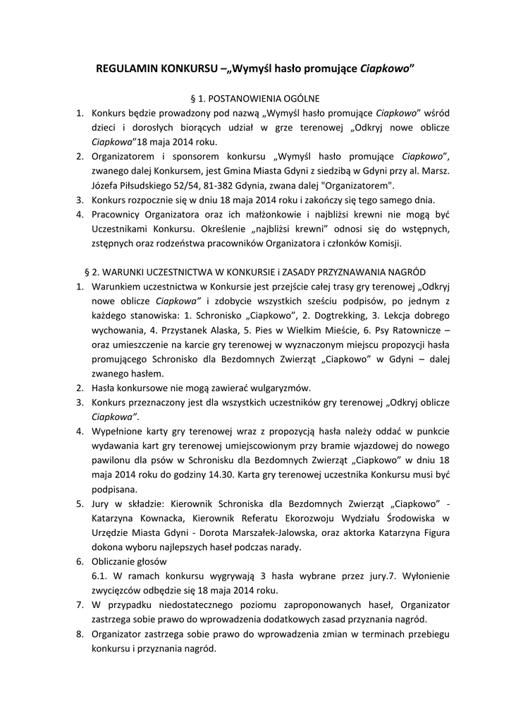 REGULAMIN KONKURSU –„Wymyśl hasło promujące Ciapkowo”