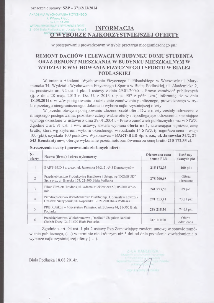 oznaczenie sprawy: SZP - 371/2/13/2014 A K A D E M IA W Y C H O W A N IA FIZYCZNEGO J. Piłsudskiego w W A R SZA W IE W YDZIA! W YCHO W ANIA FIZYCZNEGO I SPORTU 21-500 iw i7 A n ii* i r i * INFORMACJA O WYBORZE NAJKORZYSTNIEJSZEJ OFERTY ^ Po ihska, ul. Ak a d e mi c k a 2 w postępowaniu prowadzonym w trybie przetargu nieograniczonego pn.: REMONT DACHÓW I ELEWACJI W BUDYNKU DOMU STUDENTA ORAZ REMONT MIESZKANIA W BUDYNKU MIESZKALNYM W WYDZIALE WYCHOWANIA FIZYCZNEGO I SPORTU W BIAŁEJ PODLASKIEJ W imieniu Akademii Wychowania Fizycznego J. Piłsudskiego w Warszawie ul. Marymoncka 34, Wydziału Wychowania Fizycznego i Sportu w Białej Podlaskiej, ul. Akademicka 2, na podstawie art. 92 ust. 1 pkt. 1 ustawy z dnia 29.01.2004r. - Prawo zamówień publicznych (tj. z dnia 28 maja 2013 r. Dz. U. z 2013 r. poz. 907 z późn. zm.) informuję, że w dniu 18.08.2014r. w w/w postępowaniu o udzielenie zamówienia publicznego, prowadzonego w try bie przetargu nieograniczonego, dokonano wyboru najkorzystniejszej oferty. W przedmiotowym postępowaniu złożono sześć ofert. Dwie oferty zostały odrzucone z niniejszego postępowania, pozostało cztery ważne oferty niepodlegające odrzuceniu, spełniające wymogi określone w ustawie z dnia 29.01.2004r. - Prawo zamówień publicznych oraz w SIWZ. Zgodnie z art. 91 ust. 1 w/w ustawy, została wybrana oferta nr 1, zawierająca najniższą cenę brutto, która wg kryterium wyboru określonego w rozdziale 14 SIWZ tj. najniższa cena - waga 100 (pkt), uzyskała 100 punktów. Wykonawca - BART-BUD Sp. z o.o., ul. Janowska 34/2, 21543 Konstantynów, oferuje wykonanie przedmiotu zamówienia za cenę brutto 215 172,33 zł. Streszczenie oceny i porównanie złożonych ofert: Nr oferty Nazwa (firma) i adres wykonawcy Oferowana cena brutto PLN Ilość uzy skanych pkt 1 BART-BUD Sp. z o.o., ul. Janowska 34/2, 21-543 Konstantynów 215 172,33 100 pkt 2 Przedsiębiorstwo Produkcyjne Handlowe i Usługowe ‘DOM BUD” Sp. z o.o., ul. Brzeska 174, 21-500 Biała Podlaska 278 700,68 Oferta odrzucona 3 Elbud Elżbieta Trudnos, ul. Adama M ickiewicza 50, 05-200 W oło min 241 753,58 89 pkt 4 Przedsiębiorstwo Wielobranżowe BialBud Sp. J. Stanisław Lewczuk Czesław Niczyporuk, ul. Kopernika 12, 21-500 Biała Podlaska 291 513,41 73,81 pkt 5 PRB Rubikon - M ieczysław Panasiuk, ul. Bukowa 44, 21-500 Biała Podlaska 288 218,56 74,65 pkt 6 Przedsiębiorstwo W ielobranżowe „Daniluk” Zbigniew Daniluk, Cicibór Duży 12, 21-500 Biała Podlaska 316 110,00 Oferta odrzucona Zgodnie z art. 94 ust. 1 pkt 2 ustawy Pzp Zamawiający zawiera umowę w sprawie zamó wienia publicznego, (...) w terminie nie krótszym niż 5 dni od dnia przesłania zawiadomienia o wyborze najkorzystniejszej oferty (....). Biała Podlaska 18.08.2014r.