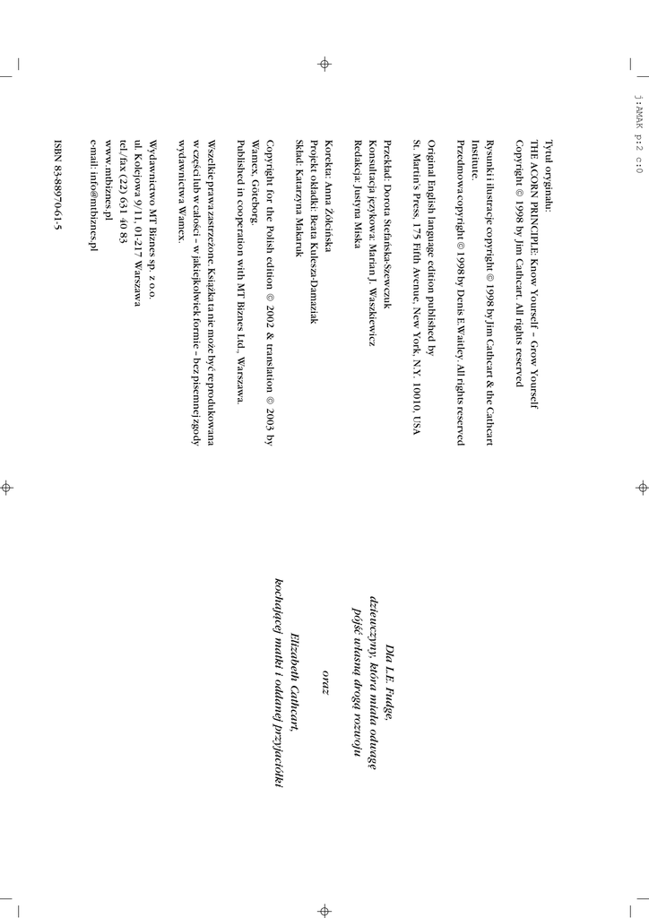 j:AMAK p:2 c:0 Tytuł oryginału: THE ACORN PRINCIPLE: Know Yourself – Grow Yourself Copyright 1998 by Jim Cathcart. All rights reserved Rysunki i ilustracje copyright 1998 by Jim Cathcart & the Cathcart Institute. Przedmowa copyright 1998 by Denis E.Waitley. All rights reserved Original English language edition published by St. Martin’s Press, 175 Fifth Avenue, New York, N.Y. 10010, USA Przekład: Dorota Stefańska-Szewczuk Konsultacja językowa: Marian J. Waszkiewicz Redakcja: Justyna Miska Korekta: Anna Żółcińska Projekt okładki: Beata Kulesza-Damaziak Skład: Katarzyna Makaruk Copyright for the Polish edition 2002 & translation 2003 by Wamex, Göteborg. Published in cooperation with MT Biznes Ltd., Warszawa. Wszelkie prawa zastrzeżone. Książka ta nie może być reprodukowana w części lub w całości – w jakiejkolwiek formie – bez pisemnej zgody wydawnictwa Wamex. Wydawnictwo MT Biznes sp. z o.o. ul. Kolejowa 9/11, 01-217 Warszawa tel./fax (22) 631 40 83 www.mtbiznes.pl e-mail: [email protected] ISBN 83-88970-61-5 Dla L.E. Fudge, dziewczyny, która miała odwagę pójść własną drogą rozwoju oraz Elizabeth Cathcart, kochającej matki i oddanej przyjaciółki j:AMAK p:3 c:0 Spis treści Podziękowania . . . . . . . . . . . . . . . . . . . . . . . Słowo wstępne dr. Denisa E. Waitleya . . . . . . . . . Przedmowa . . . . . . . . . . . . . . . . . . . . . . . . . Część pierwsza: Poznaj swe naturalne predyspozycje . . . . . . . . . . . . . . . . . . . . . . . 1. Nieustannie poznawaj samego siebie . . . . . . 2. Zasada żołędzia: nosisz w sobie zalążek dębu . 3. Czy żyjesz pełnią życia? . . . . . . . . . . . . . . . Część druga: Poznaj samego siebie: wędrówka po meandrach własnej osobowości . . . . . . . . . 4. Układy funkcjonujące w tobie i twym otoczeniu 5. Siedem wartości wrodzonych, czyli na czym ci zależy i dlaczego tego pragniesz . . . . . . . . 6. Szukamy strefy optymalnej szybkości osobistej 7. Jakiego rodzaju jest twoja inteligencja? Inteligencje wielorakie . . . . . . . . . . . . . . . 8. W jaki sposób myślisz? Twoje pasmo intelektualne . . . . . . . . . . . . . . . . . . . . . 9. Styl zachowania, czyli to, co inni nazywają twoją „osobowością” . . . . . . . . . . . . . . . . . . . . . 21 27 37 49 . . . 9 . . 13 . . 17 . . . . . . 63 . . 67 . . 73 . . 91 . . 109 . . 125 . . 139 Spis treści j:AMAK p:4 c:0 8 10. Zrozumieć swoją przeszłość: natura + pielęgnacja = rozwój . . . . . . . . . . . . . . . . . . . . . . . . . 155 11. Konstruujemy profil osobowy – twoja charakterystyka . . . . . . . . . . . . . . . . . . . . . 171 Część trzecia: Pielęgnuj wrodzone predyspozycje . . . . 191 12. W jaki sposób twoje związki z innymi cię definiują? Rozwijamy krąg najbliższych związków . . . . . . . . . . . . . . . . . . . . . . . . . 195 13. W poszukiwaniu sensu: wewnątrz i na zewnątrz . . . . . . . . . . . . . . . . . . . . . . . 213 14. Identyfikacja psychologicznych słabych punktów . . . . . . . . . . . . . . . . . . . . . . . . . 231 15. Siatka spełnienia – dwa czynniki, które determinują twe życie . . . . . . . . . . . . . . . . . 245 16. Twoja wizja przyszłości określa, kim będziesz . . . 263 Posłowie . . . . . . . . . . . . . . . . . . . . . . . . . . . . . 279 Dalsze zastosowania tej książki . . . . . . . . . . . . . . . 285 j:AMAK p:13 c:0 M 1. Nieustannie poznawaj samego siebie ieliśmy przed sobą dziesięć godzin ciężkiego marszu i byliśmy bardzo podekscytowani. Przed nami wznosiła się góra, której szczyt zdawał się mówić z uśmiechem: „Nawet nie przypuszczacie, jaki szykuję dla was widok!” Doszedłszy do głębokiego strumienia, stanęliśmy w obliczu wyboru: czy zejść po skarpie w dół i brodząc w wodzie, przedostać się na drugi brzeg, czy też spróbować przeskoczyć przez rozpadlinę? Żadna z opcji nie wydawała się szczególnie zachęcająca, przeszkodę trzeba było jednak pokonać. Większość z nas postanowiła przejść w bród, ale jeden członek grupy, Tony, zdecydował się na skok. Z wyrazem determinacji na twarzy ruszył naprzód. Pokonał przeszkodę nawet z pewnym zapasem bezpieczeństwa, lecz upadł na ziemię wijąc się z bólu. Wyglądało na to, że odezwała się dawna kontuzja kolana pochodząca jeszcze z okresu studiów. Od żołędzia do dębu j:AMAK p:14 c:0 28 Następne dziesięć godzin było dla Tony’ego prawdziwą męczarnią. Ból kolana odebrał mu całą przyjemność wspinaczki. Wszyscy inni doskonale się bawili. Czy byłeś kiedyś w podobnej sytuacji? Czy zdarzyło ci się przecenić własne możliwości fizyczne i w efekcie doznać kontuzji? A w sferze psychiki? Może przeliczyłeś się kiedyś, błędnie oceniając swe zdolności, lub też zbagatelizowałeś rolę, jaką w danej sytuacji odegrają uczucia? Większość z nas odpowie na te pytania twierdząco. Świadomość samego siebie – znajomość własnej natury, zdolności oraz sposobu reagowania na ludzi i zdarzenia – stanowi prawdopodobnie najcenniejszą z umiejętności niezbędnych, by odpowiednio pokierować swym życiem. Im lepiej poznasz samego siebie, tym trafniejsze będą twoje decyzje. Z kolei im trafniejsze decyzje będziesz podejmował, tym bardziej udane będzie twe życie. W porównaniu z ludźmi, którzy niezbyt dobrze znają samych siebie, osoby o wysokim stopniu samoświadomości: • są lepszymi słuchaczami; • są mniej nieśmiałe; • rzadziej oceniają innych; • rzadziej podejmują się zadań, do których nie mają predyspozycji; • trafniej oceniają ryzyko; • chętniej przyznają się do błędu; • łatwiej odzyskują równowagę naruszoną przez rozczarowania; rzadziej są nieobecne w pracy; wydajniej pracują; skuteczniej radzą sobie ze stresem; rzadziej miewają problemy w stosunkach z innymi. • • • • Nieustannie poznawaj samego siebie 29 Krótko mówiąc, ludzie o wysokiej samoświadomości częściej odnoszą sukce