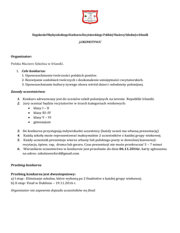 RegulaminMiędzyszkolnegoKonkursuRecytatorskiego Polskiej MacierzySzkolnejwIrlandii ,LOKOMOTYWA” Organizator: Polska Macierz Szkolna w Irlandii. 1. Cele konkursu: 1. Upowszechnienie twórczości polskich poetów. 2. Rozwijanie uzdolnień twórczych i doskonalenie umiejętności recytatorskich. 3. Upowszechnianie kultury żywego słowa wśród dzieci i młodzieży polonijnej. Zasady uczestnictwa: 1. Konkurs adresowany jest do uczniów szkół polonijnych na terenie Republiki Irlandii. 2. Jury oceniać będzie recytatorów w trzech kategoriach wiekowych: klasy I – II klasy III–IV klasy V – VI gimnazjum 3. Do konkursu przystępują indywidualni uczestnicy (każdy uczeń ma własną prezentację) 4. Każdą szkołę może reprezentować maksymalnie 2 uczestników z każdej grupy wiekowej. 5. Każdy uczestnik prezentuje wiersz własny lub polskiego poety w dowolnej konwencji: recytacja, śpiew, rap, drama lub gwara. Czas prezentacji nie może przekraczać 5 – 7 minut 6. Warunkiem uczestnictwa w konkursie jest przesłanie do dnia 06.11.2016r. karty zgłoszenia na adres: [email protected] Przebieg konkursu Przebieg konkursu jest dwustopniowy: a) I etap : Eliminacje szkolne, które wyłonią po 2 finalistów z każdej grupy wiekowej; b) II etap: Finał w Dublinie – 19.11.2016 r. Organizator nie zapewnia dojazdu uczestników na finał. Kryteria oceny dobór tekstu i jego pamięciowe opanowanie, interpretacja tekstu, kultura słowa, ogólny wyraz artystyczny (uzasadniony gest sceniczny, element ruchu, strój ). 6. Nagrody dla laureatów Laureaci I, II, III miejsca otrzymają atrakcyjne nagrody rzeczowe oraz dyplomy. Wszyscy uczestnicy finału otrzymają nagrody książkowe. Koordynator: Małgorzata Jirowska