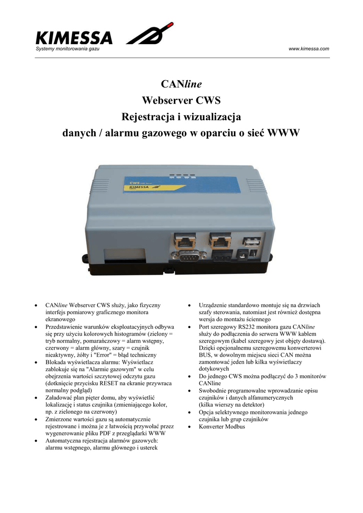 Systemy monitorowania gazu www.kimessa.com CANline Webserver CWS Rejestracja i wizualizacja danych / alarmu gazowego w oparciu o sieć WWW CANline Webserver CWS służy, jako fizyczny interfejs pomiarowy graficznego monitora ekranowego Przedstawienie warunków eksploatacyjnych odbywa się przy użyciu kolorowych histogramów (zielony = tryb normalny, pomarańczowy = alarm wstępny, czerwony = alarm główny, szary = czujnik nieaktywny, żółty i "Error" = błąd techniczny Blokada wyświetlacza alarmu: Wyświetlacz zablokuje się na "Alarmie gazowym" w celu obejrzenia wartości szczytowej odczytu gazu (dotknięcie przycisku RESET na ekranie przywraca normalny podgląd) Załadować plan pięter domu, aby wyświetlić lokalizację i status czujnika (zmieniającego kolor, np. z zielonego na czerwony) Zmierzone wartości gazu są automatycznie rejestrowane i można je z łatwością przywołać przez wygenerowanie pliku PDF z przeglądarki WWW Automatyczna rejestracja alarmów gazowych: alarmu wstępnego, alarmu głównego i usterek Urządzenie standardowo montuje się na drzwiach szafy sterowania, natomiast jest również dostępna wersja do montażu ściennego Port szeregowy RS232 monitora gazu CANline służy do podłączenia do serwera WWW kablem szeregowym (kabel szeregowy jest objęty dostawą). Dzięki opcjonalnemu szeregowemu konwerterowi BUS, w dowolnym miejscu sieci CAN można zamontować jeden lub kilka wyświetlaczy dotykowych Do jednego CWS można podłączyć do 3 monitorów CANline Swobodnie programowalne wprowadzanie opisu czujników i danych alfanumerycznych (kilka wierszy na detektor) Opcja selektywnego monitorowania jednego czujnika lub grup czujników Konverter Modbus Warunki techniczne Napięcie zasilania Wejście: Wymiary: Ciężar Zakres temperatur: System operacyjny Pamięć: 15 V= (24 V= jako opcja) RS232 (maks. odległość od CANline: 100 metrów) lub Modbus 162x104(122)x62 mm (z terminalami) 950 g od 0° do +50°C Przeglądarka z JAVA 16 MB, szeregowa, błyskowa Przykłady wydruków sieciowych: Wizualizacja alarmów wstępnych, alarmów głównych i błędów Bezpośrednia rejestracja stężenia gazu Wymiary 170,66 4,32 4,32 101,6 63,50 95,25 Uwaga: Preferuje się montaż na szynie DIN w stosunku do montażu tablicowego. Przedstawiciel w Polsce Dane i konstrukcja mogą ulec zmianie bez uprzedzenia 84-200 Wejherowo, ul. Kościuszki 6 www.mechvent.pl tel. +48 58 679 40 57, fax. +48 58 600 83 69 [email protected] CANline CWS 230614mb