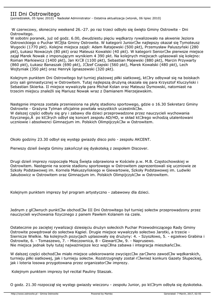 III Dni Ostrowitego (poniedziałek, 05 lipiec 2010) - Nadesłał Administrator - Ostatnia aktualizacja (wtorek, 06 lipiec 2010) W czerwcowy, słoneczny weekend 26.-27. po raz trzeci odbyło się święto Gminy Ostrowite - Dni Ostrowitego. W sobotni poranek, już od godz. 6.00, dwudziestu pięciu wędkarzy rywalizowało na akwenie Jeziora Ostrowickiego o Puchar WÃłjta Gminy Ostrowite. W kategorii JuniorÃłw najlepszy okazał się Tymoteusz Wygocki (1770 pkt). Kolejne miejsca zajęli: Adam Ratajewski (500 pkt), Przemysław Paluszyński (280 pkt), Łukasz Nowaczyk (80 pkt) oraz Mateusz Kowalski (40 pkt). W kategorii SeniorÃłw pierwsze miejsce zajął Marek Nowak z imponującym wynikiem 4 390 pkt. Na kolejnych miejscach uplasowali się kolejno: Roman Markiewicz (1400 pkt), Jan KrÃłl (1100 pkt), Sebastian Majewski (880 pkt), Marcin Przywarty (860 pkt), Łukasz Banaszak (690 pkt), JÃłzef Czapski (560 pkt), Marek Kowalski (480 pkt), Lech Wojtyniak (350 pkt) oraz Henryk Ignaszewski (320 pkt). Kolejnym punktem Dni Ostrowitego był turniej plażowej piłki siatkowej, ktÃłry odbywał się na boiskach przy sali gimnastycznej w Ostrowitem. Tutaj najlepszą drużyną okazała się para Krzysztof Kluczyński i Sebastian Skierka. II miejsce wywalczyła para Michał Kolan oraz Mateusz Dymowski, natomiast na trzecim miejscu znaleźli się Mariusz Nowak wraz z Damianem Mierzejewskim. Następnie impreza została przeniesiona na płytę stadionu sportowego, gdzie o 16.30 Sekretarz Gminy Ostrowite - Grażyna Tylman oficjalnie powitała wszystkich uczestnikÃłw. W dalszej części odbyły się gry i zabawy dla dzieci przeprowadzone przez nauczycieli wychowania fizycznego, po ktÃłrych odbył się koncert zespołu AD/HD, w skład ktÃłrego wchodzą utalentowani uczniowie i absolwenci Gimnazjum im. Polskich OlimpijczykÃłw w Ostrowitem. Około godziny 23.30 odbył się występ gwiazdy disco polo - zespołu AKCENT. Pierwszy dzień święta Gminy zakończył się dyskoteką z zespołem Discover. Drugi dzień imprezy rozpoczęła Mszą Święta odprawiona w Kościele p.w. M.B. Częstochowskiej w Ostrowitem. Następnie na scenie stadionu sportowego w Ostrowitem zaprezentowali się uczniowie ze Szkoły Podstawowej im. Kornela Makuszyńskiego w Giewartowie, Szkoły Podstawowej im. Ludwiki Jakubowicz w Ostrowitem oraz Gimnazjum im. Polskich OlimpijczykÃłw w Ostrowitem. Kolejnym punktem imprezy był program artystyczno - zabawowy dla dzieci. Jednym z głÃłwnych punktÃłw obchodÃłw III Dni Ostrowitego był turniej sołectw przeprowadzony przez nauczycieli wychowania fizycznego z panem Pawłem Kolanem na czele. Ostatecznie po zaciętej rywalizacji dziesięciu drużyn sołeckich Puchar Przewodniczącego Rady Gminy Ostrowite powędrował do sołectwa Kąpiel. Drugie miejsce wywalczyło sołectwo Jarotki, a trzecie Siernicze Wielkie. Na kolejnych pozycjach uplasowały się drużyny: 4. - Szyszłowo, 5. - egzekwo Grabina i Ostrowite, 6. - Tomaszewo, 7. - Mieczownica, 8 - GiewartÃłw, 9. - Naprusewo. Nie miejsca jednak były tutaj najważniejsze lecz wspÃłlna zabawa i integracja mieszkańcÃłw. W dalszej części obchodÃłw miało miejsce udekorowanie zwycięzcÃłw zarÃłwno zawodÃłw wędkarskich, turnieju piłki siatkowej, jak i turnieju sołectw. Rozstrzygnięty został rÃłwnież konkurs Gazety Słupeckiej, jak i loteria losowa przygotowana przez organizatorÃłw imprezy. Kolejnym punktem imprezy był recital Pauliny Staszak. O godz. 21.30 rozpoczął się występ gwiazdy wieczoru - zespołu Junior, po ktÃłrym odbyła się dyskoteka. http://www.ostrowite.pl - Gmina Ostrowite Powered by Mambo Generated: 7 March, 2017, 02:55 III Dniom Ostrowitego towarzyszyło szereg atrakcji, a w szczegÃłlności: przejażdżki bryczką, wystawy rzemiosła, podnośnik koszowy, wesołe miasteczko, dmuchane zamki i zjeżdżalnie, maskotki, konkursy z atrakcyjnymi nagrodami, pokaz pierwszej pomocy. WÃłjt oraz Przewodniczący Rady Gminy Ostrowite dziękują wszystkim, ktÃłrzy przyczynili się do uświetnienia III Dni Ostrowitego. Sponsorami imprezy byli: - Stowarzyszenie „Między Ludźmi i Jeziorami― - Wielkopolskie Stowarzyszenie na Rzecz Rozwoju ObszarÃłw Wiejskich - Gminna Biblioteka Publiczna w Ostrowitem - Gastro Music – Radosław Witkowski - SpÃłłdzielnia KÃłłek Rolniczych w Ostrowitem - Zbysław Szydlarek - Przedsiębiorstwo Produkcyjno – Budowlane „ROSKON― Państwo Marianna i Kazimierz Rosadowscy - Inspektorat PZU SA w Koninie - Bank SpÃłłdzielczy w Słupcy - Grzegorz Grobelny - Przedsiębiorstwo Usług Komunalnych EKO ze Strzałkowa - „Przempol― Usługi Transportowe i OgÃłlnobudowlane Roboty Ziemne i Komunalne Janusz Miłos - Państwowa Straż Pożarna w Słupcy - Apteka „HIBISCUS― – Małgorzata Śniegula - BIS-MED. – Barbara i Janusz Bisowie - Stadnina Koni w Mieczownicy - Gazeta Słupecka - Gminna SpÃłłdzielnia GS „SCh― Ostrowite - Izabela i Sławomir Staszakowie - Sklep Jumilerski „Symix― - Gimnazjum im. Polskich OlimpijczykÃłw w Ostrowitem - Szkoła Podstawowa im. Ludwiki Jakubowicz w Ostrowitem - Halina Mańkowska Patronat medialny nad imprezą objęli: Gazeta Słupecka, Radio Planeta FM oraz TV Słupca  http://www.ostrowite.pl - Gmina Ostrowite Powered by Mambo Generated: 7 March, 2017, 02:55