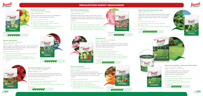 SPECJALISTYCZNE NAWOZY GRANULOWANE Florovit pod winorośl Florovit do rododendronów Florovit przeciwko brązowieniu igieł N : P : K - 15,0 : 10,0 : 20,5 + mikroelementy N : P : K - 12,0 : 8,0 : 15,0 + mikroelementy Dostępny w opakowaniu 1 i 3 kg Dostępny w opakowaniu 1 kg Dostępny w opakowaniu 1 i 3 kg Chociaż winorośl można uprawiać niemal na każdej glebie, to jednak roślina ta wyraźnie reaguje na nawożenie. Rododendrony (różaneczniki i azalie) to rośliny, które muszą mieć stanowisko o kwaśnym podłożu. Dzięki zastosowaniu Florovitu do rododendronów odczyn gleby osiągnie poziom wymagany przez rośliny z tej grupy. Korzyści ze stosowania nawozu: poprawia plonowanie i smak owoców, wpływa na obniżenie odczynu gleby, co sprzyja dostępności mikroelementów, przydatny zarówno do przygotowania stanowiska pod winorośl, jak i do nawożenia pogłównego. Bardzo często powodem przebarwień igieł jest niedobór magnezu. Problem ten można łatwo rozwiązać, stosując Florovit przeciwko brązowieniu igieł, zawierający magnez w łatwo przyswajalnej formie. Korzyści ze stosowania nawozu: Korzyści ze stosowania nawozu: systematyczne stosowanie nawozu zapobiega brązowieniu igieł, po rozpuszczeniu można stosować dolistnie (doigłowo). wpływa na intensywne wybarwienie liści i kwiatów, wysoka zawartość potasu zwiększa odporność na wymarzanie, utrzymuje korzystny odczyn gleby i jej niskie zasolenie, można stosować również do: wrzosów, wrzośców i hortensji. Termin stosowania: Termin stosowan wan nia: n ia: Term rm min m in stosowania: Florovit do róż N : P : K - 15,2 : 12,0 : 15,3 + mikroelementy Florovit pod borówki Dostępny w opakowaniu 1 i 3 kg Dos N : P : K - 9,5 : 5,0 : 12,2 + mikroelementy Różże i inne rośliny kwitnące, aby pięknie kwitły, muszą być zasilane naw wozem o zwiększonej zawartości fosforu, ponieważ to właśnie ten pierwiastek reguluje procesy kwitnienia. Dostępny w opakowaniu 1 i 3 kg Borówki są roślinami wymagającymi stanowiska o niskim (ok. 3,8-4,8 pH) odczynie podłoża. Zbyt wysoki odczyn wpływa na małe przyrosty oraz przedwczesne żółknięcie i opadanie liści. Korzyści ze stosowania nawozu: Ko pobudza wybijanie pędów bocznych oraz zapewnia intensywny wzrost, wpływa na piękne wybarwienie liści i kwiatów, można stosować również do: dalii, piwonii, mieczyków, ostróżek, lilii, tulipanów, narcyzów, aksamitek i szałwi. Korzyści ze stosowania nawozu: posiada zdolność zakwaszania gleby, co wyraźnie wpływa na wzrost i owocowanie roślin, zapobiega chlorozie liści w okresie wegetacji roślin, można stosować również do: rododendronów, wrzosów i iglaków. Termin T i stosowania: t i Term min stosowania: Florovit F lorovit do tra trawników o dużej za zawartości żelaza Florovit do truskawek i poziomek N : P : K - 15,0 : 10,0 : 20,5 + mikroelementy Dostępny w opakowaniu 1 i 3 kg Florovit uniwersalny N : P : K - 17,5 : 5,2 : 9,0 + 4,0 żelaza N : P : K - 11,4 : 9,2 : 16,8 + mikroelementy Dostępny w opakowaniu 1, 3, 5, 8, 10 i 25 kg Dostępny w opakowaniu 1 i 5 kg Pomimo że truskawki uprawia się w jednym miejscu przez trzy lata, to nie wytwarzają one zbyt silnego systemu korzeniowego. Z tego powodu n nawożenie odgrywa ważną rolę plonotwórczą. n Florovit uniwersalny może być stosowany wczesną wiosną do przygotowania gleby przed siewem lub sadzeniem. Doskonale nadaje się do pogłównego zasilania warzyw, krzewów, drzew i kwiatów. Korzyści ze stosowania nawozu: Korzyści ze stosowania nawozu: zapobiega żelazowej i magnezowej chlorozie liści, poprawia plonowanie i smak owoców, można stosować również do: malin, porzeczek, agrestu i aronii. Termin stosowania: zapewnia równomierny wzrost i rozwój roślin oraz poprawia kwitnienie i owocowanie, zwiększa odporność roślin na wymarzanie, zawiera pełny zestaw składników odżywczych oraz dolomit, dzięki czemu ma działanie lekko odkwaszające. Z Zwiększona zawartość żelaza w tym nawozie tworzy warunki niekorzystne dla wzrostu mchu, przez co w sttopniowo zostaje on wyparty przez trawę. Korzyści ze stosowania nawozu: K pobudza krzewienie i zwiększa zwartość darni, zapobiega wzrostowi mchu, zapewnia soczystą, zieloną barwę trawnika. Termin stosowania: Te Termin stosowania: N : P : K - Azot : Fosfor : Potas SPECJALISTYCZNE NAWOZY GRANULOWANE Będziesz mieć powód do dumy ... EKSPOZYCJA W SKLEPIE Florovit do iglaków N : P : K - 8,6 : 9,0 : 23,5 + mikroelementy Dostępny w opakowaniu 1, 3, 8, 10 i 25 kg Nawozy Florovit - Systematyczne stosowanie nawozu zapewnia prawidłowy i intensywny wzrost roślin iglastych. Dobrze odżywione rośliny lepiej znoszą zimę i wyglądają ładnie już od wczesnej wiosny. dostępne w sklepach i centrach ogrodniczych Korzyści ze stosowania nawozu: SPECJALISTYCZNE ECJALISTYCZNE NAWOZY NAWOZ GRANULOWANE Z MIKROELEMENTAMI na terenie całego zapewnia intensywny wzrost i wybarwienie roślin, zmniejsza przebarwienie igieł w okresie zimowym, można stosować również do: forsycji, brzóz, klonów, orzechów włoskich i laskowych. kraju. Nawozy Florovit dostosowane są do indywidualnych potrzeb roślin. Termin stosowania: Coko olwiek uprawiasz, znajdziesz JESIENNE NAWOZY WOZY GRANULOWA GRANULOWANE Jesienią iglaki potrzebują dużo potasu, który chroni je przed wymarzaniem. rzaniem. Zwiększona dawka potasu i żelaza sprawia, że trawniki są bardziej odporne na choroby, zaś odpowiednio nawożone byliny będą szybciej rosły na wiosnę. odp o powiedni Florovit, by Twoje rośliny pięknie i zdrowo rosły! Florovit jesienny zapewnia roślinom: większą odporność na choroby i wymarzanie, ładny wygląd przez cały okres wegetacji, szybszy wzrost w okresie wiosennym. Florovit do iglaków jesienny N : P : K - 5,0 : 10,0 : 34 4,0 + 3,0 MgO Term min stosowania: N : P : K - 4,0 : 12,2 : 26,0 + mikroelementy Termin stosowania: Florovit do trawnków jesienny N : P : K - 4,4 : 5,2 : 2 2