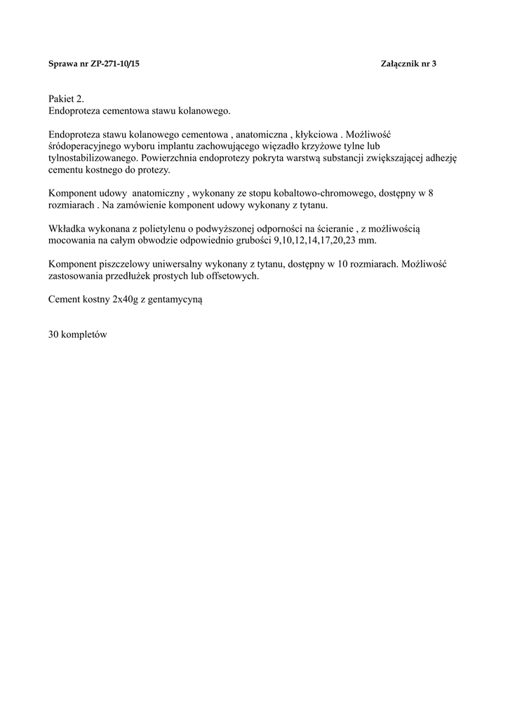 Sprawa nr ZP-271-10/15 Załącznik nr 3 Pakiet 2. Endoproteza cementowa stawu kolanowego. Endoproteza stawu kolanowego cementowa , anatomiczna , kłykciowa . Możliwość śródoperacyjnego wyboru implantu zachowującego więzadło krzyżowe tylne lub tylnostabilizowanego. Powierzchnia endoprotezy pokryta warstwą substancji zwiększającej adhezję cementu kostnego do protezy. Komponent udowy anatomiczny , wykonany ze stopu kobaltowo-chromowego, dostępny w 8 rozmiarach . Na zamówienie komponent udowy wykonany z tytanu. Wkładka wykonana z polietylenu o podwyższonej odporności na ścieranie , z możliwością mocowania na całym obwodzie odpowiednio grubości 9,10,12,14,17,20,23 mm. Komponent piszczelowy uniwersalny wykonany z tytanu, dostępny w 10 rozmiarach. Możliwość zastosowania przedłużek prostych lub offsetowych. Cement kostny 2x40g z gentamycyną 30 kompletów