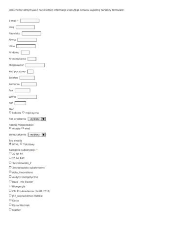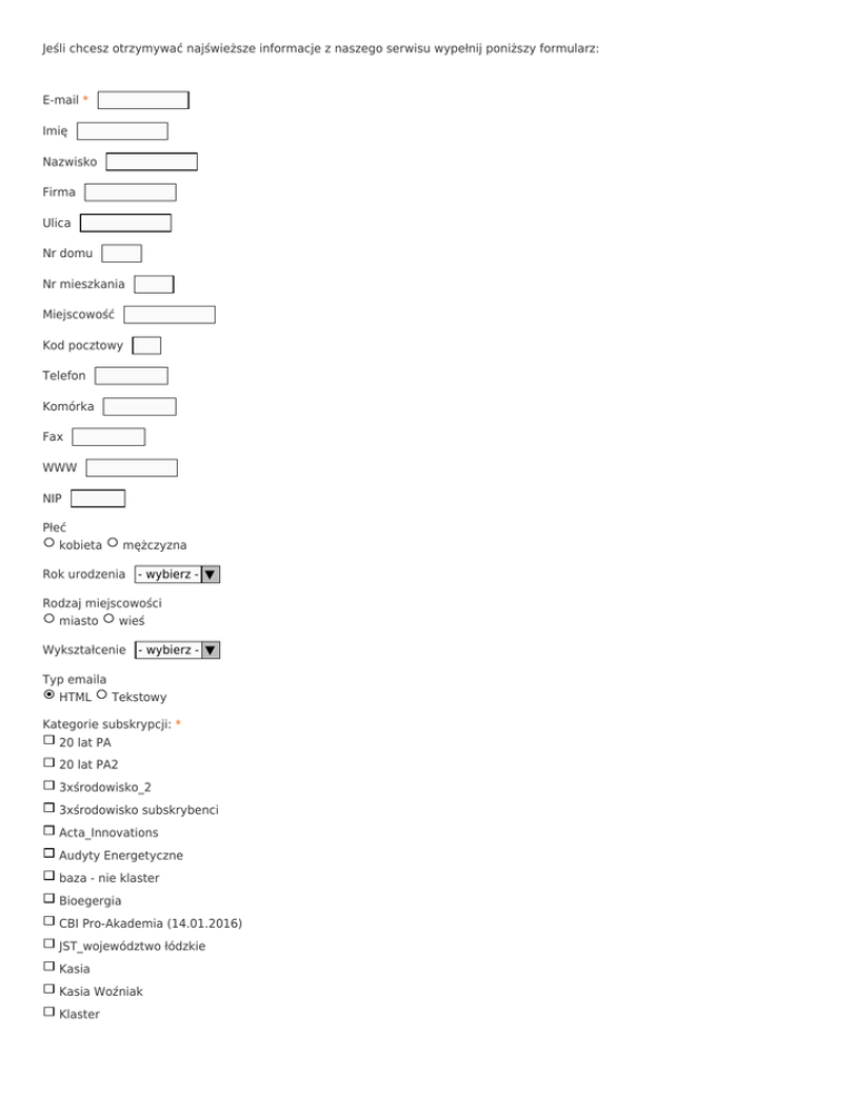 Jeśli chcesz otrzymywać najświeższe informacje z naszego serwisu wypełnij poniższy formularz: E-mail * Imię Nazwisko Firma Ulica Nr domu Nr mieszkania Miejscowość Kod pocztowy Telefon Komórka Fax WWW NIP Płeć kobieta mężczyzna Rok urodzenia - wybierz - ▼ Rodzaj miejscowości miasto wieś Wykształcenie - wybierz - ▼ Typ emaila HTML Tekstowy Kategorie subskrypcji: * 20 lat PA 20 lat PA2 3xśrodowisko_2 3xśrodowisko subskrybenci Acta_Innovations Audyty Energetyczne baza - nie klaster Bioegergia CBI Pro-Akademia (14.01.2016) JST_województwo łódzkie Kasia Kasia Woźniak Klaster Klaster Kluczowy Konstantynów Leader School Media Nauka odpady na pellet podziękowanie za 20-lecie Proakademia producenci kotłów środowisko3 targi Tekstylia test wigilia wszyscy XXII Forum - producenci pelletu Zaległe * Wyrażam zgodę na przetwarzanie moich danych osobowych, zgodnie z treścią ustawy z dn. 29 sierpnia 1997 r. o ochronie danych osobowych (Dz. U. 2002 r. Nr 101 poz. 926, z późn. zm.) Zapisz * - pola wymagane Strona CBI Pro-Akademia używa ciasteczek (cookies), dzięki którym nasz serwis może działać lepiej. Zobacz