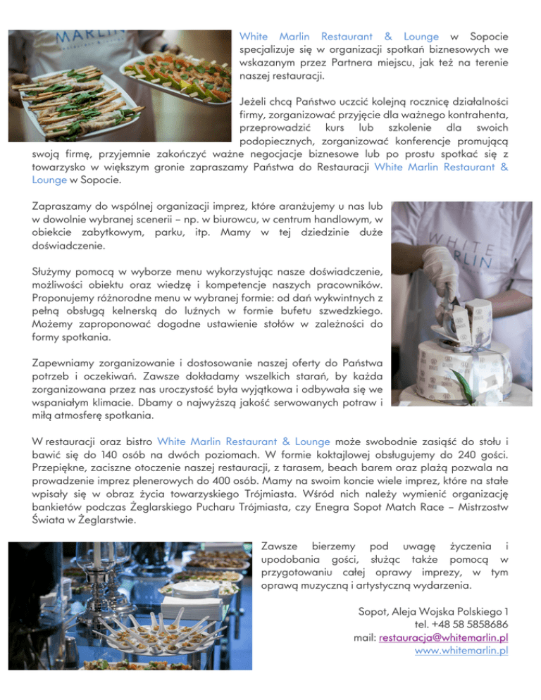 White Marlin Restaurant & Lounge w Sopocie specjalizuje się w organizacji spotkań biznesowych we wskazanym przez Partnera miejscu, jak też na terenie naszej restauracji. Jeżeli chcą Państwo uczcić kolejną rocznicę działalności firmy, zorganizować przyjęcie dla ważnego kontrahenta, przeprowadzić kurs lub szkolenie dla swoich podopiecznych, zorganizować konferencje promującą swoją firmę, przyjemnie zakończyć ważne negocjacje biznesowe lub po prostu spotkać się z towarzysko w większym gronie zapraszamy Państwa do Restauracji White Marlin Restaurant & Lounge w Sopocie. Zapraszamy do wspólnej organizacji imprez, które aranżujemy u nas lub w dowolnie wybranej scenerii – np. w biurowcu, w centrum handlowym, w obiekcie zabytkowym, parku, itp. Mamy w tej dziedzinie duże doświadczenie. Służymy pomocą w wyborze menu wykorzystując nasze doświadczenie, możliwości obiektu oraz wiedzę i kompetencje naszych pracowników. Proponujemy różnorodne menu w wybranej formie: od dań wykwintnych z pełną obsługą kelnerską do luźnych w formie bufetu szwedzkiego. Możemy zaproponować dogodne ustawienie stołów w zależności do formy spotkania. Zapewniamy zorganizowanie i dostosowanie naszej oferty do Państwa potrzeb i oczekiwań. Zawsze dokładamy wszelkich starań, by każda zorganizowana przez nas uroczystość była wyjątkowa i odbywała się we wspaniałym klimacie. Dbamy o najwyższą jakość serwowanych potraw i miłą atmosferę spotkania. W restauracji oraz bistro White Marlin Restaurant & Lounge może swobodnie zasiąść do stołu i bawić się do 140 osób na dwóch poziomach. W formie koktajlowej obsługujemy do 240 gości. Przepiękne, zaciszne otoczenie naszej restauracji, z tarasem, beach barem oraz plażą pozwala na prowadzenie imprez plenerowych do 400 osób. Mamy na swoim koncie wiele imprez, które na stałe wpisały się w obraz życia towarzyskiego Trójmiasta. Wśród nich należy wymienić organizację bankietów podczas Żeglarskiego Pucharu Trójmiasta, czy Enegra Sopot Match Race – Mistrzostw Świata w Żeglarstwie. Zawsze bierzemy pod uwagę życzenia i upodobania gości, służąc także pomocą w przygotowaniu całej oprawy imprezy, w tym oprawą muzyczną i artystyczną wydarzenia. Sopot, Aleja Wojska Polskiego 1 tel. +48 58 5858686 mail: [email protected] www.whitemarlin.pl