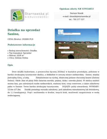 Opiekun oferty NR ST914851 Dariusz Stanik e-mail: [email protected] tel.: 795 577 537 Działka na sprzedaż Sasino, CENA (Brutto): 202600 PLN Podstawowe informacje ● ● ● ● Rodzaj nieruchomości: Działka Typ transakcji: Sprzedaż Metraż: 2026 m2 Ulica: Zielona Dolina Opis Dwie działki budowlane, o powierzchni łącznej 2026m2 w kształcie prostokąta, położone w bardzo atrakcyjnej turystycznie okolicy, a dokładnie w uroczej wiosce nadmorskiej - Sasino, między Jastrzębią Górą, a Łebą. Zlokalizowane na suchej, słonecznej polanie otoczonej lasami (Zielona Dolina). Około 2km od plaży Stilo (latarnia morska, piękna, dzika i szeroka plaża). W okolicy znaleźć można lasy, pas zalesionych wydm nadmorskich, stadniny koni, trasy rowerowe, a także zabytkowy pałac w Sasinie. Teren bardzo atrakcyjny turystycznie; 53,6m x37,8m. DOJAZD: polny utwardzony. WYMIARY: Działki posiadają warunki zabudowy, pod zabudowę mieszkaniową lub letniskową, do 1,5 kondygnacji. Prąd i multimedia w drodze, innych brak, możliwość zaopatrzenia w wodę wodociągową.