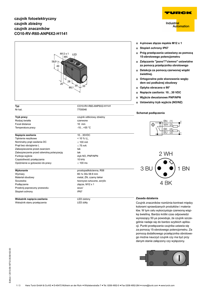 czujnik fotoelektryczny czujnik zbieżny czujnik znaczników CO10-RV-R60-ANP6X2-H1141 ■ 4-pinowe złącze męskie M12 x 1 ■ Stopień ochrony IP67 ■ ■ ■ ■ Typ Nr kat. CO10-RV-R60-ANP6X2-H1141 7700046 Tryb pracy Rodzaj światła Focal distance Temperatura pracy czujnik odbiciowy zbieżny czerwone 10 mm -10…+55 °C Napięcie zasilania Tętnienie resztkowe Nominalny prąd zasilania DC Prąd bez obciążenia I0 Zabezpieczenie przed zwarciem Zabezpieczenie przed odwrotną polaryzacją Funkcja wyjścia Częstotliwość przełączania Opóźnienie w gotowości do pracy 10…30VDC < 10 % Uss ð 100 mA ð 75 mA tak tak styk NO, PNP/NPN 10 kHz ð 100 ms Wykonanie Wymiary Materiał obudowy Soczewka Podłączenie Przekrój poprzeczny przewodu: prostopadłościenna, R58 80.1x 30x 58.9 mm metal, ZN, czarny lakier tworzywo sztuczne, acrylic złącze, M12 x 1 Stopień ochrony 4mm IP67 Wskaźnik napięcia zasilania Wskaźnik stanu przełączenia LED zielony LED żółty Próg przełączania ustawiany za pomocą 15-obrotowego potencjometru Załączanie "jasno"/"ciemno" ustawialne za pomocą przełącznika obrotowego Detekcja za pomocą czerwonej wiązki świetlnej. Ortogonalne pole skanowania względem osi podłużnej obudowy ■ Optyka obracana o 90° ■ Napięcie zasilania: 10…30 VDC ■ Wyjście dwustanowe PNP/NPN ■ Ustawialny tryb wyjścia (NO/NZ) Schemat podłączenia 2 Zasada działania Edition • 2013-09-18T12:35:56+02:00 Czujnik znaczników rozróżnia kontrast między kolorami sprawdzanych produktów i materiałów. W tym celu wykorzystuje czerwoną wiązkę świetlną. Bardzo krótki czas odpowiedzi wynoszący 50 µs powoduje, że czujnik szczególnie nadaje się do bardzo szybkich aplikacji. Punkt przełączania czujnika ustawia się za pomocą 15-obrotowego potencjometru. Za pomocą dodatkowego przełącznika obrotowego można nauczyć czujnik czy ma być przy danym stanie załączony czy wyłączony. 1/3 Hans Turck GmbH & Co.KG ñ D-45472 Mülheim an der Ruhr ñ Witzlebenstraße 7 ñ Tel. 0208 4952-0 ñ Fax 0208 4952-264 ñ [email protected] ñ www.turck.com czujnik fotoelektryczny czujnik zbieżny czujnik znaczników CO10-RV-R60-ANP6X2-H1141 Akcesoria montażowe Typ Nr kat. TMBR60A 7700404 Wymiary Uchwyt montażowy, stal nierdzewna, dla CO10-…-R60ANP… TMBR60F 7700405 Uchwyt montażowy, stal nierdzewna, dla CO10-…-R60ANP… TMBR60RA 7700406 Uchwyt montażowy, stal nierdzewna, dla CO10-…-R60ANP… TMBR60S 7700407 Uchwyt montażowy, stal nierdzewna, dla CO10-…-R60ANP… Akcesoria - okablowanie Typ Nr kat. RKC4.4T-2/TEL 6625013 Wymiary Przewód podłączeniowy, złącze żeńskie M12, proste, 4-pinowe, długość: 2 m; materiał otuliny: PVC, czarny; certyfikat cULus; dostępne również inne długości kabli i typy otuliny, Edition • 2013-09-18T12:35:56+02:00 patrz www.turck.com 2/3 Hans Turck GmbH & Co.KG ñ D-45472 Mülheim an der Ruhr ñ Witzlebenstraße 7 ñ Tel. 0208 4952-0 ñ Fax 0208 4952-264 ñ [email protected] ñ www.turck.com czujnik fotoelektryczny czujnik zbieżny czujnik znaczników CO10-RV-R60-ANP6X2-H1141 Akcesoria - okablowanie Typ Nr kat. WKC4.4T-2/TEL 6625025 Wymiary Przewód podłączeniowy, złącze żeńskie M12, kątowe, 4-pinowe, długość: 2 m; materiał otuliny: PVC, czarny; certyfikat cULus; dostępne również inne długości kabli i typy otuliny, Edition • 2013-09-18T12:35:56+02:00 patrz www.turck.com 3/3 Hans Turck GmbH & Co.KG ñ D-45472 Mülheim an der Ruhr ñ Witzlebenstraße 7 ñ Tel. 0208 4952-0 ñ Fax 0208 4952-264 ñ [email protected] ñ www.turck.com