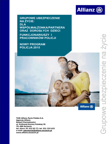 GRUPOWE UBEZPIECZENIE NA ŻYCIE: DLA WSPÓŁMAŁŻONKA/PARTNERA ORAZ DOROSŁYCH DZIECI Grupowe ubezpieczenie na życie FUNKCJONARIUSZY I PRACOWNIKÓW POLICJI NOWY PROGRAM POLICJA 2015 TUiR Allianz Życie Polska S.A. Agencja Allianz Robert Pieciukiewicz ul. Królowej Korony Polskiej 26 70–486 Szczecin tel. biuro: 91 422 03 77; tel. 531 333 633 e-mail: [email protected] www.allianz.szczecin.pl 1 Ubezpieczenie dla Współmałżonka/Partnera/Dorosłych Dzieci Funkcjonariuszy i Pracowników Policji woj. zachodniopomorskiego NOWY PROGRAM POLICJA 2015 Świadczenia* Wariant (39,90 zł) 1 Zgon w następstwie wypadku komunikacyjnego w pracy 2 Zgon w wypadku komunikacyjnym w ruchu lądowym jako kierujący, pasażer lub pieszy 90 000,00 zł 3 Zgon w wypadku komunikacyjnym w ruchu wodnym jako kierujący, pasażer lub pieszy 90 000,00 zł 4 Zgon w wypadku komunikacyjnym w ruchu powietrznym jako kierujący, pasażer lub pieszy 90 000,00 zł 5 Zgon w następstwie wypadku w pracy 90 000,00 zł 6 Zgon w następstwie wypadku 60 000,00 zł 7 Zgon- zawał serca lub udar mózgu 60 000,00 zł 8 Zgon Ubezpieczonego 30 000,00 zł 9 Zgon Współmałżonka/Partnera 10 Zgon Współmałżonka/Partnera 8 000,00 zł 11 Poważne zachorowania Współmałżonka/Partnera 3 000,00 zł 12 Zgon Rodzica 1 200,00 zł 13 Zgon Rodzica Współmałżonka/Partnera 1 200,00 zł 14 Urodzenie się Dziecka 15 Zgon Dziecka 3 200,00 zł 16 Urodzenie się martwego Dziecka 3 200,00 zł 17 Osierocenie Dziecka (wypłacane każdemu dziecku ubezpieczonemu) 3 200,00 zł 18 Poważne zachorowania Dziecka 19 Trwały uszczerbek na zdrowiu z NNW 20 Trwały uszczerbek na zdrowiu 100% 21 Renta miesięczna – 22 Koszty leczenia w wyniku NNW 23 24 25 120 000,00 zł (w ruchu lądowym, powietrznym, wodnym) 16 000,00 zł w następstwie wypadku 800,00 zł 10 000,00 zł za 1% 240,00 zł 24 000,00 zł 300,00 zł niezdolność do samodzielnej egzystencji w wyniku NNW lub choroby (60 m-cy) 700,00 zł Poważne zachorowania Ubezpieczonego (20 jednostek chorobowych) Leczenie Ubezpieczonego w szpitalu w wyniku choroby (min. 4 dni) w Polsce oraz w Unii Europejskiej Leczenie Ubezpieczonego w szpitalu w wyniku choroby (min. 4 dni) w Polsce oraz w UE nieprzerwanie przez 180 dni/za każdy dzień 26 Leczenie Ubezpieczonego w szpitalu w wyniku NNW (min. 1 dzień) 27 Leczenie Ubezpieczonego w szpitalu w wyniku NNW przy pracy 28 Leczenie w szpitalu na OIOM 5 000,00 zł 40,00 zł 80,00 zł 80,00 zł 120,00 zł 80,00 zł C 29 Leczenie operacyjne (kategoria A, B, C) B A Wersja dn. 31.10.2015 900,00 zł 600,00 zł 300,00 zł Świadczenia opiekuńcze (od punktu 30 do 53) realizowane są wyłącznie po uprzednim kontakcie telefonicznym z Allianz Global Assistance tel. (22) 522 25 06 (24 godziny na dobę) Świadczenia* Łączna wysokość limitu na jedno zdarzenie ubezpieczeniowe 30 Rehabilitacja w poradni lub w domu 2 100,00 zł 31 Zakup lub wypożyczenie sprzętu rehabilitacyjnego 1 500,00 zł 32 Transport sprzętu rehabilitacyjnego 1 500,00 zł 33 Transport medyczny z osobą bliską do placówki medycznej 3 000,00 zł 34 Transport medyczny z osobą bliską z placówki medycznej do miejsca zamieszkania 3 000,00 zł 35 Transport medyczny z osobą bliską pomiędzy placówkami medycznymi 1 500,00 zł 36 Wizyty lekarza po nieszczęśliwym wypadku 1 500,00 zł 37 Wizyty pielęgniarki po nieszczęśliwym wypadku 1 500,00 zł 38 Pobyt Rodzica w szpitalu w razie hospitalizacji Dziecka 39 Opieka Pielęgniarska -po hospitalizacji 40 Pomoc domowa - po hospitalizacji powyżej 7dni 900,00 zł 41 Dostarczenie leków zapisanych przez lekarza do miejsca zamieszkania 300,00 zł 42 Opieka nad Dziećmi i Osobami niesamodzielnymi hospitalizacja pow. 3 dni 43 Przewóz Dzieci do miejsca zamieszkania osoby wyznaczonej i ich powrót 44 Przejazd osoby wyznaczonej do opieki nad Dziećmi do miejsca zamieszkania 45 Opieka nad Dziećmi i Osobami niesamodzielnymi w razie ich zachorowania 400,00 zł 46 Prywatne lekcje dla Dziecka zwolnienie lekarskie powyżej 7 dni 600,00 zł 47 Pomoc położnej lub pielęgniarki w opiece nad nowo narodzonym Dzieckiem 48 Wizyty u psychologa w trudnych sytuacjach losowych 1 500,00 zł 49 Pomoc domowa i Pielęgniarska (hospitalizacja powyżej 5 dni) dla Rodziców i Teściów 1 000,00 zł 50 Transport Rodzica/Teścia na wizytę kontrolną po szpitalu raz w roku 51 Osobisty asystent dla Rodzica /Teścia podczas transportu medycznego 600,00 zł 52 Infolinia Baby Assistance tak 53 Zdrowotne usługi informacyjne – lekarz konsultant tak 1 500,00 zł 4 500,00 zł powyżej 5 dni (hospitalizacja pow. 3 dni) (hospitalizacja pow. 3 dni) 1 350,00 zł koszt biletu I kl. koszt biletu I kl. 300,00 zł tak Indywidualna kontynuacja ubezpieczenia Składka miesięczna 39,90 zł * Podstawą ochrony i wypłaty ww. świadczeń oraz wymienionych definicji są: OWU Grupowego ubezpieczenia na życie „Allianz Rodzina” GZ11 zatwierdzone uchwałą Zarządu TU Allianz Życie Polska S.A. nr 6/2013 z dnia 14 lutego 2013 roku. Uwaga karencje: 1. 6m-cy na zgon Rodzica/Teścia, Współmałżonka, Dziecka, osierocenie Dziecka, zgon zawał/udar, 2. 3 m-ce na poważne zachorowanie Ubezpieczonego, Współmałżonka, Dziecka, 3. 1m-ąc na leczenie szpitalne, 4. 6 miesięcy na leczenie operacyjne, 5. 9 m-cy na urodzenie dziecka, 6. karencja 12/24, która oznacza, że w odniesieniu do Ubezpieczonego Towarzystwo stosuje 12 miesięczną karencję za zdarzenia będące następstwem choroby Ubezpieczonego, której objawy, Wersja dn. 31.10.2015 diagnoza lub leczenie miały miejsce w ciągu 24 miesięcy przed przystąpieniem do ubezpieczenia. Dodatkowo w przypadku gdy przystąpienie do ubezpieczenia będzie miało miejsce po upływie 3 miesięcy od daty zatrudnienia pracownika Policji wówczas obowiązuje jeszcze 6 miesięczna karencja na wszystkie świadczenia nie będące następstwem wypadku. Ubezpieczenie działa 24h na dobę na terenie całego świata w pracy i w życiu prywatnym (za wyjątkiem pkt. od 30 do 