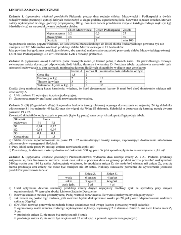 LINIOWE ZADANIA DECYZYJNE Zadanie 1. (optymalna wielkość produkcji) Piekarnia piecze dwa rodzaje chleba: Mazowiecki i Podkarpacki z dwóch rodzajów mąki: pszennej i Ŝytniej, których moŜe zuŜyć w ciągu godziny ograniczoną ilość. UŜywane są takŜe droŜdŜe, których naleŜy wykorzystać w ciągu godziny przynajmniej 100 g. PoniŜsza tabela przedstawia zuŜycie kaŜdego rodzaju mąki (w kg) i droŜdŜy (w g) na wyprodukowanie bochenka chleba: Chleb Mazowiecki Chleb Podkarpacki Zasób Mąka pszenna 0,2 0,3 27 Mąka Ŝytnia 0,5 0,2 40 DroŜdŜe 2 5 min 100 Na podstawie analizy popytu wiadomo, Ŝe ilość chleba Mazowieckiego do ilości chleba Podkarpackiego powinna być nie mniejsza niŜ 3/7. Minimalna wielkość produkcji chleba Mazowieckiego to 15 bochenków. Jaka powinna być godzinna produkcja chlebów, aby uzyskać maksymalny przychód przy cenie chleba Mazowieckiego równej 1,5 zł oraz Podkarpackiego 3,5 zł? UłóŜ model LZD i rozwiąŜ graficznie. Zadanie 2. (optymalna dieta) Hodowca psów rasowych moŜe je karmić jedną z dwóch karm. Dla prawidłowego rozwoju zwierzętom naleŜy dostarczyć odpowiednią ilość białka, tłuszczu i witaminy D. PoniŜsza tabela przedstawia zawartość tych substancji odŜywczych w obu karmach, minimalną dzienną ilość tych składników w diecie oraz cenę karm: karma A karma B minimalna ilość składnika odŜyw Cena 1kg 1,5 2 Białko (g w kg) 2 1 12 Tłuszcz (g w kg) 3 0 6 Witamina D (jedn w kg) 5 5 35 Znajdź dietę minimalizują koszt karmienia, wiedząc, Ŝe ilość dostarczanej karmy B musi być choć dwukrotnie większa niŜ ilość karmy A a) UłóŜ zadanie PL opisujące tą sytuację decyzyjną. b) Za pomocą metody graficznej znajdź rozwiązanie optymalne. Zadanie 3. (D) (Zagadnienie diety) Racjonalna hodowla trzody chlewnej wymaga dostarczenia co najmniej 24 kg składnika odŜywczego S1 i co najmniej 49 kg S2 oraz nie więcej niŜ 70 kg S3 dziennie. Składniki te dostarcza się karmiąc trzodę dwoma paszami: P1 i P2. Zawartość składników odŜywczych w paszach (kg/w kg paszy) oraz ceny ich zakupu (zł/kg) podaje tabela. Składnik Pasza odŜywczy P1 P2 S1 0,04 0,12 S2 0,14 0,07 S3 0,1 0,1 Cena zbytu 2 1,5 a) Ustalić dzienne zapotrzebowanie na pasze P1 i P2 minimalizujące koszty zakupu, zapewniające dostarczenie składników odŜywczych w wymaganych ilościach. b) Przy jakiej cenie paszy P1 nastąpi zmiana rozwiązania z pkt. a)? c) Powiedzmy, Ŝe dziennie moŜemy dostarczać dokładnie 500 kg pasz. W jaki sposób wpłynie to na rozwiązanie z pkt. a)? Zadanie 4. (optymalna wielkość produkcji) Przedsiębiorstwo wytwarza dwa rodzaje zniczy Z1 i Z2. Podczas produkcji zuŜywane są dwa limitowane surowce: wosk oraz szkło – podczas dnia na gotowy produkt moŜna przerobić maksymalnie 240 kg wosku oraz 180 kg szkła. Jednocześnie wiadomo, Ŝe produkcja znicza Z2 nie moŜe być większa niŜ znicza Z1, oraz Ŝe łączna produkcja obu zniczy nie moŜe być mniejsza niŜ 20 sztuk. Nakłady surowców potrzebne do wytworzenia jednostki produktów przedstawia tabela: Znicz Z1 Znicz Z2 wosk 6 kg/szt 4 kg/szt szkło 3 kg/szt 6 kg/szt zysk jedn. 3 zł 4 zł a) Ustal optymalne dzienne rozmiary produkcji zniczy dające najwyŜszy moŜliwy zysk ze sprzedaŜy przy danych ograniczeniach. W tym celu zbuduj Liniowe Zadanie Decyzyjne. b) RozwiąŜ zadanie metodą geometryczną. Podaj wartość rozwiązania. Ile wynosi maksymalny osiągalny zysk? c) Jak zmieni się postać tego zadania, jeśli moŜliwe będzie dokupowanie wosku po 20 gr/kg oraz odsprzedawanie nadmiaru szkła za 30gr/kg? d) (D) UłóŜ i rozwiąŜ ponownie to zadanie biorąc dodatkowo pod uwagę (wobec pierwotnej wersji zadania): ograniczony zasób sznurka, z którego wykonywane są knoty, wynoszący 2 m dziennie. Znicz Z1 ma 4 cm knot a znicz Z2 5 cm. produkcja znicza Z2 nie moŜe być mniejsza niŜ 5 sztuk produkcja znicza Z1 nie moŜe być większa niŜ 25 sztuk (np. z powodu ograniczonego popytu)