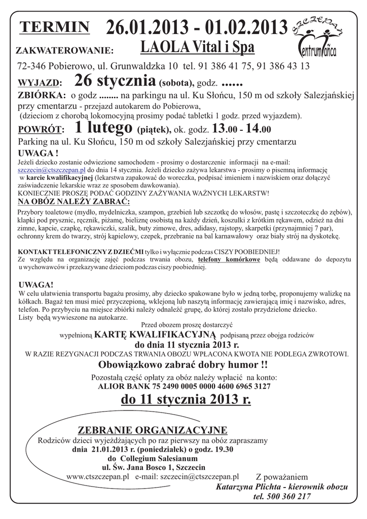 TERMIN 26.01.2013 - 01.02.2013 LAOLA Vital i Spa ZAKWATEROWANIE: 72-346 Pobierowo, ul. Grunwaldzka 10 tel. 91 386 41 75, 91 386 43 13 26 stycznia WYJAZD: (sobota), godz. ...... ZBIÓRKA: o godz ........ na parkingu na ul. Ku Słońcu, 150 m od szkoły Salezjańskiej przy cmentarzu - przejazd autokarem do Pobierowa, (dzieciom z chorobą lokomocyjną prosimy podać tabletki 1 godz. przed wyjazdem). 1 lutego POWRÓT: (piątek), ok. godz. 13.00 - 14.00 Parking na ul. Ku Słońcu, 150 m od szkoły Salezjańskiej przy cmentarzu UWAGA ! Jeżeli dziecko zostanie odwiezione samochodem - prosimy o dostarczenie informacji na e-mail: [email protected] do dnia 14 stycznia. Jeżeli dziecko zażywa lekarstwa - prosimy o pisemną informację w karcie kwalifikacyjnej (lekarstwa zapakować do woreczka, podpisać imieniem i nazwiskiem oraz dołączyć zaświadczenie lekarskie wraz ze sposobem dawkowania). KONIECZNIE PROSZĘ PODAĆ GODZINY ZAŻYWANIA WAŻNYCH LEKARSTW! NA OBÓZ NALEŻY ZABRAĆ: Przybory toaletowe (mydło, mydelniczka, szampon, grzebień lub szczotkę do włosów, pastę i szczoteczkę do zębów), klapki pod prysznic, ręcznik, piżamę, bieliznę osobistą na każdy dzień, koszulki z krótkim rękawem, odzież na dni zimne, kapcie, czapkę, rękawiczki, szalik, buty zimowe, dres, adidasy, rajstopy, skarpetki (przynajmniej 7 par), ochronny krem do twarzy, strój kąpielowy, czepek, przebranie na bal karnawałowy oraz biały strój na dyskotekę. KONTAKT TELEFONICZNY Z DZIEĆMI tylko i wyłącznie podczas CISZY POOBIEDNIEJ! Ze względu na organizację zajęć podczas trwania obozu, telefony komórkowe będą oddawane do depozytu u wychowawców i przekazywane dzieciom podczas ciszy poobiedniej. UWAGA! W celu ułatwienia transportu bagażu prosimy, aby dziecko spakowane było w jedną torbę, proponujemy walizkę na kółkach. Bagaż ten musi mieć przyczepioną, wklejoną lub naszytą informację zawierającą imię i nazwisko, adres, telefon. Po przybyciu na miejsce zbiórki należy odnaleźć grupę, do której zostało przydzielone dziecko. Listy będą wywieszone na autokarze. Przed obozem proszę dostarczyć wypełnioną KARTĘ KWALIFIKACYJNĄ podpisaną przez obojga rodziców do dnia 11 stycznia 2013 r. W RAZIE REZYGNACJI PODCZAS TRWANIA OBOZU WPŁACONA KWOTA NIE PODLEGA ZWROTOWI. Obowiązkowo zabrać dobry humor !! Pozostałą część opłaty za obóz należy wpłacić na konto: ALIOR BANK 75 2490 0005 0000 4600 6965 3127 do 11 stycznia 2013 r. ZEBRANIE ORGANIZACYJNE Rodziców dzieci wyjeżdżających po raz pierwszy na obóz zapraszamy dnia 21.01.2013 r. (poniedziałek) o godz. 19.30 do Collegium Salesianum ul. Św. Jana Bosco 1, Szczecin www.ctszczepan.pl e-mail: [email protected] Z poważaniem Katarzyna Plichta - kierownik obozu tel. 500 360 217