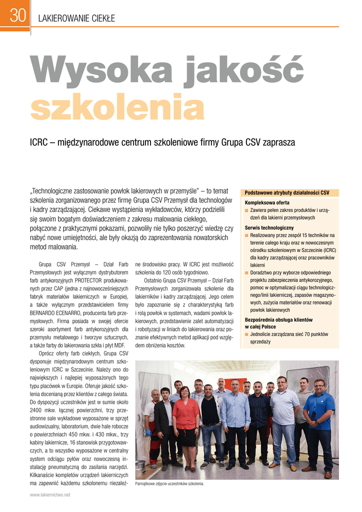 30 lakierowanie ciekłe Wysoka jakość szkolenia ICRC – międzynarodowe centrum szkoleniowe firmy Grupa CSV zaprasza „Technologiczne zastosowanie powłok lakierowych w przemyśle” – to temat szkolenia zorganizowanego przez firmę Grupa CSV Przemysł dla technologów i kadry zarządzającej. Ciekawe wystąpienia wykładowców, którzy podzielili się swoim bogatym doświadczeniem z zakresu malowania ciekłego, połączone z praktycznymi pokazami, pozwoliły nie tylko poszerzyć wiedzę czy nabyć nowe umiejętności, ale były okazją do zaprezentowania nowatorskich metod malowania. Grupa CSV Przemysł – Dział Farb Przemysłowych jest wyłącznym dystrybutorem farb antykorozyjnych PROTECTOR produkowanych przez CAP (jedna z najnowocześniejszych fabryk materiałów lakierniczych w Europie), a także wyłącznym przedstawicielem firmy BERNARDO ECENARRO, producenta farb przemysłowych. Firma posiada w swojej ofercie szeroki asortyment farb antykorozyjnych dla przemysłu metalowego i tworzyw sztucznych, a także farby do lakierowania szkła i płyt MDF. Oprócz oferty farb ciekłych, Grupa CSV dysponuje międzynarodowym centrum szkoleniowym ICRC w Szczecinie. Należy ono do największych i najlepiej wyposażonych tego typu placówek w Europie. Oferuje jakość szkolenia docenianą przez klientów z całego świata. Do dyspozycji uczestników jest w sumie około 2400 mkw. łącznej powierzchni, trzy przestronne sale wykładowe wyposażone w sprzęt audiowizualny, laboratorium, dwie hale robocze o powierzchniach 450 mkw. i 430 mkw., trzy kabiny lakiernicze, 16 stanowisk przygotowawczych, a to wszystko wyposażone w centralny system odciągu pyłów oraz nowoczesną instalację pneumatyczną do zasilania narzędzi. Kilkanaście kompletów urządzeń lakierniczych ma zapewnić każdemu szkolonemu niezależwww.lakiernictwo.net ne środowisko pracy. W ICRC jest możliwość szkolenia do 120 osób tygodniowo. Ostatnio Grupa CSV Przemysł – Dział Farb Przemysłowych zorganizowała szkolenie dla lakierników i kadry zarządzającej. Jego celem było zapoznanie się z charakterystyką farb i rolą powłok w systemach, wadami powłok lakierowych, przedstawienie zalet automatyzacji i robotyzacji w liniach do lakierowania oraz poznanie efektywnych metod aplikacji pod względem obniżenia kosztów. Pamiątkowe zdjęcie uczestników szkolenia. Podstawowe atrybuty działalności CSV Kompleksowa oferta Zawiera pełen zakres produktów i urządzeń dla lakierni przemysłowych Serwis technologiczny Realizowany przez zespół 15 techników na terenie całego kraju oraz w nowoczesnym ośrodku szkoleniowym w Szczecinie (ICRC) dla kadry zarządzającej oraz pracowników lakierni Doradztwo przy wyborze odpowiedniego projektu zabezpieczenia antykorozyjnego, pomoc w optymalizacji ciągu technologicznego/linii lakierniczej, zapasów magazynowych, zużycia materiałów oraz renowacji powłok lakierowych Bezpośrednia obsługa klientów w całej Polsce Jednolicie zarządzana sieć 70 punktów sprzedaży lakierowanie ciekłe – Sympozja takie, które możemy zorganizować dla określonej grupy technologów czy też dyrektorów i szefów produkcji, mają na celu doskonalenia umiejętności z zakresu znajomości technicznych dostępnych technologii lakierowania i parametrów powłok lakierowych w określonej branży – wyjaśnia Arkadiusz Jarzyński, szef Działu Farb Przemysłowych. Pierwsze wystąpienia dotyczyły prezentacji Grupy CSV i BERNARDO ECENARRO, powłok lakierowych – charakterystyki farb, produktów i kolorystyki URKI-SYSTEM, specyfiki produktów wodorozcieńczalnych względem rozcieńczalnikowych. Wykłady te poprowadził Arkadiusz Jarzyński z Grupy CSV Przemysł. Uczestnicy mogli m.in. poznać historię hiszpańskiej firmy BERNARDO ECENARRO, która jako producent ciekłych farb przemysłowych, stale wspiera badania i stawia na rozwój swoich produktów, tak aby zaspakajały potrzeby klientów i były dostosowane do rosnących wymagań środowiskowych. Ponadto, można było dowiedzieć się wiele o roli powłok w systemie malarskim, zaletach i wadach ze względu na zawartość substancji stałych, właściwościach i charakterystyce powłok lakierowych. Ciekawy był również wykład poświęcony farbom wodorozcieńczalnym, które stają się coraz bardziej powszechne, choć nadal niektórzy są nieufni jeśli chodzi o ich stosowanie do zabezpieczania konstrukcji eksploatowanych w środowiskach o dużej agresywności korozyjnej, dlatego tak ważne jest poznanie nie tylko ich zalet, ale i ograniczeń, co pozwoli na bardziej świadome podjęcie decyzji o zmianie w technologii lakie- Malowanie przy wykorzystaniu azotu. Z zainteresowaniem wysłuchano wykładów. rowania. W kolejnej części spotkania mowa była o powstawaniu wad aplikacyjnych, podziale wad powłok lakierowych i ich charakterystyce oraz przyczyn ich powstawania i sposobów zapobiegania oraz usuwania. Czytelny podział na wady powstałe podczas transportu i magazynowania, wynikających ze złej jakości farb, z nieprawidłowo dobranych systemów malarskich, czy niewłaściwej aplikacji oraz tych powstałych podczas użytkowania, pozwolił uczestnikom na uporządkowanie wiedzy z tego zakresu. Następnie Piotr Siwek z M.B. Market Ltd., wraz z przedstawicielem włoskiej firmy Pentis, przedstawili nowatorski system aplikacji nitrothermspray. W skrócie, ta nowa metoda malowania natryskowego polega na wykorzystaniu azotu, który zastępuje tradycyjny strumień sprężonego powietrza przez strumień wzbogacony właśnie azotem (do 99,5 proc.). Metoda ta posiada wiele korzyści pod względem oszczędności, wydajności i ochrony pracy. Pozwala na pracę z każdym typem pistoletu natryskowego i każdym rodzajem produktu. O zaletach, które były omawiane, można było przekonać się następnego dnia podczas praktycznego pokazu malowania przy pomocy urządzenia nitrothermspray. Kolejnym wystąpieniem był wykład przedstawiciela Makor Gr