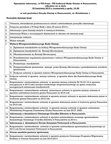 Uprzejmie informuję, że VII Sesja - VII kadencji Rady Gminy w Parzęczewie, odbędzie się w dniu 30 kwietnia 2015 r. (czwartek) o godz. 10.00 w sali posiedzeń Urzędu Gminy w Parzęczewie, ul. Południowa 1. Porządek dzienny Sesji 1. Otwarcie, stwierdzenie prawomocności obrad i zatwierdzenie porządku dziennego. 2. Przyjęcie protokołu z VI Sesji Rady z dnia 26 marca 2015 r. 3. Informacja z prac komisji stałych w miesiącu kwietniu. 4. Informacja Wójta o ważniejszych działaniach w okresie od ostatniej sesji. 5. Interpelacje radnych. 6. Wolne wnioski. 7. Wybory Wiceprzewodniczącego Rady Gminy: 1) Zgłaszanie kandydatów na funkcję Wiceprzewodniczącego Rady Gminy. 2) Zgłaszanie kandydatów do Komisji Skrutacyjnej. 3) Ukonstytuowanie się Komisji Skrutacyjnej. 4) Przedstawienie regulaminu głosowania i wyboru Wiceprzewodniczącego Rady Gminy w Parzęczewie. 5) Prezentacja kandydatów. 6) Przeprowadzenie głosowania tajnego przez Komisję Skrutacyjną i przedstawienie wyników głosowania. 7) Podjęcie uchwały w sprawie wyboru Wiceprzewodniczącego Rady Gminy w Parzęczewie. 8. Podjęcie uchwały w sprawie zmiany uchwały w sprawie diety dla Przewodniczącego Rady Gminy. 9. Rozpatrzenie i zatwierdzenie uchwały w sprawie zmiany uchwały Nr VI/47/15 w sprawie zaciągnięcia w 2015 roku kredytu bankowego długoterminowego na spłatę wcześniej zaciągniętych zobowiązań kredytowych. 10. Rozpatrzenie i zatwierdzenie uchwały zmieniająca uchwałę w sprawie zmiany uchwały w sprawie uchwalenia budżetu gminy Parzęczew na 2015 rok. 11. Rozpatrzenie i zatwierdzenie uchwały w sprawie zmiany uchwały w sprawie dokonania zmian w budżecie gminy Parzęczew na 2015 rok. 12. Rozpatrzenie i zatwierdzenie uchwały w sprawie dokonania zmian w budżecie gminy Parzęczew na 2015 rok. 13. Rozpatrzenie i zatwierdzenie uchwały w sprawie zmiany uchwały w sprawie uchwalenia Wieloletniej Prognozy Finansowej Gminy Parzęczew na lata 2015- 2020. 14. Informacja o działalności Gminnego Ośrodka Zdrowia w Parzęczewie. 15. Rozpatrzenie i zatwierdzenie uchwały w sprawie zatwierdzenia rocznego sprawozdania finansowego Gminnego Ośrodka Zdrowia w Parzęczewie za 2014 r. 16. Informacja o działalności Forum Inicjatyw Twórczych w Parzęczewie. 17. Rozpatrzenie i zatwierdzenie uchwały w sprawie zatwierdzenia sprawozdania finansowego za 2014 rok Forum Inicjatyw Twórczych w Parzęczewie. 18. Ocena zasobów pomocy społecznej. 19. Rozpatrzenie i zatwierdzenie uchwały w sprawie przyjęcia Gminnego Programu Wspierania Rodziny w Gminie Parzęczew na lata 2015-2017. 20. Sprawozdanie z realizacji programu współpracy Gminy Parzęczew z organizacjami pozarządowymi oraz podmiotami wymienionymi w art.3 ust. 3 ustawy z dnia 24 kwietnia 2003 r. o działalności pożytku publicznego i wolontariacie za rok 2014. 21. Rozpatrzenie i zatwierdzenie uchwały w sprawie zatwierdzenia sprawozdania finansowego za 2014 r. Gminnej Biblioteki Publicznej w Parzęczewie. 22. Rozpatrzenie i zatwierdzenie uchwały w sprawie przystąpienia Gminy Parzęczew do Stowarzyszenia pod nazwą Lokalna Grupa Działania „PRYM”. 23. Rozpatrzenie i zatwierdzenie uchwały w sprawie przystąpienia do współpracy z Fundacją Rozwoju Gmin „PRYM” z siedzibą w Parzęczewie przy opracowaniu Lokalnej Strategii Rozwoju Lokalnej Grupy Działania „PRYM” na lata 2015-2022 dla obszaru gmin: Aleksandrów Łódzki, Dalików, Konstantynów Łódzki, Lutomiersk, Parzęczew, Wartkowice i Zgierz. 24. Wolne wnioski i sprawy różne. 25. Zamknięcie Sesji Rady Gminy. PRZEWODNICZĄCY RADY GMINY /-/ WŁADYSŁAW KRAWCZYK Uprzejmie informujemy, że wspólne posiedzenia: Komisji Samorządowej, Komisji Oświaty i Komisji Rolnictwa odbędą się w dniu 28 kwietnia (wtorek) 2015 r. o godz. 10.00 w sali posiedzeń Urzędu Gminy w Parzęczewie. Porządek dzienny komisji 1. 2. Otwarcie, stwierdzenie kworum i zatwierdzenie porządku dziennego. Spotkanie z przedstawicielami kół łowieckich działających na terenie gminy. 3. Informacja Łódzkiego Ośrodka Doradztwa Rolniczego dotycząca dopłat bezpośrednich w rolnictwie i inwestycjach. Informacja o działalności Gminnego Ośrodka Zdrowia w Parzęczewie. Informacja o działalności Forum Inicjatyw Twórczych w Parzęczewie. Rozpatrzenie i zaopiniowanie projektów uchwał: w sprawie wyboru Wiceprzewodniczącego Rady Gminy w Parzęczewie, 1) w sprawie zmiany uchwały w sprawie diety dla Przewodniczącego Rady Gminy, 2) w sprawie zmiany uchwały Nr VI/47/15 w sprawie zaciągnięcia w 2015 roku kredytu 3) bankowego długoterminowego na spłatę wcześniej zaciągniętych zobowiązań kredytowych, zmieniająca uchwałę w sprawie zmiany uchwały w sprawie uchwalenia budżetu gminy 4) Parzęczew na 2015 rok, w sprawie zmiany uchwały w sprawie dokonania zmian w budżecie gminy Parzęczew na 5) 2015 rok, w sprawie dokonania zmian w budżecie gminy Parzęczew na 2015 rok, 6) w sprawie zmiany uchwały w sprawie uchwalenia Wieloletniej Prognozy Finansowej 7) Gminy Parzęczew na lata 2015- 2020. w sprawie zatwierdzenia rocznego sprawozdania finansowego Gminnego Ośrodka 8) Zdrowia w Parzęczewie za 2014 r., 9) w sprawie zatwierdzenia sprawozdania finansowego za 2014 rok Forum Inicjatyw Twórczych w Parzęczewie, 10) w sprawie przyjęcia Gminnego Programu Wspierania Rodziny w Gminie Parzęczew na lata 2015-2017, 4. 5. 6. 7. 8. 11) w sprawie zatwierdzenia sprawozdania finansowego za 2014 r. Gminnej Biblioteki Publicznej w Parzęczewie, 12) w sprawie przystąpienia Gminy Parzęczew do Stowarzyszenia pod nazwą Lokalna Grupa Działania „PRYM”, 13) w sprawie przystąpienia do współpracy z Fundacją Rozwoju Gmin „PRYM” z siedzibą w Parzęczewie przy opracowaniu Lokalnej Strategii Rozwoju Lokalnej Grupy Działania „PRYM” na lata 2015-2022 dla obszaru gmin: Aleksandrów Łódzki, Dalików, Konstantynów Łódzki, Lutomiersk, Parzęczew, Wartkowice i Zgierz, Wolne wnioski i sprawy różne. Zamknięcie pos