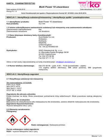 KARTA CHARAKTERYSTYKI Multi Power 10 utwardzacz Data wydania 23.06.2015 Wersja PL:1.0 Data aktualizacji: 10.11.2015 Karta Charakterystyki jest zgodna z Rozporządzeniem Komisji UE 2015/830 z dnia 28.05.2015r. SEKCJA 1: Identyfikacja substancji/mieszaniny i identyfikacja spółki / przedsiębiorstwa Multi Power 10 utwardzacz 1.1 Identyfikator produktu: Kod produktu: OL1144 1.2 Istotne zidentyfikowane zastosowania substancji lub mieszaniny oraz zastosowania odradzane: Zastosowanie zidentyfikowane: klej Zastosowanie odradzane: nie określono 1.3 Dane dotyczące dostawcy karty charakterystyki: Producent: Scott Bader Co Ltd, Wollaston. Northants NN297RL United Kingdom Tel. +44 (0)1933663100 Dystrybutor: WIKO Klebetechnik Sp. z o.o. Ul. Marszałka Rydza-Śmigłego 36/38 42-200 Częstochowa Tel. 034 372 58 58 Fax 034 371 11 14 Adres e-mail osoby odpowiedzialnej za kartę charakterystyki: [email protected] 1.4 Numer telefonu alarmowego: 034 372 58 58 – godz. 8.00 – 16.00 (poniedziałek – piątek) 112 (ogólny telefon alarmowy), 998 (straż pożarna), 999 (pogotowie medyczne); SEKCJA 2: Identyfikacja zagrożeń 2.1 Klasyfikacja substancji lub mieszaniny Wg rozporządzenia 1272/2008: Flam.Liq.2; H225 Skin Irrit.2; H315 Skin Sens,1; H317 STOT SE 3; H335 Zagrożenie dla zdrowia człowieka Działa drażniąc na skórę. Może powodować podrażnienia dróg oddechowych. Może powodowa reakcję alergiczną skóry. Zagrożenie dla środowiska Mieszanina nie sklasyfikowana jako niebezpieczna dla środowiska, zawiera składniki niebezpieczne dla środowiska. Zagrożenia fizyczne/chemiczne Wysoce łatwopalna ciecz i pary. 2.2 Elementy oznakowania: Piktogramy: Hasło ostrzegawcze: Niebezpieczeństwo Zwroty wskazujące rodzaj zagrożenia: H225 – wysoce łatwopalna ciecz i pary Strona 1 z 9 KARTA CHARAKTERYSTYKI Multi Power 10 utwardzacz Data wydania 23.06.2015 Wersja PL:1.0 Data aktualizacji: 10.11.2015 Karta Charakterystyki jest zgodna z Rozporządzeniem Komisji UE 2015/830 z dnia 28.05.2015r. H315 – działa drażniąco na skórę H317 – może powodować reakcję alergiczną skóry H335 – może spowodować podrażnienie dróg oddechowych Zwroty określające warunki bezpiecznego stosowania: P210 - Przechowywać z dala od źródeł ciepła, gorących powierzchni, źródeł iskrzenia, otwartego ognia i innych źródeł zapłonu. Nie palić P235 – Przechowywać w chłodnym miejscu P241 - Używać elektrycznego/wentylującego/oświetleniowego/…/. przeciwwybuchowego sprzętu. P280 - Stosować rękawice ochronne/odzież ochronną/ ochronę oczu/ochronę twarzy. P303 + P361+ P353 - W PRZYPADKU KONTATKU ZE SKÓRĄ (lub z włosami): Natychmiast zdjąć całą zanieczyszczoną odzież. Spłukać skórę pod strumieniem wody/prysznicem P304+P340 - W PRZYPADKU DOSTANIA SIĘ DO DRÓG ODDECHOWYCH: wyprowadzić lub wynieść poszkodowanego na świeże powietrze i zapewnić mu warunki do swobodnego oddychania P501 - Zawartość/pojemnik usuwać jak odpad niebezpieczny. Zawiera: Metakrylan metylu (nr CAS: 80-62-6), 2.3 Inne zagrożenia: Brak dodatkowych zagrożeń Brak informacji na temat spełnienia kryteriów PBT lub vPvB zgodnie z załącznikiem XIII rozporządzenia REACH. Odpowiednie badania nie były przeprowadzone. SEKCJA 3: Skład/informacja o składnikach 3.1 Substancja: Nie dotyczy. 3.2 Mieszanina: Niebezpieczne składniki: Identyfikator produktu Metakrylan metylu CAS: 80-62-6 WE: 201-297-1 Nr indeksowy: 607-035-00-6 Nr REACH: 01-2119452498-28 Dibenzoesan oksydipropylu CAS: 27138-31-4 WE: 248-258-5 Nr indeksowy: Nr REACH: 01-2119529241-49 3,5-dietylo-1,2-dihydro-1- fenylo-2propylopirydyna CAS: 34562-31-7 WE: 252-091-3 Nr indeksowy: Nr REACH: substancja podlega przepisom okresu przejściowego Zawartość % Klasyfikacja CLP Kody zwrotów Klasa zagrożenia i wskazujących kody kategorii rodzaj zagrożenia 50 - 75 Flam. Liq.2 STOT SE 3 Skin Irrit.2 Skin Sens.1 H225 H335 H315 H317 5 - 10 Aquatic Chronic 3 H412 1-3 Acute Tox.4 Acute Tox.4 Skin Irrit.2 Eye Irrit.2 Aquatic Chronic 4 H302 H332 H315 H319 H413 Pełna treść zwrotów H w sekcji 16 Strona 2 z 9 KARTA CHARAKTERYSTYKI Multi Power 10 utwardzacz Data wydania 23.06.2015 Wersja PL:1.0 Data aktualizacji: 10.11.2015 Karta Charakterystyki jest zgodna z Rozporządzeniem Komisji UE 2015/830 z dnia 28.05.2015r. SEKCJA 4: Środki pierwszej pomocy 4.1 Opis środków pierwszej pomocy W przypadku kontaktu ze skórą: Należy zdjąć zanieczyszczoną odzież, umyć zabrudzoną skórę wodą z mydłem, spłukać dokładnie wodą, w razie niepokojących objawów skontaktować się z lekarzem. W przypadku kontaktu z oczami: Przepłukać oczy przez kilkanaście minut (ok. 15) dużą ilością wody trzymając powieki szeroko rozwarte. Unikać silnego strumienia, ze względu na niebezpieczeństwo uszkodzenia rogówki, natychmiast skontaktować się z lekarzem. Narażenie inhalacyjne: W razie zawrotów głowy lub nudności wyprowadzić poszkodowanego na świeże powietrze, w razie braku szybkiej poprawy zasięgnąć porady lekarza. W przypadku utraty przytomności ułożyć w pozycji bocznej ustalonej i natychmiast wezwać lekarza. Utrzymywać drożność dróg oddechowych. Rozluźnić odzież (np. kołnierz, krawat lub pasek). W razie wdychania produktów spalania wystąpienie objawów może być opóźnione. Narażona osoba może wymagać obserwacji lekarskiej przez okres 48 godzin od chwili wypadku. W przypadku połknięcia: Nie wywoływać wymiotów. Nigdy nie podawać doustnie niczego osobie poszkodowanej. Podać osobie przytomnej do wypicia dużą ilość wody, przepłukać usta wodą. W przypadku wystąpienia nieprzemijających niepokojących objawów zasięgnąć porady lekarza. 4.2 Najważniejsze ostre i opóźnione objawy oraz skutki narażenia: Kontakt ze skórą: powoduje podrażnienia, może powodować reakcję alergiczną skóry Kontakt z oczami: powoduje podrażnienia Układ oddechowy: wdychaniu dużych bezpośrednich stężeń może powodować podra