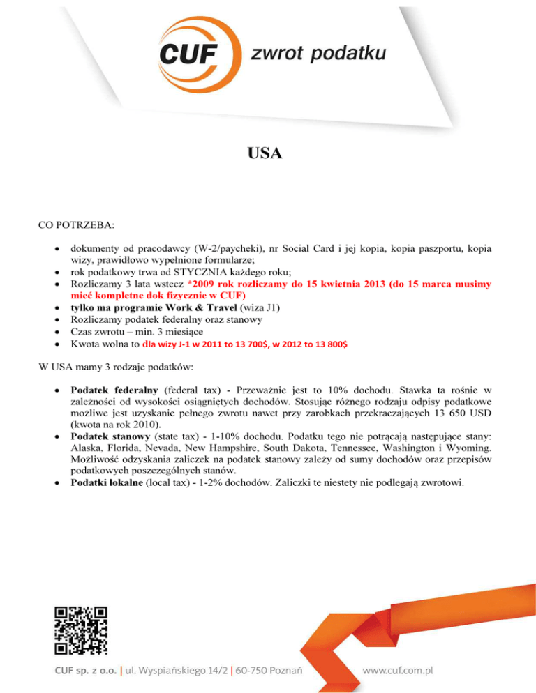 USA CO POTRZEBA: • • • • • • • dokumenty od pracodawcy (W-2/paycheki), nr Social Card i jej kopia, kopia paszportu, kopia wizy, prawidłowo wypełnione formularze; rok podatkowy trwa od STYCZNIA każdego roku; Rozliczamy 3 lata wstecz *2009 rok rozliczamy do 15 kwietnia 2013 (do 15 marca musimy mieć kompletne dok fizycznie w CUF) tylko ma programie Work & Travel (wiza J1) Rozliczamy podatek federalny oraz stanowy Czas zwrotu – min. 3 miesiące Kwota wolna to dla wizy J-1 w 2011 to 13 700$, w 2012 to 13 800$ W USA mamy 3 rodzaje podatków: • • • Podatek federalny (federal tax) - Przeważnie jest to 10% dochodu. Stawka ta rośnie w zależności od wysokości osiągniętych dochodów. Stosując różnego rodzaju odpisy podatkowe możliwe jest uzyskanie pełnego zwrotu nawet przy zarobkach przekraczających 13 650 USD (kwota na rok 2010). Podatek stanowy (state tax) - 1-10% dochodu. Podatku tego nie potrącają następujące stany: Alaska, Florida, Nevada, New Hampshire, South Dakota, Tennessee, Washington i Wyoming. Możliwość odzyskania zaliczek na podatek stanowy zależy od sumy dochodów oraz przepisów podatkowych poszczególnych stanów. Podatki lokalne (local tax) - 1-2% dochodów. Zaliczki te niestety nie podlegają zwrotowi.