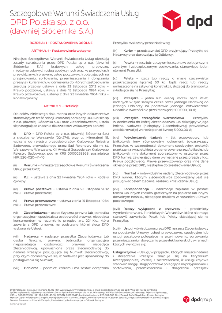 Szczegółowe Warunki Świadczenia Usług DPD Polska sp. z o.o. (dawniej Siódemka S.A.) ROZDZIAŁ I – POSTANOWIENIA OGÓLNE ARTYKUŁ 1 – Postanowienia wstępne Niniejsze Szczegółowe Warunki Świadczenia Usług określają zasady świadczenia przez DPD Polska sp z o.o. (dawniej Siódemka S.A.) krajowych usług przewozu, międzynarodowych usług spedycyjnych oraz, w przypadkach przewidzianych prawem, usług pocztowych polegających na przyjmowaniu, sortowaniu, przemieszczaniu i doręczaniu przesyłek kurierskich, w odniesieniu do których zastosowanie znajdują przepisy ustawy z dnia 23 listopada 2012 roku – Prawo pocztowe, ustawy z dnia 15 listopada 1984 roku – Prawo przewozowe, ustawy z dnia 23 kwietnia 1964 roku – Kodeks cywilny. ARTYKUŁ 2 – Definicje Dla celów niniejszego dokumentu oraz innych dokumentów stanowiących treść relacji umownej pomiędzy DPD Polska sp z o.o. (dawniej Siódemka S.A.) oraz Zleceniodawcami, ustala się następujące znacznie dla zwrotów wskazanych poniżej: (i) DPD – DPD Polska sp z o.o. (dawniej Siódemka S.A.) z siedzibą w Warszawie (02-274), przy ul. Mineralnej 15, wpisana do rejestru przedsiębiorców Krajowego Rejestru Sądowego, prowadzonego przez Sąd Rejonowy dla m. st. Warszawy w Warszawie, XIII Wydział Gospodarczy Krajowego Rejestru Sądowego, pod nr KRS 0000028368, posiadająca NIP: 526-020-41-10; (ii) Warunki – niniejsze Szczegółowe Warunki Świadczenia Usług przez DPD; (iii) K.c. – ustawa z dnia 23 kwietnia 1964 roku – Kodeks cywilny; (iv) Prawo pocztowe – ustawa z dnia 23 listopada 2012 roku – Prawo pocztowe; (v) Prawo przewozowe – ustawa z dnia 15 listopada 1984 roku – Prawo przewozowe; (vi) Zleceniodawca – osoba fizyczna, prawna lub jednostka organizacyjna nieposiadająca osobowości prawnej, niebędąca konsumentem w rozumieniu przepisu art. 221 K.c., która zawarła z DPD umowę, na podstawie której zleca DPD wykonanie Usługi; (vii) Nadawca – nadający przesyłkę Zleceniodawca lub osoba fizyczna, prawna, jednostka organizacyjna nieposiadająca osobowości prawnej niebędąca Zleceniodawcą, upoważniona przez Zleceniodawcę do nadania Przesyłki posługująca się Numkat Zleceniodawcy, przy czym domniemywa się, iż Nadawca jest uprawniony do posługiwania się Numkat; (viii) Odbiorca – podmiot, któremu ma zostać doręczona Przesyłka, wskazany przez Nadawcę; (ix) Kurier – przedstawiciel DPD przyjmujący Przesyłkę od Nadawcy oraz doręczający ją Odbiorcy; (x) Paczka – rzecz lub rzeczy umieszczone w pojedynczym, zwartym i zabezpieczonym opakowaniu, stanowiące jeden element Przesyłki; (xi) Paleta – rzecz lub rzeczy o masie rzeczywistej przekraczającej (łącznie) 50 kg, bądź rzecz lub rzeczy umieszczone na sztywnej konstrukcji, służącej do transportu, składające się na Przesyłkę; (xii) Przesyłka – jedna lub więcej Paczek bądź Palet, nadanych w tym samym czasie przez jednego Nadawcę do jednego Odbiorcy na podstawie jednego Potwierdzenia Nadania o wartości nie przekraczającej 500.000,00 zł; (xiii) Przesyłka szczególnie wartościowa – Przesyłka, w odniesieniu do której Zleceniodawca lub działający w jego imieniu Nadawca (niebędący Zleceniodawcą) prawidłowo zadeklarował jej wartość ponad kwotę 5.000,00 zł; (xiv) Potwierdzenie Nadania – list przewozowy, lub jakikolwiek inny równoważny dokument towarzyszący Przesyłce, w szczególności dokument spedycyjny, protokół przekazania wraz etykietą wygenerowane przez Aplikację, lub jakikolwiek inny dokument sporządzony w ustalonej przez DPD formie, zawierający dane wymagane przez przepisy K.c., Prawa pocztowego, Prawa przewozowego oraz inne dane określone przez DPD, niezbędne do zrealizowania Usługi; (xv) Numkat – indywidualnie nadany Zleceniodawcy przez DPD numer, którym Zleceniodawca zobowiązany jest się posługiwać celem zlecania, realizacji i rozliczania Usług; (xvi) Korespondencja – informacje zapisane w postaci tekstu lub innych znaków graficznych na papierze lub innym, dowolnym nośniku, niebędące drukiem w rozumieniu Prawa pocztowego; (xvii) Rzeczy wyłączone z przewozu – przedmioty wymienione w art. 11 niniejszych Warunków, które nie mogą stanowić zawartości Paczki lub Palety składającej się na Przesyłkę; (xviii) Usługi – świadczone przez DPD na rzecz Zleceniodawcy na podstawie Umowy usługi przewozowe, spedycyjne lub usługi pocztowe polegające na przyjmowaniu, sortowaniu, przemieszczaniu i doręczaniu przesyłek kurierskich, w ramach których wyróżnia się: Usługi krajowe – Usługi, w przypadku których miejsce nadania i doręczenia Przesyłki znajduje się na terytorium Rzeczypospolitej Polskiej z zastrzeżeniem, iż Usługi krajowe stanowić mogą usługi pocztowe polegające na przyjmowaniu, sortowaniu, przemieszczaniu i doręczaniu przesyłek DPD Polska sp. z o.o., ul. Mineralna 15, 02–274 Warszawa, www.dpd.com.pl, e-mail: [email protected], tel. 22 577 55 00, fax 22 577 55 50 Spółka wpisana do rejestru przedsiębiorców w Sądzie Rejonowym dla m. st. Warszawy, XIII Wydział Gospodarczy Krajowego Rejestru Sądowego, KRS nr 0000028368, NIP: 526-020-41-10, REGON: 012026421, kapitał zakładowy: 228.604.000 PLN, Zarząd: Rafał Nawłoka – Prezes Zarządu, Henryk Czyż – Wiceprezes Zarządu, Maciej Głowacki – Członek Zarządu, Monika Kowalska – Członek Zarządu, Krzysztof Porębski – Członek Zarządu, Tomasz Szalewicz – Członek Zarządu, Marta Westrych–Andrzejczyk – Członek Zarządu. Strona 1 z22 Szczegółowe Warunki Świadczenia Usług DPD Polska sp. z o.o. (dawniej Siódemka S.A.) kurierskich w rozumieniu Prawa pocztowego lub przewóz w rozumieniu Prawa przewozowego; Usługi międzynarodowe – Usługi, w przypadku których Przesyłka będzie przemieszczana z zagranicy do Rzeczypospolitej Polskiej lub z Rzeczypospolitej Polskiej za granicę, z zastrzeżeniem, iż Usługi międzynarodowe stanowią usługę spedycji; Za