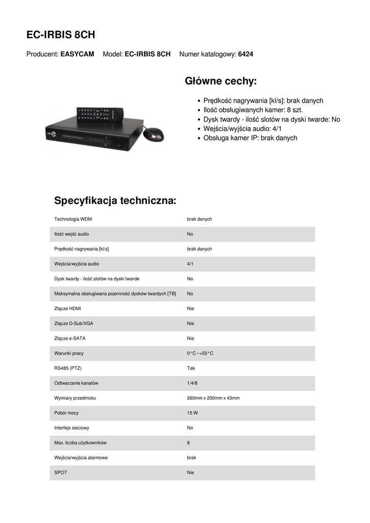 EC-IRBIS 8CH Główne cechy: Specyfikacja techniczna