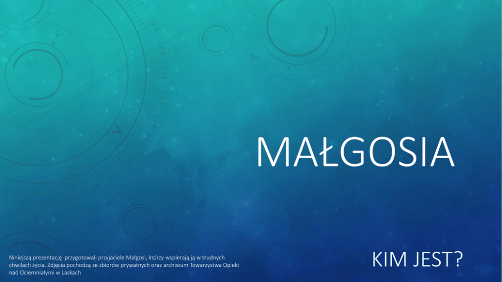 MAŁGOSIA Niniejszą prezentację przygotowali przyjaciele Małgosi, którzy wspierają ją w trudnych chwilach życia. Zdjęcia pochodzą ze zbiorów prywatnych oraz archiwum Towarzystwa Opieki nad Ociemniałymi w Laskach KIM JEST? DO NIEDAWNA BYŁA ZDROWA I PEŁNA SIŁ • MA 38 LAT, SAMOTNIE WYCHOWUJE DWÓCH CHŁOPCÓW W WIEKU 6 I 9 LAT • HIPOTERAPEUTA, TYFLOPEDAGOG, TRENER PARAJEŹDZIECTWA, KIEROWNIK DZIAŁU HIPOTERAPII I DOGOTERAPII W TOWARZYSTWIE OPIEKI NAD OCIEMNIAŁYMI W LASKACH ORAZ TRENER W FIRMIE OPEN BY HORSES • WSPIERA JAKO TERAPEUTA POLSKIE TOWARZYSTWO HIPOTERAPEUTYCZNE, JEST WYKŁADOWCĄ • WSPÓŁPRACOWAŁA Z KOMISJĄ DS. PARAJEŹDZIECTWA PRZY POLSKIM ZWIĄZKU JEŹDZIECKIM ORAZ OLIMPIADAMI SPECJALNYMI POLSKA DO NIEDAWNA BYŁA ZDROWA I PEŁNA SIŁ Z PASJĄ DZIAŁAŁA NA RZECZ ROZWOJU HIPOTERAPII I JEŹDZIECTWA OSÓB NIEPEŁNOSPRAWNYCH W POLSCE PROWADZI WYKŁADY NA KURSACH HIPOTERAPII, DZIELI SIĘ WIEDZĄ I DOŚWIADCZENIEM Z INNYMI HIPOTERAPEUTAMI JEJ ZAANGAŻOWANIE W ROZWÓJ JEŹDZIECTWA PARAOLIMPIJSKIEGO I RUCH OLIMPIAD SPECJALNYCH W POLSCE, DAJE SZANSĘ NA KONTYNUOWANIE PRACY Z KONIEM WIELU PACJENTOM, KTÓRZY ZACZYNALI OD ZAJĘĆ HIPOTERAPII MISTRZOSTWA EUROPY, NORWEGIA 2009 MISTRZOSTWA EUROPY, NIEMCY LETNIE ŚWIATOWE IGRZYSKA OLIMPIAD SPECJALNYCH SHANGHAI, 2007 MAŁGOSIA OD LAT ZWIĄZANA JEST Z TOWARZYSTWEM OPIEKI NAD OCIEMNIAŁYMI W LASKACH PRACA Z NIEWIDOMYMI I SŁABOWIDZĄCYMI DZIEĆMI PRZYNOSI JEJ OGROMNĄ SATYSFAKCJĘ NIEWIDOME DZIECI I MŁODZIEŻ UWIELBIAJĄ ZAJĘCIA PROWADZONE PRZEZ MAŁGOSIĘ DO KAŻDYCH ZAJĘĆ Z HIPOTERAPII KONIE MUSZĄ ZOSTAĆ ODPOWIEDNIO PRZYGOTOWANE PODOBNIE JAK PSY DO ZAJĘĆ Z DOGOTERAPII NIEWIDOME I SŁABOWIDZĄCE DZIECI UWIELBIAJĄ ZAJĘCIA Z PSAMI KILKA MIESIĘCY TEMU, ŻYCIE MAŁGOSI ULEGŁO ZMIANIE • OD CZERWCA 2015 ROKU STAN ZDROWIA MAŁGOSI POGARSZA SIĘ • W LISTOPADZIE POSTAWIONO WSTĘPNĄ DIAGNOZĘ – POLYMYOSITIS – ZAPALENIE WIELOMIĘŚNIOWE • MAŁGOSIA CIERPI NA NIEDOWŁAD KSOBNY CZTEROKOŃCZYNOWY ORAZ LEWOSTRONNE ZABURZENIA CZUCIA • KAŻDE OBCIĄŻENIE STANOWI WYZWANIE DLA JEJ MIĘŚNI JEJ ŻYCIOWYM PRIORYTETEM JEST ODZYSKANIE NIEZALEŻNOŚCI ZARÓWNO W ŻYCIU OSOBISTYM JAK I ZAWODOWYM MAŁGOSIA NADAL CHCE POMAGAĆ INNYM OSOBOM NIEPEŁNOSPRAWNYM. TO SENS JEJ ŻYCIA. MA ŚWIADOMOŚĆ, ŻE W OBECNYM STANIE BĘDZIE INACZEJ REALIZOWAĆ SWOJE CELE ZAWODOWE CHCE KONTYNUOWAĆ WDRAŻANIE AUTORSKICH METOD PRACY W HIPOTERAPII I REHABILITACJI PACJENTÓW Z DYSFUNKCJĄ WZROKU I NIEPEŁNOSPRAWNYCH RUCHOWO. MA ZAMIAR NAPISAĆ PORADNIK DLA STAŻYSTÓW, TERAPEUTÓW I TRENERÓW MIMO CIERPIENIA MAŁGOSIA NIE PODDAJE SIĘ. STARA SIĘ AKTYWNIE SPĘDZAĆ CZAS ZE SWOIMI SYNKAMI. MA NADZIEJĘ, ŻE WIEDZA I DOŚWIADCZENIE OSOBY ZDROWEJ, A OBECNIE NIEPEŁNOSPRAWNEJ, STANIE SIĘ DLA NIEJ – JAKO TRENERA -TERAPEUTY ŹRÓDŁEM NOWYCH POMYSŁÓW CZASEM JEST JEJ CIĘŻKO. NIE ZAŁAMUJE SIĘ JEDNAK, MA DLA KOGO ŻYĆ KAŻDEGO DNIA UCZY SIĘ WIĘKSZEJ CIERPLIWOŚCI I ZARADNOŚCI, AKCEPTACJI CHOROBY. WALCZY… REALIZACJA MARZEŃ MAŁGOSI BĘDZIE WYMAGAŁA ODPOWIEDNIEGO SPRZĘTU, KTÓRY UMOŻLIWI JEJ SAMODZIELNE FUNKCJONOWANIE W DOMU I PRACY WÓZEK ELEKTRYCZNY – POLSKI BLUMIL – DOSTOSOWANY SPECJALNIE DO JEJ POTRZEB KOSZTUJE OK. 40.000 ZŁ – W ZALEŻNOŚCI OD KURSU DOLARA DZIĘKI NASZEJ POMOCY MAŁGOSIA BĘDZIE MOGŁA PORUSZAĆ SIĘ SWOBODNIE M.IN. PO MIEŚCIE ORAZ PO PADOKU, PO KTÓRYM BIEGAJĄ KONIE. ODPROWADZI SYNÓW DO SZKOŁY, ZAŁATWI CODZIENNE SPRAWY. BĘDZIE MOGŁA PRACOWAĆ. JEJ MIĘŚNIE BĘDĄ ODCIĄŻONE BATERIE TEGO TYPU WÓZKA WYTRZYMUJĄ OK. 36 GODZIN. ŁADOWANIE TRWA 6 GODZIN. GRUBE OPONY – TO PRAWDZIWE TERENÓWKI, DZIĘKI KTÓRYM MAŁGOSIA POKONA KAŻDĄ DROGĘ Polski Blumil – stworzony na bazie produktu firmy Segway oraz mechanizmu autorstwa niepełnosprawnego Miłosza Krawczyka Szczegóły: http://www.niepelnosprawni.pl/ledg e/x/264069 ŻYCIE MAŁGOSI MOŻE BYĆ PROSTSZE. POMÓŻMY JEJ! 1. WPŁAĆMY 1% 0000270809 Z DOPISKIEM PYRKA-MAJERKIEWICZ, 5197 2. WPŁAĆMY DAROWIZNĘ: 62 1600 1286 0003 0031 8642 6001, TYTUŁ: PYRKAMAJERKIEWICZ, 5197 3. WYŚLIJMY SMS NA NR 75 165 O TREŚCI: POMOC 5197 KOSZT TO 5 ZŁ NETTO (BRUTTO 6.15 ZŁ) NUMERY: KONTA, KRS I SMSA POCHODZĄ Z OFICJALNEJ STRONY FUNDACJI AVALON: HTTP://WWW.FUNDACJAAVALON.PL/NASI_BENEFICJENCI/PYRKA_MAJERKIEWICZ_MALGOR ZATA.HTML?662AFE781EA10CCCA6A1C443CB715F0C=8D2B4AC3695AA5CAC9560A4189B8 AC8B zobacz ostatni slajd KILKA SŁÓW OD MAŁGOSI: „PRZEDE MNĄ WIELE WYZWAŃ. CHCIAŁABYM JESZCZE BYĆ PRZYDATNA ZWŁASZCZA DLA OSÓB NIEPEŁNOSPRAWNYCH. GORĄCO DZIĘKUJĘ PAŃSTWU ZA KAŻDĄ WPŁATĘ, ZA KAŻDY DAR SERCA, KTÓRY POMOŻE MI W REALIZACJI ŻYCIOWEJ PASJI ”