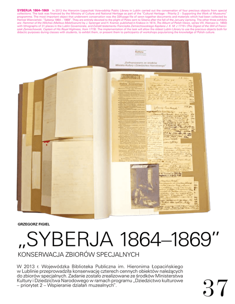 SyBERjA 1864–1869 In 2013 the Hieronim Łopaciński Voievodship Public Library in Lublin carried out the conservation of four precious objects from special collections. The task was financed by the Ministry of Culture and National Heritage as part of the “Cultural Heritage – Priority 2 – Supporting the Work of Museums” programme. The most important object that underwent conservation was the 334-page file of sewn together documents and materials which had been collected by Henryk Wiercieński: “Syberja 1864 – 1869”. They are entirely devoted to the plight of Poles sent to Siberia after the fall of the January Uprising. The other three exhibits are: Hammer of the Witches (Malleus Maleficarum) by J. Sprenger and H. Kramer, published in Krakow in 1614, The Album of Polish Views, series VIII, Warsaw (c. 1850) with lithographs of 31 places in the Lublin Governorate, and Extrakt testamentu Franciszka Zamiechowskiego Kapitana J. K. M. z 1719 r (The Digest of the Will of Franciszek Zamiechowski, Captain of His Royal Highness, from 1719). The implementation of the task will allow the oldest Lublin Library to use the precious objects both for didactic purposes during classes with students, to exhibit them, or present them to participants of workshops popularising the knowledge of Polish culture. Grzegorz Figiel „SyberJa 1864–1869” Konserwacja zbiorów specjalnych W 2013 r. Wojewódzka Biblioteka Publiczna im. Hieronima Łopacińskiego w Lublinie przeprowadziła konserwację czterech cennych obiektów należących do zbiorów specjalnych. Zadanie zostało zrealizowane ze środków Ministerstwa Kultury i Dziedzictwa Narodowego w ramach programu „Dziedzictwo kulturowe – priorytet 2 – Wspieranie działań muzealnych”. 37 N Poszyt dokumentów i materiałów zebranych przez Henryka Wiercieńskiego – „Syberja 1864–1869”; stan przed i po konserwacji 38 ajważniejszym obiektem poddanym konserwacji był liczący 334 karty poszyt dokumentów i materiałów zebranych przez Henryka Wiercieńskiego – „Syberja 1864–1869”. Wiercieński urodził się w 1843 r. w Kłodnicy k. Bełżyc w rodzinie ziemiańskiej. Był ławnikiem, sędzią sądu gminnego w Rogowie, społecznikiem, obrońcą polskości Chełmszczyzny oraz uczestnikiem powstania styczniowego. Podczas styczniowej insurekcji walczył w oddziale gen. Mariana Langiewicza, biorąc udział w bitwach pod Wąchockiem (3 II 1863), Świętym Krzyżem (12 II 1863) i w Staszowie (17 II 1863). Podczas bitwy pod Małogoszczą – 24 II 1863 r. – został schwytany przez Rosjan i przebywał w więzieniu aż do procesu, który odbył się w lutym 1864 r. W jego wyniku Wiercieński został zesłany na 5 lat wygnania na Sybir. To właśnie tam zbierał materiały, które znalazły się w restaurowanym poszycie. Dotyczą one w całości losów Polaków zesłanych na Syberię po klęsce powstania styczniowego i są unikatowym zabytkiem, ważnym dla polskiej historii i kultury. „Syberja 1864–1869” składa się z dwóch części, z których jedna jest zbiorem zapisów rękopiśmiennych, dokumentów życia społecznego oraz fotografii, litografii i odręcznych rysunków. Druga, zatytułowana „Jenisejsk”, jest albumem zawierającym widoki Syberii sporządzone ołówkiem i akwarelą. Stopień zniszczenia obiektu określono na 40%. Większość uszkodzeń powstało w wyniku użytkowania oraz prowizorycznego montażu kart. Doprowadziło to do licznych ubytków papieru, w tym warstwy rękopiśmiennej, szczególnie w miejscach załamań i sklejeń. W zbiorze rysunków, grafik i akwareli dominowały uszkodzenia mechaniczne i chemiczne, a fotografie – zwłaszcza na papierze fotograficznym użytym do przefotografowania dawnych zdjęć – były mało czytelne. Następnym z odrestaurowanych eksponatów jest Młot na czarownice, w tłumaczeniu Stanisława Ząbkowica (Zambkowica, Ząmbkowica), wydany w Krakowie w 1614 r. Jest to unikatowy zbiór przetłumaczonych na język polski wypowiedzi teologów i inkwizytorów niemieckich Jakoba Sprengera i Heinricha Krämera, na temat czarów i czarownic. Stopień uszkodzenia druku, liczącego 238 kart o wymiarach 19 x 13,5 cm, określono na 40%. Dominowały zniszczenia biologiczne i mechaniczne. Blok książki był luźny i bardzo zniszczony, papier bibulasty i wysypujący, występowały rozlegle ubytki przy zewnętrznych narożnikach. Kolejnym obiektem objętym konserwacją był Album widoków Polskich, seria VIII, Warszawa [ok. 1850]. Punktem wyjścia dla prezentowanych w nim litografii stały się rysunki Napoleona Ordy, ukazujące historyczne miejsca naszego kraju. Artysta podróżował po swojej ojczyźnie, by dokumentować zabytki architektury i ich otoczenie. Seria VIII Albumu jest szczególnie cennym źródłem wiedzy o Lubelszczyźnie, gdyż zawiera widoki miejscowości guberni lubelskiej. Album składający się z 31 luźnych grafik wykonano w warszawskiej drukarni M. Fajansa. Grafiki odbito w technice litografii barwnej na papierze bawełnianym o wymiarach 31 x 44,5 cm. Papier miał zabrudzoną powierzchnię, w wielu miejscach występowały zbrązowienia spowodowane przesyceniem spoiwa farby litograficznej oraz liczne plamy o nieregularnym kształcie, będące śladami działalności mikroorganizmów. Oryginalna teka ochronna wykonana z tektury i czarnego płótna introligatorskiego, nie speł- Album widoków Polskich, seria VIII, Warszawa [ok. 1850]. Stan przed i po konserwacji. Fot. ze zbiorów WBP w Lublinie niała swej funkcji, gdyż wszystkie jej tekturowe części miały przetarte i rozwarstwione krawędzie. Ostatnim obiektem poddanym konserwacji był „Extrakt testamentu Franciszka Zamiechowskiego Kapitana J. K. M. z 1719 r.”. Jest to rękopis liczący 4 karty o wymiarach 33 x 22 cm. Stopień zniszczenia określono na ok. 40%. Zły stan zachowania był skutkiem uszkodzeń wynikających z techniki wykonania papieru i naruszeń mechanicznych. W trakcie wstępnych prac kon