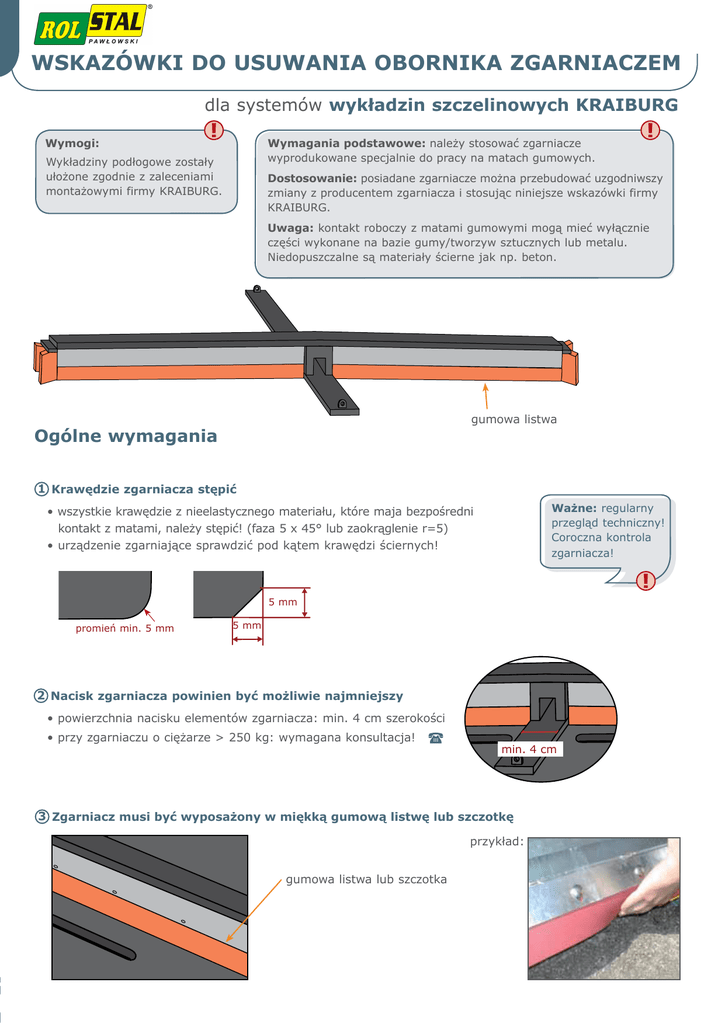 Wskazówki do usuwania obornika zgarniaczem dla systemów wykładzin szczelinowych KRAIBURG Wymogi: ! Wymagania podstawowe: należy stosować zgarniacze wyprodukowane specjalnie do pracy na matach gumowych. Wykładziny podłogowe zostały ułożone zgodnie z zaleceniami montażowymi firmy KRAIBURG. ! Dostosowanie: posiadane zgarniacze można przebudować uzgodniwszy zmiany z producentem zgarniacza i stosując niniejsze wskazówki firmy KRAIBURG. Uwaga: kontakt roboczy z matami gumowymi mogą mieć wyłącznie części wykonane na bazie gumy/tworzyw sztucznych lub metalu. Niedopuszczalne są materiały ścierne jak np. beton. gumowa listwa Ogólne wymagania 1 Krawędzie zgarniacza stępić Ważne: regularny przegląd techniczny! Coroczna kontrola zgarniacza! • wszystkie krawędzie z nieelastycznego materiału, które maja bezpośredni kontakt z matami, należy stępić! (faza 5 x 45° lub zaokrąglenie r=5) • urządzenie zgarniające sprawdzić pod kątem krawędzi ściernych! ! 5 mm promień min. 5 mm 5 mm 2 Nacisk zgarniacza powinien być możliwie najmniejszy • powierzchnia nacisku elementów zgarniacza: min. 4 cm szerokości • przy zgarniaczu o ciężarze > 250 kg: wymagana konsultacja! min. 4 cm 3 Zgarniacz musi być wyposażony w miękką gumową listwę lub szczotkę przykład: gumowa listwa lub szczotka 2 WSKAZÓWKI ZGARNIANIA – KRAIBURG wykładziny szczelinowe Dalsze modele zgarniaczy Zgarniacz linowy: • • wałek zwrotny zamocować wyżej o grubość maty nie jest wymagana ochrona maty przed tarciem, ponieważ: - zastosowano ogniwa łańcuchowe ze stali okrągłej o min. średnicy 12 mm - zastosowano linę z tworzywa sztucznego lub stalową linę w płaszczu z tworzywa Ø min. 12 mm (w przypadku zastosowania liny stalowej nie powinna ona leżeć bezpośrednio na macie gumowej -> mata powinna być chroniona przed tarciem liny) Zgarniacz hydrauliczny: • profil ciągnący / element zgarniający zamontować na macie • system ustabilizować: podłożyć szeroki płaskownik: - ok. 3 mm gruby - wystający min. 2 cm płaskownik min. 2 cm przykład: Robot do czyszczenia obory: • funkcjonuje na wykładzinach szczelinowych KRAIBURG, jeżeli są spełnione wymagania podstawowe (patrz j.w.) 3 WSKAZÓWKI ZGARNIANIA – KRAIBURG wykładziny szczelinowe Dopasowanie zgarniacza - przykłady - Krawędzie zgarniacza stępić zaokrąglić powierzchnie nacisku płóz bocznych boczna powierzchnia zgarniająca Uwaga: zaokrąglić ostre krawędzie Blok środkowy prowadzenie pod blokiem środkowym podwyższyć o grubość maty kierunek zgarniania blok środkowy z szerokimi rolkami z tworzywa sztucznego widok z boku zaokrąglić boczne krawędzie szerokiej powierzchni płozy bloku środkowego do szerokiej powierzchni płozy bloku środkowego przyspawać walce stalowe Płozy boczne boczne płozy z walcem stalowym i szeroką powierzchnią nacisku przykręcone szerokie i zaokrąglone płozy boczne szerokie i zaokrąglone płozy boczne 4 WSKAZÓWKI ZGARNIANIA – KRAIBURG wykładziny szczelinowe Ważne: regularna konserwacja i coroczna kontrola zgarniacza Decydującą rolę dla wieloletniego i niezawodnego działania zgarniacza na wykładzinach szczelinowych firmy KRAIBURG odgrywa coroczna kontrola. Części zgarniacza ścierają się również na powierzchni gumowej, co oznacza, że powstają ostre krawędzie. Przykład: zużycie części stalowych zgarniacza po ok. 2 latach użytkowanie na gumie: ścieranie krawędzi 4 mm w ciągu 2,5 roku Wskazówka: obrócić zgarniacz, skontrolować ostre krawędzie i w razie potrzeby zaokrąglić szlifierką kątową 05/2011 - II GUMMIWERK KRAIBURG ELASTIK GmbH, D-84529 Tittmoning, Göllstr. 8 Tel. +49/8683/701-303, Fax +49/8683/701-190, e-mail: [email protected] www.kraiburg-agri.com Podstawą prawną jest niemiecka wersja dokumentu.