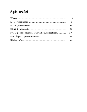 Spis treści Wstęp…………………………………………………....… 3 I. O religijności………………………………………...... 7 II. O patriotyzmie……………………………………….. 14 III. O krajobrazie………………………………………... 21 IV. O poezji i muzyce. Wywiad z J. Skrzekiem………... 27 Mój Śląsk – podsumowanie………………………….... 41 Bibliografia………………………………………………. 46 3 Wstęp By zacząć pisać o Śląsku, należy najpierw sprecyzować znaczenie terminów „Śląsk”, „Górny Śląsk”, „województwo śląskie”, „Zagłębie”, „Śląsk Cieszyński” etc. . Terminologia w tym wypadku jest dość zawiła i skomplikowana, a wynika to z faktu, że Śląsk - jako kraina geograficzna - dzielony był na różne części. Ciekawostką jest fakt, że „Górny Śląsk”, jako określenie samo w sobie, jest pojęciem wyłącznie potocznym i nie występuje na żadnym szczeblu obecnej administracji państwowej. W powszechnej świadomości ziemie Górnego Śląska obejmują natomiast część obecnego województwa opolskiego oraz województwa śląskiego. Geograficzne przymiotniki „górny” oraz „dolny” nadawane były zwykle rozległym krainom, które należało podzielić wedle jakiegoś schematu – dzielono je więc w stosunku do ich położenia względem poziomu morza. Tereny wyżynne dostawały zatem epitet „górny”, a tereny nizinne – „dolny”. I choć, co prawda, istnieje województwo dolnośląskie, to nie ma czegoś takiego, jak województwo „górnośląskie”; w oficjalnym nazewnictwie występuje jedynie „województwo śląskie”. Województwa te mają oczywiście swoje ściśle określone granice i da się je bez najmniejszego problemu zaznaczyć na mapie. Nie da się natomiast określić ścisłych granic geograficznych, wobec których można jednoznacznie wyznaczyć „Śląsk” jako taki, traktowany bardziej z perspektywy kulturowej oraz historycznej. Obszar ten, traktując siłą rzeczy ten temat bardzo powierzchownie, znajduje się obecnie w granicach Polski, Niemiec, Republiki Czeskiej, a według niektórych opracowań – nawet we fragmencie Słowacji. W omawianiu terminologii należy też wspomnieć o bardzo znaczącej różnicy kulturowej popularnego Zagłębia (ściślej: Zagłębia Dąbrowskiego, który jest historycznie częścią Małopolski1) i Górnego Śląska, widocznej po dzień dzisiejszy. Sami Zagłębianie manifestują swoją odrębność od Ślązaków – i vice versa. Oba regiony zostały w pewien sposób skrzywdzone, gdy perturbacje historyczne spowodowały ich terytorialne złączenie w jedno województwo. Różnią się one w bardzo widoczny sposób – głównie językiem (obecnością gwary śląskiej bądź jej brakiem), obyczajowością oraz tradycją. Całe zamieszanie wynika z dokonanego podczas rozbiorów Polski podziału Śląska – okręg górnośląski należał do zaboru pruskiego, natomiast Zagłębie Dąbrowskie należało do zaboru rosyjskiego. Ta historyczna granica widoczna jest pod względem kulturowym do dzisiaj. 1 M. Smolorz, Śląsk wymyślony, Katowice 2012, s. 59-62 4 Przebiega ona rzekami: Brynicą oraz Czarną Przemszą2. Do dziś można spotkać się z ironicznymi żartami, dotyczącymi przynależności do jednego, bądź drugiego okręgu; przykładowo katowiczanin wstrzyma się od nazwania sosnowiczanina „Ślązakiem”, ten ostatni zaś nie uzna tego za obelgę, będąc dumnym z przynależności do społeczeństwa „Zagłębiaków” – wszystko zaś dzieje się, terytorialnie, w obrębie jednego województwa. Ostatnim terminem do wyjaśnienia pozostał „Śląsk Cieszyński” – kraina geograficznie należąca do województwa śląskiego, jednak historycznie silnie powiązana z kulturą czeską (wcześniej czechosłowacką) ze względu na jej położenie blisko granicy z tym państwem. Sam Cieszyn jest obecnie miastem granicznym, łączącym zarówno ludność czeską, jak i polską. Istnieje spór wśród badaczy, dotyczący zakwalifikowania ziemi cieszyńskiej do Śląska. Teren ten podzielono na dwie części, polski i czechosłowacki (dziś czeski, zwany potocznie „Zaolziem”), po I wojnie światowej.3 Można w tym miejscu – traktując to bardziej w kategoriach ciekawostki – wspomnieć także o pewnym sporze historyków, dotyczącym chrystianizacji Śląska. Powszechną datą jest tu oczywiście rok 966, czyli moment przyjęcia przez Mieszka I chrztu, co miało mieć wpływ na całe ówczesne państwo piastowskie. Inni badacze wspominają również o księciu wielkomorawskim Rościsławie, który chrzest ów przyjął… już w 863 roku, czyli ponad wiek wcześniej, za sprawą misji świętych Cyryla i Metodego. Miało to wprowadzić na ziemie śląskie chrześcijaństwo na sto lat przed datą chrztu Polski. Michał Smolorz zauważa, że Hipoteza wcześniejszej chrystianizacji Śląska wyjaśnia też wiele najstarszych wyróżników śląskiej tożsamości. (…) uzasadnia [ona] silną obecność (…) licznych elementów pogańskiej obyczajowości w śląskiej ludowości.4 Miało się tak dziać z tego względu, iż wcześniejsze przyjęcie chrześcijaństwa pozwalało na większe zachowanie tradycji i kultury pogańskiej niż chociażby już wiek później.5 Jak widać, zróżnicowanie krajobrazu kulturowego Śląska jest ogromne, a meandry historyczne bardzo zagmatwały sprawę, dotyczącą posługiwania się odpowiednim nazewnictwem. W pracy wykorzystam terminologię w znaczeniu potocznym i spopularyzowanym. Śląsk więc, kulturowo, będzie głównie tym, co badacze określają dziś „Górnym Śląskiem”; choć kwestia różnorodności tegoż regionu (która jest przecież tematem przewodnim pracy) nie zostanie przeze mnie pominięta. 2 Wikipedia, Zagłębie Dąbrowskie, http://pl.wikipedia.org/wiki/Zagłębie_Dąbrowskie (dostęp: 1.12.2014) Wiki