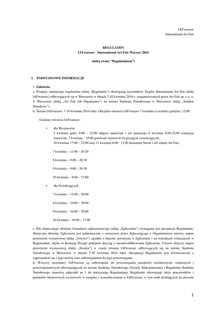 IAFwarsaw International Art Fair REGULAMIN IAFwarsaw - International Art Fair Warsaw 2016 (dalej zwany “Regulaminem”) I. PODSTAWOWE INFORMACJE 1. Założenia a. Przepisy niniejszego regulaminu (dalej „Regulamin”) obowiązują uczestników Targów International Art Fair (dalej IAFwarsaw) odbywających się w Warszawie w dniach 7-10 kwietnia 2016 r. zorganizowanych przez Art Fair sp. z o. o. w Warszawie (dalej „Art Fair lub Organizator”) na terenie Stadionu Narodowego w Warszawie (dalej „Stadion Narodowy”). b. Termin IAFwarsaw: 7-10 kwietnia 2016 roku. Oficjalne otwarcie IAFwarsaw 7 kwietnia (czwartek) godzina: 12:00. Godziny otwarcia IAFwarsaw: • dla Wystawców: 5 kwietnia godz. 8:00 – 22:00 objęcie stanowisk i ich aranżacja; 6 kwietnia 8:00-22:00 aranżacja stanowisk; 7 kwietnia – 10:00 gotowość stanowisk do przyjęcia zwiedzających; 10 kwietnia 17:00 – 22:00 oraz 11 kwietnia 8:00 - 12.00 demontaż Stoisk i ich zdanie Art Fair; 7 kwietnia – 11:00 – 20:30 8 kwietnia – 9:00 – 20:30 9 kwietnia – 9:00 – 20:30 10 kwietnia – 9:00 – 17:00 • dla Zwiedzających 7 kwietnia – 12:00 – 20:00 8 kwietnia – 10:00 – 20:00 9 kwietnia – 10:00 – 20:00 10 kwietnia – 10:00 – 17:00 c. Dla skutecznego złożenia formularza zgłoszeniowego (dalej „Zgłoszenie”) wymagana jest akceptacja Regulaminu. Skuteczne złożenie Zgłoszenia jest jednoznaczne z zawarciem przez Zgłaszającego z Organizatorem umowy najmu przestrzeni wystawowej (dalej „Umowa”) zgodnie z danymi zawartymi w Zgłoszeniu i na warunkach wskazanych w Regulaminie, chyba że Komisja Przyjęć podejmie decyzję o niezakwalifikowaniu Zgłoszenia. Umowa dotyczy najmu przestrzeni wystawowej (dalej „Stoiska”) w czasie trwania IAFwarsaw odbywających się na terenie Stadionu Narodowego w Warszawie w dniach 7-10 kwietnia 2016 roku. Akceptacja Regulaminu jest równoznaczna z zapoznaniem się z jego treścią oraz zobowiązaniem do jego przestrzegania. d. Wszyscy uczestnicy IAFwarsaw są zobowiązani do przestrzegania przepisów technicznych, sanitarnych i przeciwpożarowych obowiązujących na terenie Stadionu Narodowego (Zasady funkcjonowania i Regulamin Stadionu Narodowego stanowią załącznik nr 1 do niniejszego Regulaminu). Regulamin obowiązuje także pracowników i partnerów biznesowych wystawców w związku z uczestniczeniem w IAFwarsaw, w tym osób działających na zlecenie 1 wystawców (tj. m.in. osoby dokonujące innych prac specjalistycznych). e. Podmiotem odpowiedzialnym za organizację IAFWarsaw oraz uprawnionym do wynajęcia Stoiska jest Art Fair. 2. Cele Targi IAFwarsaw to międzynarodowe targi sztuki 20. i 21. wieku, których celem jest pośrednictwo w sprzedaży sztuk wizualnych, wzornictwa nowoczesnego oraz mody. Cel ten jest realizowany poprzez: • dostarczenie Stoisk dedykowanych poszczególnym działom tematycznym targów • stworzenie płaszczyzny biznesowej mającej na celu umożliwić wystawcom kontakt z partnerami biznesowymi • upowszechnienie informacji na temat IAFwarsaw w opinii publicznej. Art Fair przykłada olbrzymią wagę do zachowania wysokich standardów podczas prezentacji ofert wystawców i przejrzystości struktury całego wydarzenia. Art Fair będzie dbało o zachowanie wysokiego poziomu merytorycznego IAFwarsaw dzięki współpracy z dyrektorem IAFwarsaw oraz Radą Programową IAFwarsaw. Rada Programowa działa we współpracy z organizatorem targów. Rada Programowa podejmuje decyzję o tym, które zgłoszenia nadesłane przez wystawców spełniają wszystkie warunki i zostaną dopuszczone do prezentacji podczas IAFwarsaw. W IAFwarsaw mogą uczestniczyć tylko i wyłącznie podmioty prezentujące ofertę zgodną z zakresem tematycznym IAFwarsaw. Art Fair zastrzega sobie prawo do odmowy zawarcia Umowy w przypadku podmiotów, które nie prezentują oferty zgodniej z zakresem tematycznym lub odbiegają od standardów przyjętych przez IAFwarsaw. II. WARUNKI ZGŁOSZENIA 1. Formularz zgłoszeniowy Każdy wystawca, który wyraża chęć udziału w targach IAFwarsaw zobowiązany jest do wypełnienia w całości Zgłoszenia dostępnego na stronie internetowej www.art-fair.pl oraz wysłania go do Art Fair w terminie do 30.10.2015 roku. 2. Kategorie Stoisk a. Sztuki wizualne. Wielkości Stoisk: (XS) X-Small: 9 m² (S) Small: 16 m² / 18 m² (M) Medium: 20 m² / 22 m² (L) Large: 25 m² / 27 m² (XL)X-Large: 33 m² i większe Przestrzeń dostępna dla: - galerii, 16 m² / 18 m² / 20 m² / 22 m² / 25 m² / 27 m² / 33 m² - grup artystycznych, 16 m² / 18 m² / 20 m² / 22 m² / 25 m² / 27 m² / 33 m² - indywidualnych artystów 9 m². Nie więcej niż dwóch artystów (2) może być prezentowanych na Stoisku o wielkości S, nie więcej niż czterech artystów (4) może być prezentowanych na Stoisku o wielkości M, i nie więcej niż sześciu (6) artystów może być prezentowanych na Stoisku o wielkości L i XL. Istnieje możliwość łączenia sąsiadujących ze sobą Stoisk. b. Wzornictwo nowoczesne Wielkość Stoisk: 9 m² / 16 m² / 18 m² / 20 m² / 25 m² / 29 m² Przestrzeń dostępna dla: - projektantów wzornictwa nowoczesnego posiadających własny warsztat produkcyjny lub zlecający podwykonawcom produkcję swoich projektów, prowadzących sprzedaż produktów w sklepach w pełnym wymiarze godzin, - producentów wzornictwa nowoczesnego współpracujących na stałe z projektantami, prowadzących sprzedaż produktów w sklepach stacjonarnych czynnych w pełnym wymiarze godzin. Istnieje możliwość łączenia sąsiadujących ze sobą Stoisk. 2 c. Moda. Wielkość Stoisk - przestrzeń dla marek ubraniowych i dodatków modowych - 9 m² / 18 m² / 20 m² - przestrzeń dla biżuterii - 2 m.b. / 4 m.b./ 6 m.b. (przestrzeń wspólna z wyposażeniem w postaci kubików) Przestrzeń dostępna dla: - młode marki - projektanci prowadzących sprzedaż internetową (ubrania, biżuteria, dodatki modowe) - domów mody czyli projektantów i producen