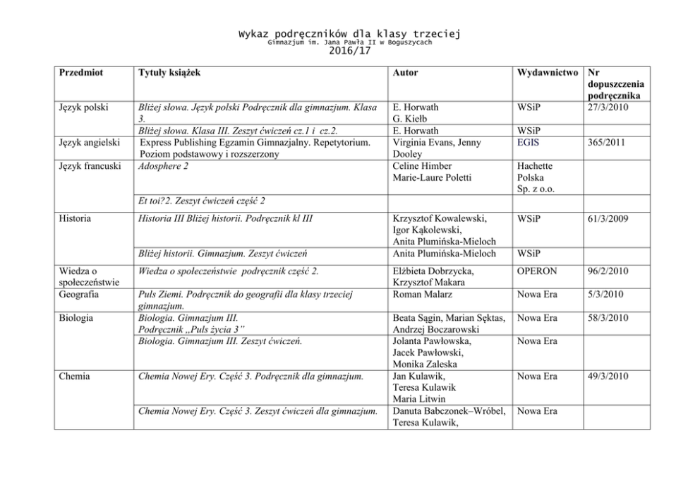 Wykaz podręczników dla klasy trzeciej Gimnazjum im. Jana Pawła II w Boguszycach 2016/17 Przedmiot Tytuły książek Autor Język polski Bliżej słowa. Język polski Podręcznik dla gimnazjum. Klasa 3. Bliżej słowa. Klasa III. Zeszyt ćwiczeń cz.1 i cz.2. Express Publishing Egzamin Gimnazjalny. Repetytorium. Poziom podstawowy i rozszerzony Adosphere 2 E. Horwath G. Kiełb E. Horwath Virginia Evans, Jenny Dooley Celine Himber Marie-Laure Poletti Język angielski Język francuski Wydawnictwo Nr dopuszczenia podręcznika WSiP 27/3/2010 WSiP EGIS 365/2011 Hachette Polska Sp. z o.o. Et toi?2. Zeszyt ćwiczeń część 2 Historia Historia III Bliżej historii. Podręcznik kl III Bliżej historii. Gimnazjum. Zeszyt ćwiczeń Wiedza o społeczeństwie Geografia Biologia Chemia Wiedza o społeczeństwie podręcznik część 2. Puls Ziemi. Podręcznik do geografii dla klasy trzeciej gimnazjum. Biologia. Gimnazjum III. Podręcznik ,,Puls życia 3” Biologia. Gimnazjum III. Zeszyt ćwiczeń. Chemia Nowej Ery. Część 3. Podręcznik dla gimnazjum. Chemia Nowej Ery. Część 3. Zeszyt ćwiczeń dla gimnazjum. Krzysztof Kowalewski, Igor Kąkolewski, Anita Plumińska-Mieloch Anita Plumińska-Mieloch WSiP Elżbieta Dobrzycka, Krzysztof Makara Roman Malarz OPERON 96/2/2010 Nowa Era 5/3/2010 Beata Sągin, Marian Sęktas, Andrzej Boczarowski Jolanta Pawłowska, Jacek Pawłowski, Monika Zaleska Jan Kulawik, Teresa Kulawik Maria Litwin Danuta Babczonek–Wróbel, Teresa Kulawik, Nowa Era 58/3/2010 61/3/2009 WSiP Nowa Era Nowa Era Nowa Era 49/3/2010 Wykaz podręczników dla klasy trzeciej Gimnazjum im. Jana Pawła II w Boguszycach 2016/17 Maria Litwin Edukacja dla bezpieczeństwa Edukacja dla bezpieczeństwa. Podręcznik dla gimnazjum. Przedmiot Tytuły książek Fizyka Spotkania z fizyką. Podręcznik dla gimnazjum. Część 3i 4 Matematyka Matematyka wokół nas. Gimnazjum. Podręcznik dla klasy 3 Informatyka Zajęcia artystyczne muzyczne Zajęcia artystyczne plastyczne Zajęcia techniczne Wychowanie do życia w rodzinie Matematyka wokół nas. Gimnazjum. Zeszyt ćwiczeń dla klasy3. Część 1 Informatyka Europejczyka. Podręcznik dla gimnazjum. Edycja: Windows XP, , MS Office 2003,. Wydanie III Informatyka Europejczyka. Zeszyt ćwiczeń dla gimnazjum. Edycja: Windows XP, Linux Ubuntu , MS Office 2003,OpenOffice.org ---------------------------------------------------- Mieczysław Borowiecki, Zbigniew Pytasz, Edward Rygała Autor Wydawnictwo Szkolne PWN 193/2009 Wydawnictwo G. Francuz-Ornat, T. Kulawik, Maria Nowotny-Różańska Anna Drążek, Ewa Duvnjak, Ewa Kokiernak-Jurkiewicz B.Podobińska, T.Przetacznik-Dąbrowa Jolanta Pańczyk Nowa Era Nr dopuszczenia podręcznika 93/4/2011 WSiP 62/3/2010 Jolanta Pańczyk Helion Urszula Białka Urszula Białka, Jerzy Chrabąszcz Teresa Król, Krystyna Maśnik, Wojciech Operon Operon 199/2009 Rubikon 205/2009 WSiP Helion 162/2009 -------------------------------------------------------Zajęcia techniczne. Podręcznik Zeszyt tematyczny z ćwiczeniami dla ucznia. Wychowanie komunikacyjne. Wędrując ku dorosłości. Podręcznik dla gimnazjum kl I-III. Wykaz podręczników dla klasy trzeciej Gimnazjum im. Jana Pawła II w Boguszycach 2016/17 Religia Śledziński, Grażyna Węglarczyk, Jadwiga Wronicz Podręcznik do religii dla klasy III gimnazjum. Chodźmy Władysław Kubik S J razem WAM AZ-33-01/ 10 KR-4/13