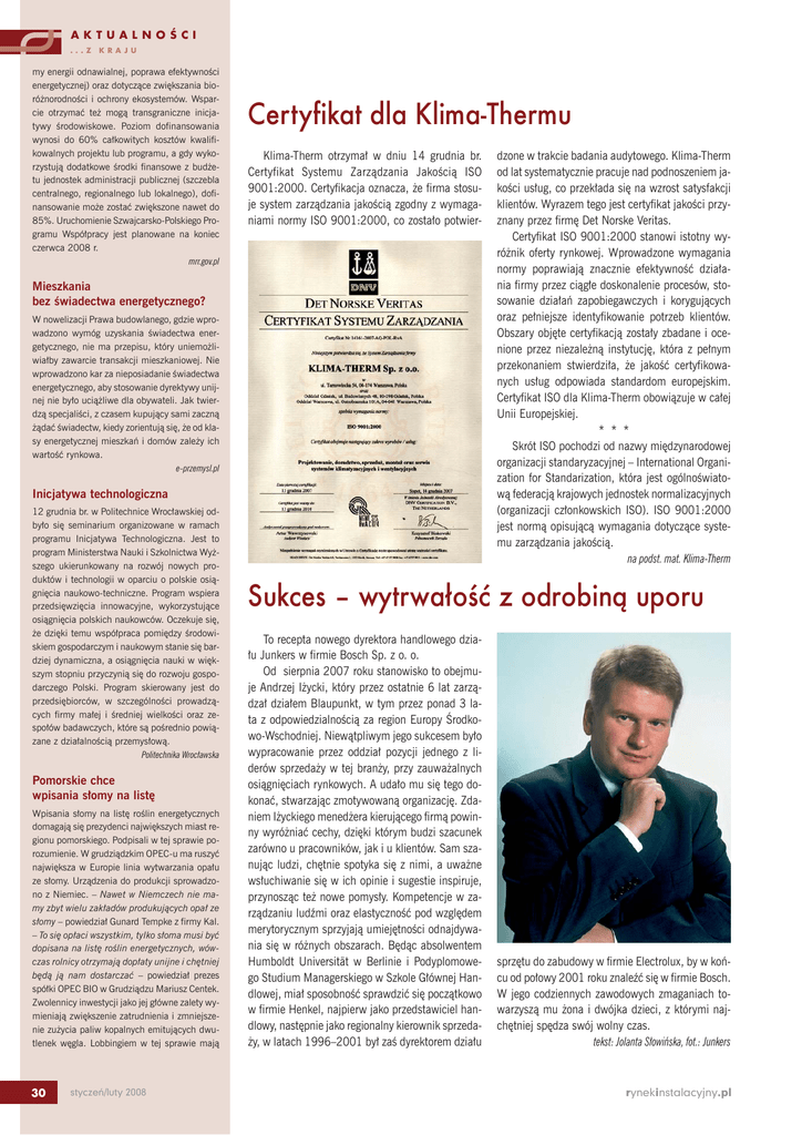 AKTUALNOŚCI ...Z KRAJU my energii odnawialnej, poprawa efektywności energetycznej) oraz dotyczące zwiększania bioróżnorodności i ochrony ekosystemów. Wsparcie otrzymać też mogą transgraniczne inicjatywy środowiskowe. Poziom dofinansowania wynosi do 60% całkowitych kosztów kwalifikowalnych projektu lub programu, a gdy wykorzystują dodatkowe środki finansowe z budżetu jednostek administracji publicznej (szczebla centralnego, regionalnego lub lokalnego), dofinansowanie może zostać zwiększone nawet do 85%. Uruchomienie Szwajcarsko-Polskiego Programu Współpracy jest planowane na koniec czerwca 2008 r. mrr.gov.pl Certyfikat dla Klima-Thermu Klima-Therm otrzymał w dniu 14 grudnia br. Certyfikat Systemu Zarządzania Jakością ISO 9001:2000. Certyfikacja oznacza, że firma stosuje system zarządzania jakością zgodny z wymaganiami normy ISO 9001:2000, co zostało potwier- Mieszkania bez świadectwa energetycznego? W nowelizacji Prawa budowlanego, gdzie wprowadzono wymóg uzyskania świadectwa energetycznego, nie ma przepisu, który uniemożliwiałby zawarcie transakcji mieszkaniowej. Nie wprowadzono kar za nieposiadanie świadectwa energetycznego, aby stosowanie dyrektywy unijnej nie było uciążliwe dla obywateli. Jak twierdzą specjaliści, z czasem kupujący sami zaczną żądać świadectw, kiedy zorientują się, że od klasy energetycznej mieszkań i domów zależy ich wartość rynkowa. e-przemysl.pl Inicjatywa technologiczna 12 grudnia br. w Politechnice Wrocławskiej odbyło się seminarium organizowane w ramach programu Inicjatywa Technologiczna. Jest to program Ministerstwa Nauki i Szkolnictwa Wyższego ukierunkowany na rozwój nowych produktów i technologii w oparciu o polskie osiągnięcia naukowo-techniczne. Program wspiera przedsięwzięcia innowacyjne, wykorzystujące osiągnięcia polskich naukowców. Oczekuje się, że dzięki temu współpraca pomiędzy środowiskiem gospodarczym i naukowym stanie się bardziej dynamiczna, a osiągnięcia nauki w większym stopniu przyczynią się do rozwoju gospodarczego Polski. Program skierowany jest do przedsiębiorców, w szczególności prowadzących firmy małej i średniej wielkości oraz zespołów badawczych, które są pośrednio powiązane z działalnością przemysłową. Politechnika Wrocławska Pomorskie chce wpisania słomy na listę Wpisania słomy na listę roślin energetycznych domagają się prezydenci największych miast regionu pomorskiego. Podpisali w tej sprawie porozumienie. W grudziądzkim OPEC-u ma ruszyć największa w Europie linia wytwarzania opału ze słomy. Urządzenia do produkcji sprowadzono z Niemiec. – Nawet w Niemczech nie mamy zbyt wielu zakładów produkujących opał ze słomy – powiedział Gunard Tempke z firmy Kal. – To się opłaci wszystkim, tylko słoma musi być dopisana na listę roślin energetycznych, wówczas rolnicy otrzymają dopłaty unijne i chętniej będą ją nam dostarczać – powiedział prezes spółki OPEC BIO w Grudziądzu Mariusz Centek. Zwolennicy inwestycji jako jej główne zalety wymieniają zwiększenie zatrudnienia i zmniejszenie zużycia paliw kopalnych emitujących dwutlenek węgla. Lobbingiem w tej sprawie mają 30 styczeń/luty 2008 dzone w trakcie badania audytowego. Klima-Therm od lat systematycznie pracuje nad podnoszeniem jakości usług, co przekłada się na wzrost satysfakcji klientów. Wyrazem tego jest certyfikat jakości przyznany przez firmę Det Norske Veritas. Certyfikat ISO 9001:2000 stanowi istotny wyróżnik oferty rynkowej. Wprowadzone wymagania normy poprawiają znacznie efektywność działania firmy przez ciągłe doskonalenie procesów, stosowanie działań zapobiegawczych i korygujących oraz pełniejsze identyfikowanie potrzeb klientów. Obszary objęte certyfikacją zostały zbadane i ocenione przez niezależną instytucję, która z pełnym przekonaniem stwierdziła, że jakość certyfikowanych usług odpowiada standardom europejskim. Certyfikat ISO dla Klima-Therm obowiązuje w całej Unii Europejskiej. * * * Skrót ISO pochodzi od nazwy międzynarodowej organizacji standaryzacyjnej – International Organization for Standarization, która jest ogólnoświatową federacją krajowych jednostek normalizacyjnych (organizacji członkowskich ISO). ISO 9001:2000 jest normą opisującą wymagania dotyczące systemu zarządzania jakością. na podst. mat. Klima-Therm Sukces – wytrwa³oœæ z odrobin¹ uporu To recepta nowego dyrektora handlowego działu Junkers w firmie Bosch Sp. z o. o. Od sierpnia 2007 roku stanowisko to obejmuje Andrzej Iżycki, który przez ostatnie 6 lat zarządzał działem Blaupunkt, w tym przez ponad 3 lata z odpowiedzialnością za region Europy Środkowo-Wschodniej. Niewątpliwym jego sukcesem było wypracowanie przez oddział pozycji jednego z liderów sprzedaży w tej branży, przy zauważalnych osiągnięciach rynkowych. A udało mu się tego dokonać, stwarzając zmotywowaną organizację. Zdaniem Iżyckiego menedżera kierującego firmą powinny wyróżniać cechy, dzięki którym budzi szacunek zarówno u pracowników, jak i u klientów. Sam szanując ludzi, chętnie spotyka się z nimi, a uważne wsłuchiwanie się w ich opinie i sugestie inspiruje, przynosząc też nowe pomysły. Kompetencje w zarządzaniu ludźmi oraz elastyczność pod względem merytorycznym sprzyjają umiejętności odnajdywania się w różnych obszarach. Będąc absolwentem Humboldt Universität w Berlinie i Podyplomowego Studium Managerskiego w Szkole Głównej Handlowej, miał sposobność sprawdzić się początkowo w firmie Henkel, najpierw jako przedstawiciel handlowy, następnie jako regionalny kierownik sprzedaży, w latach 1996–2001 był zaś dyrektorem działu sprzętu do zabudowy w firmie Electrolux, by w końcu od połowy 2001 roku znaleźć się w firmie Bosch. W jego codziennych zawodowych zmaganiach towarzyszą mu żona i dwójka dzieci, z którymi najchętniej spędza swój wolny czas. tekst: 