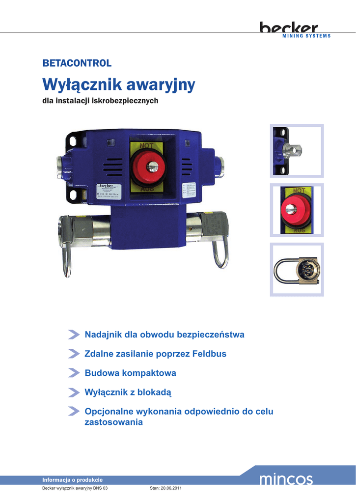 BETACONTROL Wyłącznik awaryjny dla instalacji iskrobezpiecznych Nadajnik dla obwodu bezpieczeństwa Zdalne zasilanie poprzez Feldbus Budowa kompaktowa Wyłącznik z blokadą Opcjonalne wykonania odpowiednio do celu zastosowania Informacja o produkcie Becker wyłącznik awaryjny BNS 03 Stan: 20.06.2011 Szczegóły techniczne Wyłącznik awaryjny dla instalacji iskrobezpiecznych Właściwości eksploatacyjne Wyłącznik awaryjny (BNS 03, podzespół BSZ 01) służy do wyłączenia obwodu bezpieczeństwa w systemie Feldbus BETACONTROL. Uruchomienie wyłącznika awaryjnego zrealizowano poprzez standardowe wyposażenie w przycisk uderzany. Wyłącznik awaryjny posiada obudowę wykonaną jako ocynkowany odlew i posiadając staranne uszczelnienie, jest przeznaczony do ekstremalnych warunków środowiskowych i obciążeń mechanicznych. Kompaktowa budowa urządzenia umożliwia zabudowę w ciasnym otoczeniu np. w ścianie. Zadziałanie na wyłącznik awaryjny jest sygnalizowane przez zintegrowaną z urządzeniem diodę LED. W stanie zadziałania, przycisk uderzany jest w stanie zablokowanym i ten stan jest zabezpieczony przez blokujący się mechanizm zatrzaskowy. Urządzenie jest zasilane bezpośrednio systemem przewodów z oddalonego źródła. Zastosowany konfekcjonowany system wtykowy Becker (typu BS 08) sprawia, że system przewodów jest łatwy w montażu a wykonywanie połączeń obwodu bezpieczeństwa odbywa się małym kosztem. Wyłącznik awaryjny jako samodzielne urządzenie Feldbus, jest nadzorowany przez system sterowania. Dodatkowe warianty dają możliwość zastosowania urządzenia w różnorodnych warunkach otoczenia. Wyłącznik awaryjny strona Szczegóły techniczne Wyłącznik awaryjny dla instalacji iskrobezpiecznych Dodatkowe warianty Mechanizm linkowy Wyłącznik awaryjny może być zastosowany również jako wyłącznik linkowy. Dla tego zastosowania wyłącznik awaryjny wyposażony jest w dwie osie na linki pociągane. Mechanizm linkowy wyposażony jest w sprężynę o sile naciągu 150 N. Przymocowana do mechanizmu linka pociągana funkcjonuje obok przycisku wyłącznika awaryjnego jako równorzędny element do zablokowania obwodu bezpieczeństwa w stanie wyłączenia. + Funkcjonalność Nadajnik akustyczny piezo Nadajnik akustyczny piezo jest stosowany wówczas, gdy wymagane jest ostrzeżenie pracowników głośnym sygnałem dźwiękowym przed rozruchem urządzenia. Sygnał dźwiękowy zostaje wyzwalany przez oprogramowanie układu sterowania. + Bezpieczeństwo Wyłącznik przyciskowy (niestabilny) Wyłącznik awaryjny BNS 03 może być również wykonany w formie wyłącznika przyciskowego (niestabilnego). Funkcja przyciskowa wykorzystywana jest do sygnalizacji w urządzeniach transportu linowego (sygnały „Stój“, „Podnoś” i „Opuszczaj”). Przewody sygnałowe magistrali Feldbus systemu BETACONTROL są traktowane w tym zastosowaniu tak jak obwód bezpieczeństwa. + Funkcjonalność Kombinacja z urządzeniem głośnomówiącym Wyłącznik awaryjny może posiadać we wszystkich wariantach urządzenie głośnomówiące (patrz informacja o produkcie „Urządzenie głośnomówiące BFC 03/*“). Urządzenie głośnomówiące służy do przekazywanie informacji akustycznych i może być używane do prowadzenia rozmów, przekazywania komunikatów alarmowych, sygnalizacji i ostrzeżenia przed uruchomieniem urządzeń. Urządzenie głośnomówiące i wyłącznik awaryjny tworzą razem multifunkcjonalną jednostkę komunikacji i ostrzegania dla komunikatów o stanie pracy i zagrożeniach. + Komunikacja strona Parametry techniczne Wyłącznik awaryjny dla instalacji iskrobezpiecznych Parametry elektryczne Parametry mechaniczne Napięcie zasilania 9,0..12 V DC Materiał odlew cynkowany Maks. pobór prądu (bez piezo) 10 mA Powierzchnia lakierowanie piecowe Maks. pobór prądu (z piezo) 23 mA Barwa RAL5015 (nieb.) Siła pociągania 150 N Szerokość 120 mm Ochrona przeciwwybuchowa Rodzaj ochrony I M2 EEx ia I Wysokość 220 mm Certyfikat BVS 03 ATEX E 373 Głębokość 100 mm Ciężar 5 kg Dane techniczne są wartościami orientacyjnymi. Jeżeli produkt będzie zintegrowany w systemie lub będzie współpracował z innymi urządzeniami, dopuszczalne wartości pracy mogą odbiegać od podanych wartości orientacyjnych . Zmiany techniczne zastrzeżone. Know-How. Performance. Reliability. Becker-Warkop Sp. z o.o. l ul. Przemysłowa 11 l 44-266 Świerklany l Polska Tel. +48 32 432 99 00 l Fax +48 32 432 99 01 l [email protected] strona l www.becker-mining.pl