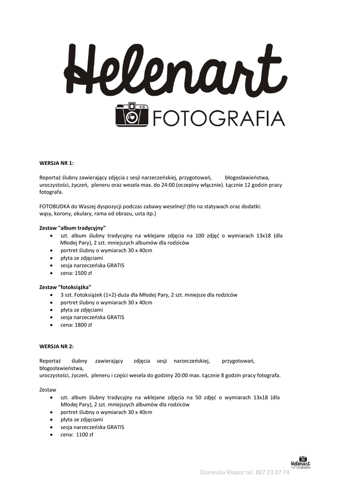 WERSJA NR 1: Reportaż ślubny zawierający zdjęcia z sesji narzeczeńskiej, przygotowań, błogosławieństwa, uroczystości, życzeń, pleneru oraz wesela max. do 24:00 (oczepiny włącznie). Łącznie 12 godzin pracy fotografa. FOTOBUDKA do Waszej dyspozycji podczas zabawy weselnej! (tło na statywach oraz dodatki: wąsy, korony, okulary, rama od obrazu, usta itp.) Zestaw "album tradycyjny"  szt. album ślubny tradycyjny na wklejane zdjęcia na 100 zdjęć o wymiarach 13x18 (dla Młodej Pary), 2 szt. mniejszych albumów dla rodziców  portret ślubny o wymiarach 30 x 40cm  płyta ze zdjęciami  sesja narzeczeńska GRATIS  cena: 1500 zł Zestaw "fotoksiążka"  3 szt. Fotoksiążek (1+2)-duża dla Młodej Pary, 2 szt. mniejsze dla rodziców  portret ślubny o wymiarach 30 x 40cm  płyta ze zdjęciami  sesja narzeczeńska GRATIS  cena: 1800 zł WERSJA NR 2: Reportaż ślubny zawierający zdjęcia sesji narzeczeńskiej, przygotowań, błogosławieństwa, uroczystości, życzeń, pleneru i części wesela do godziny 20:00 max. Łącznie 8 godzin pracy fotografa. Zestaw  szt. album ślubny tradycyjny na wklejane zdjęcia na 50 zdjęć o wymiarach 13x18 (dla Młodej Pary), 2 szt. mniejszych albumów dla rodziców  portret ślubny o wymiarach 30 x 40cm  płyta ze zdjęciami  sesja narzeczeńska GRATIS  cena: 1100 zł Dominika Kłopot tel. 887 23 07 74 Zestaw "fotoksiążka" 3 szt. Fotoksiążek (1+2)-duża dla Młodej Pary, 2 szt. mniejsze dla rodziców portret ślubny o wymiarach 30 x 40cm płyta ze zdjęciami sesja narzeczeńska GRATIS cena: 1300 zł WERSJA NR 3: Reportaż ślubny zawierający zdjęcia z uroczystości (kościół lub USC), życzeń oraz zdjęcia na sali (do pierwszego tańca) . Łącznie maksymalnie 3 godziny pracy fotografa. Zestaw ”album tradycyjny”  szt. album ślubny tradycyjny na wklejane zdjęcia na 20 zdjęć o wymiarach 13x18 (dla Młodej Pary), portret ślubny o wymiarach 30 x 40cm  płyta ze zdjęciami  cena: 350 zł Poza Wrocławiem, Oławą do ceny doliczane jest 100 zł za dojazd do 100 km. WERSJA NR 4: Sesja plenerowa –od 1,5 do 2 godzin pracy fotografa. Zestaw ”album tradycyjny”  szt. album ślubny tradycyjny na wklejane zdjęcia na 20 zdjęć o wymiarach 13x18 (dla Młodej Pary), portret ślubny o wymiarach 30 x 40cm  płyta ze zdjęciami  cena: 200 zł Poza Wrocławiem i Oławą do ceny doliczane jest 100 zł za dojazd do 100 km. Termin jest zarezerwowany po podpisaniu umowy i wpłaceniu zaliczki w wysokości 25% ceny. UWAGA! Jeżeli nie jesteście pewni, który zestaw wybieracie (1 lub2) to spokojnie tą decyzję możecie podjąć nawet po ślubie. Kontakt: [email protected] tel.: 887 230 774 Ceny obowiązują w 2014/2015 roku Dominika Kłopot tel. 887 23 07 74
