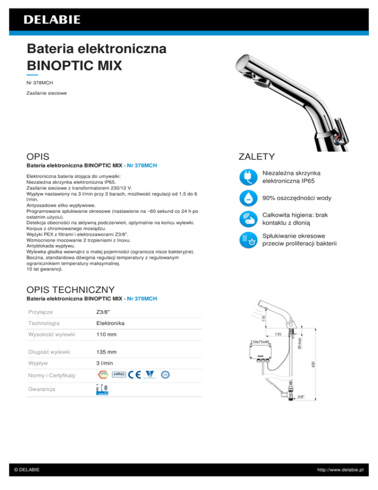 Bateria elektroniczna BINOPTIC MIX Nr 378MCH Zasilanie sieciowe OPIS ZALETY Bateria elektroniczna BINOPTIC MIX - Nr 378MCH Elektroniczna bateria stojąca do umywalki: Niezależna skrzynka elektroniczna IP65. Zasilanie sieciowe z transformatorem 230/12 V. Wypływ nastawiony na 3 l/min przy 3 barach, możliwość regulacji od 1,5 do 6 l/min. Antyosadowe sitko wypływowe. Programowane spłukiwanie okresowe (nastawione na ~60 sekund co 24 h po ostatnim użyciu). Detekcja obecności na aktywną podczerwień, optymalnie na końcu wylewki. Korpus z chromowanego mosiądzu. Wężyki PEX z filtrami i elektrozaworami Z3/8". Wzmocnione mocowanie 2 trzpieniami z Inoxu. Antyblokada wypływu. Wylewka gładka wewnątrz o małej pojemności (ogranicza nisze bakteryjne). Boczna, standardowa dźwignia regulacji temperatury z regulowanym ogranicznikiem temperatury maksymalnej. 10 lat gwarancji. Niezależna skrzynka elektroniczna IP65 90% oszczędności wody Całkowita higiena: brak kontaktu z dłonią Spłukiwanie okresowe przeciw proliferacji bakterii OPIS TECHNICZNY Bateria elektroniczna BINOPTIC MIX - Nr 378MCH Przyłącze Z3/8" Technologia Elektronika Wysokość wylewki 110 mm Długość wylewki 135 mm Wypływ 3 l/min Normy i Certyfikaty Gwarancja © DELABIE http://www.delabie.pl