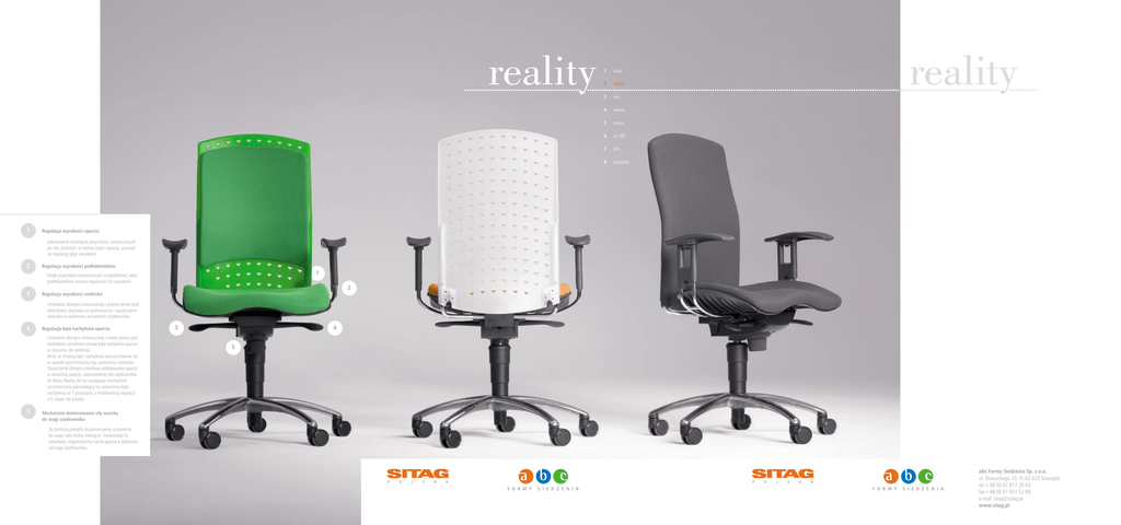 reality 1 1 realy 2 reality 3 vito 4 natura 5 estate 6 el-100 7 plio 8 parlando reality Regulacja wysokoÊci oparcia Jednoczesne wciÊni´cie przycisków umieszczonych po obu stronach, w dolnej cz´Êci oparcia, pozwoli na regulacj´ jego wysokoÊci. 2 Regulacja wysokoÊci pod∏okietników 1 Dzi´ki przyciskom umieszczonym w plastikowej cz´Êci pod∏okietników mo˝na regulowaç ich wysokoÊç. 3 2 Regulacja wysokoÊci siedziska Uniesienie dêwigni umieszczonej z prawej strony pod siedziskiem pozwala na podnoszenie i opuszczanie siedziska w zale˝noÊci od potrzeb u˝ytkownika. 4 Regulacja kàta nachylenia oparcia Uniesienie dêwigni umieszczonej z lewej strony pod siedziskiem umo˝liwia zmian´ kàta nachylenia oparcia w stosunku do siedziska. Wraz ze zmianà kàta nachylenia oparcia zmienia si´ w sposób synchroniczny kàt ustawienia siedziska. Opuszczenie dêwigni umo˝liwia zablokowanie oparcia w dowolnej pozycji, odpowiedniej dla u˝ytkownika. W fotelu Reality de lux wyst´puje mechanizm synchroniczny pozwalajàcy na ustawienie kàta nachylenia w 7 pozycjach, z mo˝liwoÊcià regulacji o 5 stopni do przodu. 5 3 4 5 Mechanizm dostosowania si∏y nacisku do wagi u˝ytkownika Za pomocà pokr´t∏a dopasowujemy ustawienie do wagi cia∏a osoby siedzàcej. Gwarantuje to optymalny i ergonomiczny nacisk oparcia w zale˝noÊci od wagi u˝ytkownika. F O R M Y S I E D Z E N I A F O R M Y S I E D Z E N I A abc Formy Siedzenia Sp. z o.o. ul. S∏owackiego 10, PL-62-020 Swarz´dz tel.+48 (0) 61 817 33 63 fax +48 (0) 61 651 52 89 e-mail: [email protected] www.sitag.pl F C E B reality A D mechanizm wygody Najlepszym s∏owem charekteryzujàcym Reality jest „dopasowanie”. Form´ krzes∏a zsynchronizowaliÊmy z u˝ytymi do jego produkcji materia∏ami, ich faktury – z kolorami oparç i tapicerki, a zamontowane mechanizmy – z ró˝norodnymi przeznaczeniami krzes∏a. W ten sposób uzyskaliÊmy w pe∏ni zharmonizowany i funkcjonalny produkt. G 209028 A B C D E F G 208820 A B C D E F 49 98 45 63 48 60 G 209828 48-60 107-119 46 59 55 65 A B C D E F G 209822 A B C D E F 49 98 45 63 48 64 50 101 46 55 50 62 G 209520 A B C D E F 50 100 45 56 48 63 G 209625 A B C D E F 50 101 46 55 50 62 R 209020 A 41-54 B 96-109 C 45 D 62 E 48 F 63 R 209022 A B C D E F 41-54 96-109 45 62 48 63 R 209030 A B C D E F 41-54 96-109 45 62 48 63 R 202620 A B C D E F 41-54 96-109 45 62 48 63