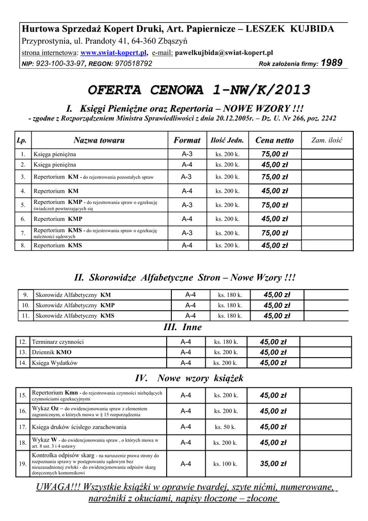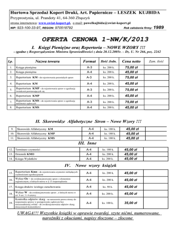 Hurtowa Sprzedaż Kopert Druki, Art. Papiernicze – LESZEK KUJBIDA Przyprostynia, ul. Prandoty 41, 64-360 Zbąszyń strona internetowa: www.swiat-kopert.pl, e-mail: [email protected] NIP: 923-100-33-97, REGON: 970518792 Rok założenia firmy: 1989 OFERTA CENOWA 1-NW/K/2013 I. Księgi Pieniężne oraz Repertoria – NOWE WZORY !!! - zgodne z Rozporządzeniem Ministra Sprawiedliwości z dnia 20.12.2005r. – Dz. U. Nr 266, poz. 2242 Nazwa towaru Lp. Format Ilość Jedn. Cena netto 1. Księga pieniężna A-3 ks. 200 k. 2. Księga pieniężna A-4 ks. 200 k. 75,00 zł 45,00 zł 3. Repertorium KM - do rejestrowania pozostałych spraw A-3 ks. 200 k. 75,00 zł 4. Repertorium KM A-4 ks. 200 k. 45,00 zł 5. Repertorium KMP - do rejestrowania spraw o egzekucję A-3 ks. 200 k. 75,00 zł 6. Repertorium KMP A-4 ks. 200 k. 45,00 zł 7. Repertorium KMS - do rejestrowania spraw o egzekucję A-3 ks. 200 k. 75,00 zł 8. Repertorium KMS A-4 ks. 200 k. 45,00 zł świadczeń powtarzających się należności sądowych Zam. ilość II. Skorowidze Alfabetyczne Stron – Nowe Wzory !!! A-4 ks. 180 k. 10. Skorowidz Alfabetyczny KMP A-4 ks. 180 k. 11. Skorowidz Alfabetyczny KMS A-4 ks. 180 k. 9. Skorowidz Alfabetyczny KM 45,00 zł 45,00 zł 45,00 zł III. Inne 12. Terminarz czynności A-4 ks. 180 k. 13. Dziennik KMO A-4 ks. 200 k. 14. Księga Wydatków A-4 ks. 200 k. 45,00 zł 45,00 zł 45,00 zł IV. Nowe wzory książek 15. Repertorium Kmn - do rejestrowania czynności niebędących A-4 ks. 200 k. 45,00 zł 16. Wykaz Oz – do ewidencjonowania spraw z elementem A-4 ks. 200 k. 45,00 zł 17. Księga druków ścisłego zarachowania A-4 ks. 50 k. 45,00 zł 18. Wykaz W - do ewidencjonowania spraw , o których mowa w A-4 ks. 200 k. 45,00 zł A-4 ks. 100 k. 35,00 zł czynnościami egzekucyjnymi zagranicznym, o których mowa w § 15 rozporządzenia art. 8 ust. 3 i 4 ustawy Kontrolka odpisów skarg - na naruszenie prawa strony do 19. rozpoznania sprawy w postępowaniu sądowym bez nieuzasadnionej zwłoki - do ewidencjonowania odpisów skarg doręczonych komornikowi UWAGA!!! Wszystkie książki w oprawie twardej, szyte nićmi, numerowane, narożniki z okuciami, napisy tłoczone – złocone V. Okładki do akt (bigowane – format 320 x 480 mm) 20. Okładka – zielona (pastelowa) 320 x 240 mm sztuka 0,45 zł 21. Okładka – niebieska (pastelowa) 320 x 240 mm sztuka 0,45 zł 22. Okładka – różowa (pastelowa) 320 x 240 mm sztuka 0,45 zł 23. Okładka – biała (matowa) 320 x 240 mm sztuka 0,45 zł 24. Okładka – żółta jasna 320 x 240 mm sztuka 0,45 zł 25. Okładka – żółta ciemna 320 x 240 mm sztuka 0,45 zł 26. Okładka – czerwona 320 x 240 mm sztuka 0,45 zł 27. Okładka – niebieska 320 x 240 mm sztuka 0,45 zł 28. Okładka – zielona 320 x 240 mm sztuka 0,45 zł 29. Okładka – biała 320 x 240 mm sztuka 0,45 zł 30. Okładka – biała z czerwonym pasem 320 x 240 mm sztuka 0,45 zł 31. Okładka – biała z niebieskim pasem 320 x 240 mm sztuka 0,45 zł 32. Okładka – biała z zielonym pasem 320 x 240 mm sztuka 0,45 zł 33. Okładka – brązowa 320 x 240 mm sztuka 0,45 zł 34. Okładka – brązowa z czerwonym pasem 320 x 240 mm sztuka 0,45 zł 35. Okładka – brązowa z niebieskim pasem 320 x 240 mm sztuka 0,45 zł 36. Okładka – kolor wg. wzoru – bez nadruku 320 x 240 mm sztuka 0,42 zł 37. Okładka – łososiowa 320 x 240 mm sztuka 0,45 zł 38. Okładka + specjalny nadruk - (np. adres + IV KMS) 320 x 420 mm sztuka 0,55 zł 39. Okładka + specjalny nadruk + wpinka 320 x 420 mm sztuka 0,65 zł 40. Okładka + specjalny nadruk + koszulka 320 x 420 mm sztuka 1,00 zł 41. Okładka + specjalny nadruk + koszulka + koperta 320 x 420 mm sztuka 1,10 zł 41a. Okładka + specjalny nadruk + płótno + koszulka + blaszki i wąsy 320 x 420 mm sztuka 1,35 zł WYKONUJEMY OKŁADKI – wg. dowolnych wzorów klienta (kolor, nadruk, wpinka, inne również okładki z cieńszego kartonu). OKŁADKI wykonane z kartonu o gramaturze 350 – 400. POSIADAMY SZEROKĄ GAMĘ RÓŻNYCH KOLORÓW TECZEK. BLIŻSZE INFORMACJE pod numerami telefonów: (0-68) 386-07-48, 386-83-41 lub 0-602-100-045, 0-604-770-063 VI. Druki Samokopiujące ( bloczek – 100 szt.) 42. Wykaz listów poleconych - 20 pozycji (z perforacją) A-4 (1) bloczek 10,00 zł 43. Wykaz listów poleconych - 14 pozycji (z perforacją) A-4 (1) bloczek 10,00 zł 44. Protokół sprzedaży ruchomości A-4 (1) bloczek 10,00 zł 45. Protokół zajęcia ruchomości A-4 (1) bloczek 10,00 zł 46. Protokół zabezpieczenia ruchomości A-4 (1) bloczek 10,00 zł 47. Pocztowa książka nadawcza 110 x 220 mm bloczek (50szt.) 3,50 zł 48. Protokół czynności A-4 (1) bloczek 10,00 zł 49. Protokół czynności A-5 (1) bloczek 5,00 zł 50. Przedłużka do protokołu A-4 (1) bloczek 10,00 zł 51. A-5 (1) bloczek 18,00 zł Kwitariusz przychodowy – klejony, numerowany VII. Druki na papierze zwykłym ( bloczek – 100 szt.) 52. Protokół czynności A-4 (2) bloczek 5,00 zł 53. Protokół czynności A-5 (2) bloczek 3,00 zł 54. Zwrotne potwierdzenie odbioru (karton) 108x153 mm (2) bloczek 3,00 zł 55. Zwrotne potwierdz odbioru + taśma klejąca (1 lub 2 paski taśmy klejącej ) 108x153 mm (2) bloczek 7,00 zł 56. Potwierdz. odbioru komputer. (do drukarek) – gr. 140 108x153 mm (2) bloczek 3,00 zł 57. Potwierdz. odbioru komputer. (do drukarek) – gr. 180 108x153 mm (2) bloczek 3,50 zł 58. Zwrotka cywilna (z perforacją + taśma samoklejąca – do wydruku w drukarkach) 162x114 mm (2) bloczek 7,00 zł 59. Zwrotka cywilna jednostronna (z perforacją + taśma samoklejąca – do wydruku w drukarkach) 162x114 mm (1) bloczek 7,00 zł 60. Wezwanie do uzupełnienia wniosku A-5 (2) bloczek 3,00 zł 61. Wezwanie do złożenia wyjaśnień, informacji A-5 (2) bloczek 3,00 zł 62. Karta rozliczeniowa – NOWY WZÓR !!! 12 pozycji A-4 (1) bloczek 4,20 zł 63. Karta rozliczeniowa (wg. wzoru klienta) A-4 (1) bloczek 5,50 zł VIII. Inne urządzenia do obsługi kancelarii komorniczej 64. Etyk