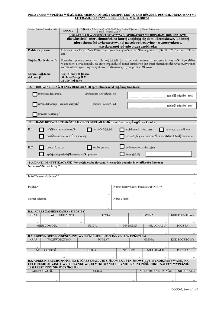 DOGO-2. Deklaracja dla właścicieli nieruchomości letniskowych itp