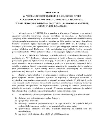 INFORMACJA W PRZEDMIOCIE ZAPROSZENIA DO SKŁADANIA OFERT NA GENERALNE WYKONAWSTWO INWESTYCJI APLISENS S.A. W TSSE EURO-PARK WISŁOSAN PODSTREFA RADOM ORAZ W GMINIE MODLNICA POD KRAKOWEM 1. Informujemy że APLISENS S.A. z siedzibą w Warszawie, Producent przemysłowej aparatury kontrolno-pomiarowej, uzyskał zezwolenie na inwestycję w Tarnobrzeskiej Specjalnej Strefie Ekonomicznej w podstrefie Radom i planuje wybudować tam nowoczesną fabrykę produkującą aparaturę kontrolno – pomiarową. Hala produkcyjna wraz z budynkiem biurowo socjalnym będzie posiadała powierzchnię około 5600 m². Równolegle z tą inwestycją planowane jest wybudowanie zakładu produkującego czujniki temperatury w gminie Modlnica pod Krakowem. Hala produkcyjna tego zakładu będzie posiadała powierzchnię około 1000 m² ( obie inwestycje w dalszej części będą nazwane Inwestycją). 2. Zarząd APLISENS S.A. informuje, że w celu realizacji przedmiotowej Inwestycji na podstawie art. 70(1) Kodeksu cywilnego zamierza wyłonić wykonawcę któremu zostanie powierzone generalne wykonawstwo Inwestycji. W związku z tym Zarząd APLISENS S.A. prosi wszystkich zainteresowanych udziałem w projekcie o przesyłanie informacji, które umożliwią podjęcie decyzji o zaproszeniu danego podmiotu do składania ofert w przetargu (nie prowadzonym w trybie ustawy Prawo zamówień publicznych) na realizację przedmiotowej Inwestycji w charakterze generalnego wykonawcy. 3. Zainteresowany udziałem w projekcie podmiot powinien w okresie ostatnich pięciu lat przed upływem terminu zgłoszenia wykonać co najmniej 3 inwestycje budowlane z uzyskaniem pozwolenia na użytkowanie, o wartości brutto co najmniej 15 000 000 zł każda oraz posiadać środki finansowe lub zdolność kredytową umożliwiającą realizację Inwestycji oraz posiadać ubezpieczenie od odpowiedzialności cywilnej w zakresie prowadzonej działalności zgodnej z przedmiotem Inwestycji. Wymagane jest także wykazanie że podmiot ten ostatnie 2 lata obrachunkowe zamknął dodatnim wynikiem finansowym. 4. Pakiet informacji przesłanych przez taki podmiot zainteresowany powinien zawierać: 1) skrócony opis podmiotu (maksymalnie 2 strony); 2) specjalizację podmiotu; 3) referencje z wykazem przeprowadzonych w ciągu ostatnich 5 lat projektów których podmiot był wykonawcą zgodnie z warunkami określonymi powyżej; 4) sprawozdanie finansowe lub inny dokument finansowy za ostatnie dwa lata obrachunkowe; 5) nie starszy niż 1 miesiąc odpis z KRS lub z EDG podmiotu; 5. Dokumenty z informacjami powinny zostać podpisane przez osoby upoważnione do reprezentacji danego podmiotu. 6. Dokumenty z informacjami powinny zostać zamknięte w pliku .pdf 7. Kompletne informacje należy przesyłać na [email protected] w terminie do 15 maja 2012 roku. adres poczty elektronicznej: 8. Zarząd APLISENS S.A. w pierwszej połowie czerwca 2012 roku prześle w formie e-mailowej wybranym podmiotom zaproszenia do składania ofert wraz z opisem szczegółowych parametrów planowanej Inwestycji niezbędnych do skonstruowania oferty zawierającej istotne postanowienia. 9. Planuje się rozpoczęcie Inwestycji w lipcu 2012 roku a zakończenie w ciągu 11 miesięcy. 10. Zarząd APLISENS S.A. zastrzega sobie prawo odpowiedzi na wybrane zgłoszenia podmiotów, w tym prawo do ignorowania zgłoszeń niekompletnych. Zgłoszenia pozostawione bez odpowiedzi zostaną zniszczone.