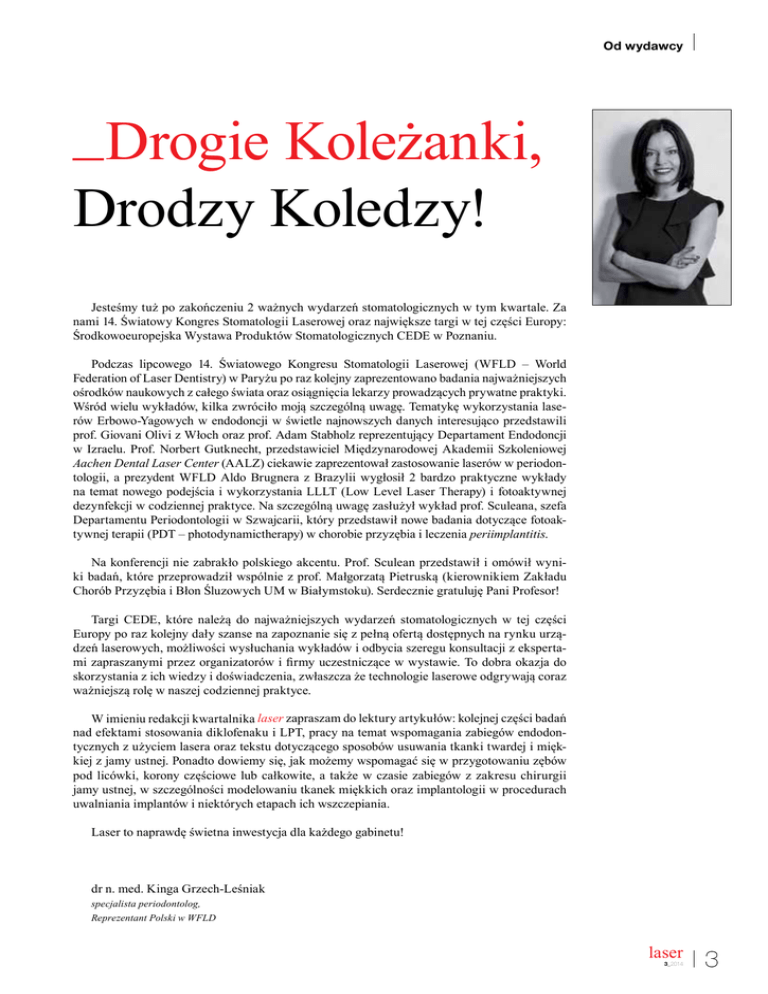 Od wydawcy _ Drogie Koleżanki, Drodzy Koledzy! Jesteśmy tuż po zakończeniu 2 ważnych wydarzeń stomatologicznych w tym kwartale. Za nami 14. Światowy Kongres Stomatologii Laserowej oraz największe targi w tej części Europy: Środkowoeuropejska Wystawa Produktów Stomatologicznych CEDE w Poznaniu. Podczas lipcowego 14. Światowego Kongresu Stomatologii Laserowej (WFLD – World Federation of Laser Dentistry) w Paryżu po raz kolejny zaprezentowano badania najważniejszych ośrodków naukowych z całego świata oraz osiągnięcia lekarzy prowadzących prywatne praktyki. Wśród wielu wykładów, kilka zwróciło moją szczególną uwagę. Tematykę wykorzystania laserów Erbowo-Yagowych w endodoncji w świetle najnowszych danych interesująco przedstawili prof. Giovani Olivi z Włoch oraz prof. Adam Stabholz reprezentujący Departament Endodoncji w Izraelu. Prof. Norbert Gutknecht, przedstawiciel Międzynarodowej Akademii Szkoleniowej Aachen Dental Laser Center (AALZ) ciekawie zaprezentował zastosowanie laserów w periodontologii, a prezydent WFLD Aldo Brugnera z Brazylii wygłosił 2 bardzo praktyczne wykłady na temat nowego podejścia i wykorzystania LLLT (Low Level Laser Therapy) i fotoaktywnej dezynfekcji w codziennej praktyce. Na szczególną uwagę zasłużył wykład prof. Sculeana, szefa Departamentu Periodontologii w Szwajcarii, który przedstawił nowe badania dotyczące fotoaktywnej terapii (PDT – photodynamictherapy) w chorobie przyzębia i leczenia periimplantitis. Na konferencji nie zabrakło polskiego akcentu. Prof. Sculean przedstawił i omówił wyniki badań, które przeprowadził wspólnie z prof. Małgorzatą Pietruską (kierownikiem Zakładu Chorób Przyzębia i Błon Śluzowych UM w Białymstoku). Serdecznie gratuluję Pani Profesor! Targi CEDE, które należą do najważniejszych wydarzeń stomatologicznych w tej części Europy po raz kolejny dały szanse na zapoznanie się z pełną ofertą dostępnych na rynku urządzeń laserowych, możliwości wysłuchania wykładów i odbycia szeregu konsultacji z ekspertami zapraszanymi przez organizatorów i irmy uczestniczące w wystawie. To dobra okazja do skorzystania z ich wiedzy i doświadczenia, zwłaszcza że technologie laserowe odgrywają coraz ważniejszą rolę w naszej codziennej praktyce. W imieniu redakcji kwartalnika laser zapraszam do lektury artykułów: kolejnej części badań nad efektami stosowania diklofenaku i LPT, pracy na temat wspomagania zabiegów endodontycznych z użyciem lasera oraz tekstu dotyczącego sposobów usuwania tkanki twardej i miękkiej z jamy ustnej. Ponadto dowiemy się, jak możemy wspomagać się w przygotowaniu zębów pod licówki, korony częściowe lub całkowite, a także w czasie zabiegów z zakresu chirurgii jamy ustnej, w szczególności modelowaniu tkanek miękkich oraz implantologii w procedurach uwalniania implantów i niektórych etapach ich wszczepiania. Laser to naprawdę świetna inwestycja dla każdego gabinetu! dr n. med. Kinga Grzech-Leśniak specjalista periodontolog, Reprezentant Polski w WFLD laser 3_2014 3