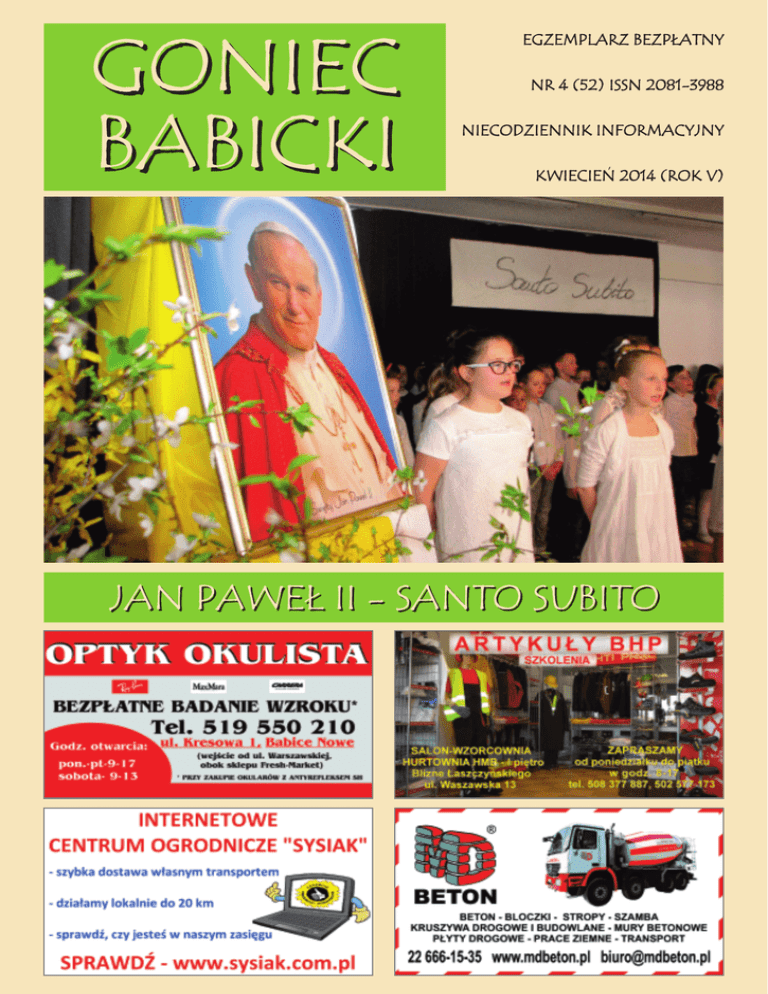 Adres wydawcy (redakcji): PUNKT REDAKCYJNY: Księgarnia "VERBUM" - Stare Babice, ul. Rynek 17 Redaguje Zespół w składzie: Michał Starnowski Dariusz Smoliński,Tomasz Szuba Piotr Dąbrowski Autor zdjęcia na okładce: fot. Dariusz Smoliński ZGŁOSZENIA REKLAMOWE I OGŁOSZENIOWE: tel. 796-920-796; 796-020;796 lub [email protected] lub [email protected] Skład: ; Konto: mbank Druk: KURIER IZABELIŃSKI RUSZYLIŚMY Z NOWĄ GAZETĄ Jak informowaliśmy wstępnie w ostatnim numerze Naszego Gońca Babickiego, ruszamy z no wym pomysłem w Gminie Izabelin. Kurier Izabeliński, W pierwszym numerze Kuriera Izabelińskiego poruszymy m. in. www.kurierizabelinski.pl Zatem trzymajcie kciuki, życzcie Nam szczęścia i wytrwałości, Michał Starnowski Redaktor Naczelny KSIĘGARNIA "VERBUM" POLECA... KSIĄŻKĘ "NIEBO ISTNIEJE NAPRAWDĘ" Co zmieniłbyś w swoim życiu, gdybyś miał pewność, że cokolwiek się wydarzy, wszystko się dobrze, a nawet wspaniale skończy?… "Niebo", to ostatnie słowo Boga, a wiara w jego istnienie zmienia wszystko… tego może my być pewni. Książka "Niebo istnieje naprawdę" Coltona Tym krótkim artykułem zachęcamy do przeczytania kolejnej pozycji autorstwa Todda i Sonji Burpo "Niebo zmienia wszystko". - Colton, pamiętasz szpital? - Tak, pamiętam - To tam śpiewały mi anioły. Księgarnia "VERBUM" zaprasza również wszystkich, którzy chcieliby na swój sposób uczcić dzień kanonizacji Papieża Polaka. W majowej ofercie księgarni również zaproszenia na I Komunię Świętą, Dariusz Smoliński NOWE BANKNOTY NBP JUŻ W OBIEGU Od kwietnia 2014 roku Narodowy Bank Polski wprowadził do obiegu banknoty 10, 20, 50, 100 złotych ze zmodernizowanymi zabezpieczeniami. Banknot o nominale 200 zł obecnie pozostał bez zmian. Wszystkie dotychczasowe banknoty pozostają ważne bezterminowo. Charakterystyczne elementy zmodernizowanego banknotu, to: W banknocie 100 złotowym w tym miejscu znajduje się rozeta zmieniająca kolor (farba zmienna optycznie). We wszystkich nowych banknotach zastosowano również uzupełniający się druk obustronny (recto-verso), Dodatkowo w banknocie 100 złotowym, Jak informuje Narodowy Bank Polski wzbogacony został znak wodny. Na wszystkich nowych banknotach wprowadzono mikroskopijne napisy. Podobnie jak starsze banknoty, nowe świecą w w ultrafiolecie. W poniedziałek 7 kwietnia 2014 roku Narodowy Bank Polski rozpoczął stopniowe wprowadzanie do obiegu banknotów ze zmodernizowanymi zabezpieczeniami. na podstawie www.nbp.pl - zebrał: Michał Starnowski Podobnie jak wcześniej, w nowych banknotach jest również nitka zabezpieczająca. Na banknotach 10 i 20 złotowych, na odwrotnej stronie banknotu umieszczono pas opalizujący w kolorze liliowym z cyfrowym oznaczeniem nominału i skrótem „ZŁ”. W banknocie 50 złotowym na awersie znajduje się za to królewska litera "K" CYKL PRAWNIK RADZI ALIMENTY NALEŻĄ SIĘ NIE TYLKO DZIECKU Obowiązek alimentacyjny zgodnie z definicja Kodeksu rodzinnego i opiekuńczego (K.r.o.) - to obowiązek dostarczania środków utrzymania (dostarczanie środków pieniężnych), a także środków wychowania (osobiste starania w wychowywaniu uprawnionego dziecka). Obowiązek ma charakter rodzinnoprawny, oznacza to, że obciąża krewnych w linii prostej i rodzeństwo, a jego celem jest zaspokajanie potrzeb osoby uprawnionej. Zaspokajanie potrzeb dotyczy potrzeb bieżących. Z tego powodu wyjątkowo można dochodzić zapłaty alimentów za okres miniony, czy też domagać się ich na przyszłość. Obowiązek alimentacyjny jest szczególnego rodzaju zobowiązaniem (cywilnym), gdzie w przypadku konkretnego nałożenia obowiązku przez sąd, z jednej strony występuje uprawniony (wierzyciel), z drugiej zobowiązany (dłużnik). Jest świadczeniem osobistym (należnym konkretnej osobie), wobec czego nie można uprawnień wynikających z obowiązku alimentacyjnego przelać na inną osobę. Niedopuszczalne jest też zrzeczenie się prawa do otrzymywania alimentów. obowiązek alimentacyjny w pierwszej kolejności spoczywa na dzieciach, w drugiej kolejności na rodzicach, i na końcu na rodzeństwie. KTO MOŻE DOMAGAĆ SIĘ ALIMENTÓW?: Małżonek rozwiedziony może żądać alimentów od byłego małżonka alimentów, wtedy gdy: Aby zobowiązany nie uchylał się od obowiązku alimentacyjnego Obowiązek alimentacyjny małżonków, czy byłych małżonków względem siebie, nie ma z góry określonego czasu trwania. DZIECI "Rodzice obowiązani są do świadczeń alimentacyjnych względem dziecka, które nie jest jeszcze w stanie utrzymać się samodzielnie, chyba że dochody z majątku dziecka wystarczają na pokrycie kosztów jego utrzymania i wychowania." MAŁŻONKOWIE - RODZICE "Obowiązek dostarczania środków utrzymania, a w miarę potrzeby także środków wychowania (obowiązek alimentacyjny), obciąża krewnych w linii prostej oraz rodzeństwo", żądanie świadczeń alimentacyjnych od swoich dorosłych dzieci. Alimentów można żądać najwyżej za 3 lata wstecz. Obowiązek obciąża rodziców niezależnie od faktu, czy pozostają oni w małżeństwie czy nie. Przepisy nie wskazują wyraźnie, w którym momencie obowiązek rodziców względem dziecka wygasa, Ważne: Anna Mioduszewska Biuro Prawne "Vis Legis" tel. 535-581-976 Stare Babice, ul. Rynek 18 RUSZA PROJEKT "PROMUJEMY SIĘ NA 5+" Na terenie naszej gminy rusza to projekt Fundacji "Z perspektywą" o nazwie "Promujemy się na 5+". Projekt ten jest współfinansowany ze środków LGD, a jego celem jest promowanie i integrowanie rodzin wielodzietnych, tj. posiada jących trójkę i więcej dzieci. Realizacja projektu nastąpi w okresie od maja 2014 do września 2014. Pod hasłem "Niedzielne Warsztaty Rodzinne" "Wielo Mama To MA!". "Ojcowskie rozważania przy rybce". "nie zniszcz one-wymienione" Udział w projekcie jest nieodpłatny. Rekruta cja rodzin odbędzie się m.in. przy udziale szkół z terenu Gmin decyduje kolejność zgło szeń. Rekr