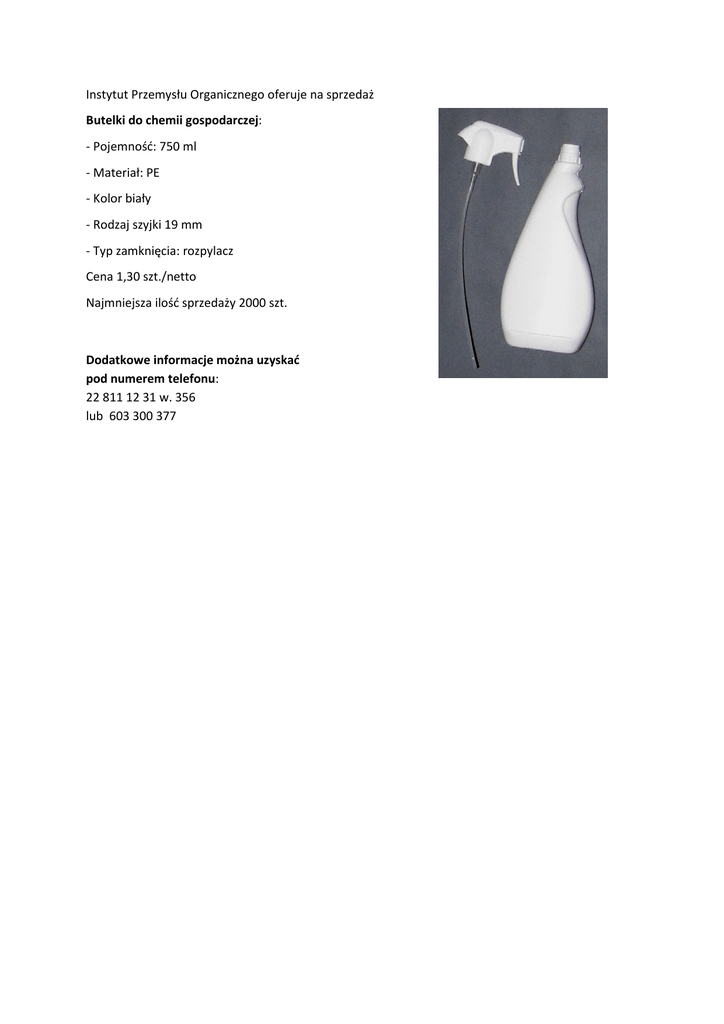 Instytut Przemysłu Organicznego rganicznego oferuje na sprzedaż Butelki do chemii gospodarczej:: - Pojemność: 750 ml - Materiał: PE - Kolor biały - Rodzaj szyjki 19 mm - Typ zamknięcia: rozpylacz Cena 1,30 szt./netto Najmniejsza ilość sprzedaży 2000 szt. Dodatkowe informacje można uzyskać pod numerem telefonu: 22 811 12 31 w. 356 lub 603 300 377