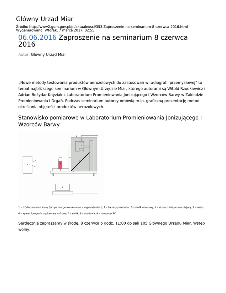 Główny Urząd Miar Źródło: http://www2.gum.gov.pl/pl/aktualnosci/353,Zaproszenie-na-seminarium-8-czerwca-2016.html Wygenerowano: Wtorek, 7 marca 2017, 02:55 06.06.2016 Zaproszenie na seminarium 8 czerwca 2016 Autor: Główny Urząd Miar „Nowe metody testowania produktów aerozolowych do zastosowań w radiografii przemysłowej” to temat najbliższego seminarium w Głównym Urzędzie Miar, którego autorami są Witold Rzodkiewicz i Adrian Bożydar Knyziak z Laboratorium Promieniowania Jonizującego i Wzorców Barwy w Zakładzie Promieniowania i Drgań. Podczas seminarium autorzy omówią m.in. graficzną prezentację metod określania objętości produktów aerozolowych. Stanowisko pomiarowe w Laboratorium Promieniowania Jonizującego i Wzorców Barwy 1 – źródło promieni X-ray (lampa rentgenowska wraz z wyposażeniem), 2 – badany przedmiot, 3 – stolik obrotowy, 4 – ekran z folią wzmacniającą, 5 – lustro, 6 – aparat fotograficzny/kamera cyfrowa, 7 – stolik, 8 – obudowa, 9 – komputer PC. Serdecznie zapraszamy w środę, 8 czerwca o godz. 11:00 do sali 105 Głównego Urzędu Miar. Wstęp wolny.