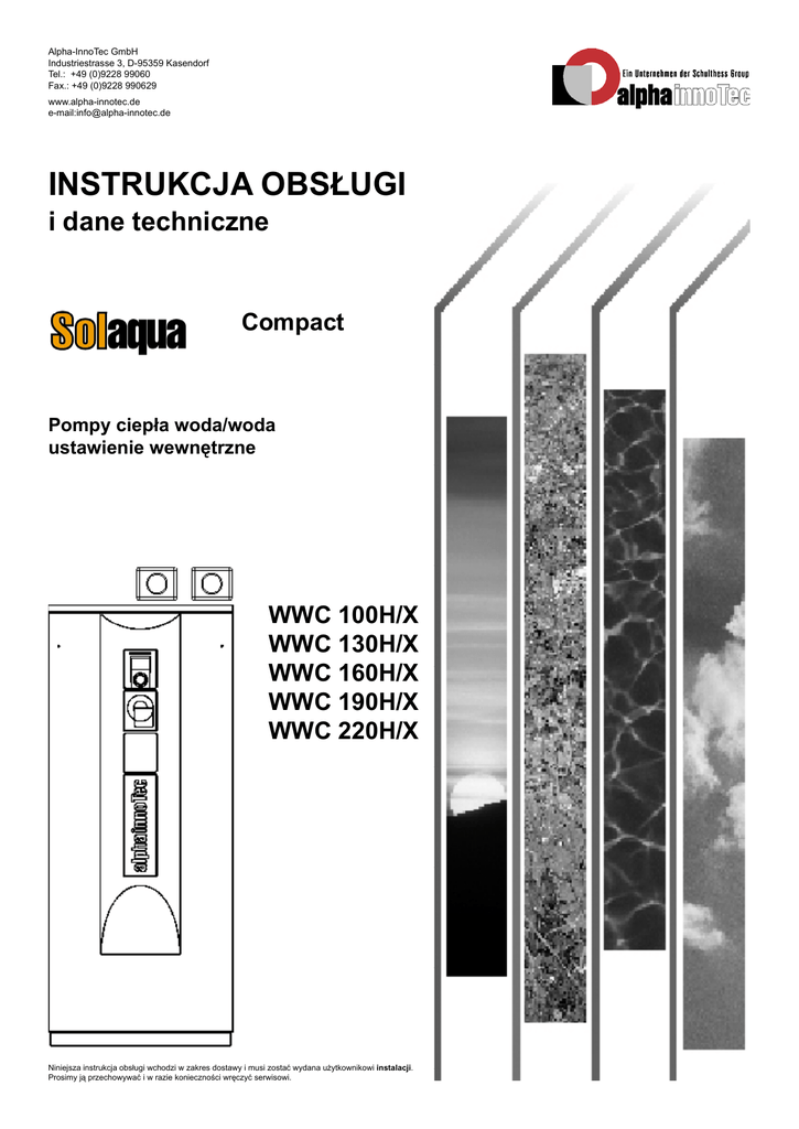 Alpha-InnoTec GmbH Industriestrasse 3, D-95359 Kasendorf Tel.: +49 (0)9228 99060 Fax.: +49 (0)9228 990629 www.alpha-innotec.de e-mail:[email protected] INSTRUKCJA OBSŁUGI i dane techniczne Compact Pompy ciepła woda/woda ustawienie wewnętrzne WWC 100H/X WWC 130H/X WWC 160H/X WWC 190H/X WWC 220H/X Niniejsza instrukcja obsługi wchodzi w zakres dostawy i musi zostać wydana użytkownikowi instalacji. Prosimy ją przechowywać i w razie konieczności wręczyć serwisowi. SPIS TREŚCI Strona Wskazówki dot. bezpieczeństwa 3 Informacje ogólne, zakres dostawy 4 Zakres zastosowań 5 Transport 6 Ustawienie 7 Montaż Dolne źródło ciepła 9 Obieg grzewczy 10 Schematy hydrauliczne 12 Przyłącza elektryczne 14 Panel sterowania 15 Plan zacisków 16 Pierwsze uruchomienie/Pielęgnacja/Błędy 17 Dane techniczne 18 Moc grzewcza, COP 23 Moc chłodnicza 28 Ciśnienie 33 Wymiary 38 Schematy elektryczne 40 Świadectwo zgodności z normami WE 46 Warunki gwarancji 47 Zgłoszenie gotowości do uruchomienia 48 Zastrzegamy możliwość zmian technicznych - Technische Änderungen vorbehalten - 830134/160710 830145/161009 830134/160710 830145/161009 wskazówki dot. bezpieczeństwa W niniejszej instrukcji zastosowano następujące oznaczenia: Wskazówki dot. bezpieczeństwa bezwzględnie przestrzegać! Wskazówki dot. funkcji i trybów pracy i przestrzegać Odnośnik do instrukcji obsługi regulatora pompy ciepła Ustawienie, instalacja i pierwsze uruchomienie instalacji z pompą ciepła muszą zostać przeprowadzone przez wykwalifikowanego instalatora, przestrzegając odpowiednich obowiązujących przepisów, zaleceń, dyrektyw oraz instrukcji obsługi. Zastosowanie pompy ciepła należy miejscowym zakładzie energetycznym. zgłosić w Nachylenie pompy ciepła podczas transportu nie może przekroczyć 45°. Części zabudowy i orurowanie obiegu chłodniczego, strony grzewczej oraz strony dolnego źródła ciepła nie mogą być w żadnym wypadku używane do celów transportowych. Ze względów bezpieczeństwa technicznego nie należy wyłączać zasilania pompy ciepła ani regulatora także poza sezonem grzewczym. Urządzenie może zostać otwarte jedynie przez wykwalifikowanego instalatora. Przed otworzeniem urządzenia należy odłączyć od zasilania wszystkie obiegi. Prace przy obiegu chłodniczym może przeprowadzać jedynie wykwalifikowany instalator. Czyszczenie i płukanie części urządzenia (w szczególności skraplacza i parowacza) powinien przeprowadzać wyłącznie autoryzowany serwis! Należy stosować wyłącznie zalecane przez producenta środki czyszczące. i Górnych powierzchni urządzenia nie traktować nigdy środkami szorującymi ani zawierającymi kwasy lub chlor środkami czyszczącymi. Zastrzegamy możliwość zmian technicznych - Technische Änderungen vorbehalten - INFORMACJE OGÓLNE / zakres dostawy Informacje ogólne Zakres dostawy Elementy zintegrowane z pompą ciepła: Zastosowanie Pompa ciepła jest przeznaczona wyłącznie do celów c.o. i przygotowywania c.w.u. Przestrzegając zakresu zastosowania (patrz „dane techniczne“ w załączniku) pompę ciepła można zamontować tak w istniejącej, jak i w nowo tworzonej instalacji grzewczej. Sposób pracy pompy ciepła solanka/woda Pompa ciepła zamienia zawarte w wodzie gruntowej ciepło niskotemperaturowe w ciepło o wyższej temperaturze. W tym celu woda gruntowa jest doprowadzana do parowacza pompy ciepła, gdzie znajduje się płynny środek roboczy, który przy niskiej temperaturze i niższym ciśnieniu wrze i paruje. Konieczne do odparowania ciepło zostaje odebrane wodzie gruntowej. Odparowane medium jest zasysane przez sprężarkę i sprężane do wysokiego ciśnienia. Sprężone, w formie gazowej medium robocze zostaje przeniesione do kondensatora, gdzie przy wysokim ciśnieniu i temperaturze następuje jego kondensacja. Ciepło kondensacji zostaje przeniesione do wody grzewczej c.o., której temperatura wzrasta. Przeniesiona do wody grzewczej energia odpowiada energii odebranej wcześniej wodzie gruntowej pomniejszonej o niewielką część energii elektrycznej, koniecznej do pracy sprężarki. Zastosowanie energooszczędnego ogrzewania z pompą ciepła Państwa decyzja dotycząca ogrzewania przy użyciu pompy ciepła ma duży wkład w ochronę środowiska poprzez obniżenie emisji i zmniejszenie zużycia energii pierwotnej. Aby Państwa nowy system grzewczy pracował efektywnie, zwróćcie proszę uwagę na następujące punkty: Unikajcie Państwo niepotrzebnych wysokich temperatur na zasilaniu. Im niższa temperatura na zasilaniu po stronie c.o., tym większa efektywność pracy pompy ciepła. urządzenie kompaktowe z w pełni hermetyczną sprężarką i wszystkimi częściami zabudowy ważnymi dla bezpieczeństwa i nadzoru nad obiegiem chłodniczym. regulator pompy ciepła i c.o. ( czujnik temperatury zewnętrznej na czas transportu jest przechowywany wewnątrz urządzenia) skrzynka rozdzielcza z bezpiecznikami elektroniczne urządzenie łagodnego rozruchu dla pomp ciepła od WWC 130H/X do WWC 220H/X pompa obiegowa c.o. (należy zwrócić uwagę na ciśnienie, patrz dane techniczne urządzenia) zawór przelewowy bufora grzałka elektryczna: WWC 100H/X do WWC 130H/X 6kW; WWC 160H/X do WWC 220H/X 9kW odporny na korozję parowacz w zakresie dostawy: Zbiornik wyrównawczy obiegu c.o. z zaworem W połączeniu z zasobnikiem wielofunkcyjnym, wzgl. buforem > 200l należy zainstalować dodatkowy zbiornik wyrównawczy! wzmocnione węże elastyczne obiegu c.o. i c.w.u. (c.o. – ocynkowane , woda – stal szlachetna) paski silomerowe w kartonie dodatkowym osadnik zanieczyszczeń czujnik temperatury zewnętrznej grupa bezpieczeństwa Dalsze uwagi na temat wyposażenia Czujniki wbudowane w urządzenie do ustalenia temperatury wody grzewczej na zasilaniu i powrocie. Czujniki do nadzoru temperatury dolnego źródła ciepła oraz temperatury gazu gorącego w obiegu chłodniczym. Czujnik przepływu do kontroli wielkości przep