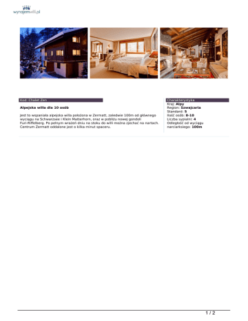 Kod: Chalet Zen Alpejska willa dla 10 osób Jest to wspaniała alpejska willa położona w Zermatt, zaledwie 100m od głównego wyciągu na Schwarzsee i Klein Matterhorn, oraz w pobliżu nowej gondoli Furi-Riffelberg. Po pełnym wrażeń dniu na stoku do willi można zjechać na nartach. Centrum Zermatt oddalone jest o kilka minut spaceru. Charakterystyka Kraj: Alpy Region: Szwajcaria Standard: 5 Ilość osób: 8-10 Liczba sypialni: 4 Odległość od wyciągu narciarksiego: 100m 1/2 Willa została odnowiona w 2004 i oferuje nowoczesne udogodnienia połączone z tradycyjnym alpejskim wystrojem. Do dyspozycji gości są 4 sypialnie z łazienkami wykończonymi marmurem, 3 z sypialni posiadają balkony z widokiem na majestatyczny szczyt Matterhorn. Obok jednej z sypialni mieści się też pokój z dodatkowymi 2 miejscami do spania na łóżkach piętrowych. Willa wyposażona jest w zewnętrzne jacuzzi, prysznic z hydromasażem, pokój do masażu, bar, piwniczkę z winami, telewizor plazmowy z telewizją satelitarną, odtwarzacz DVD, stacje dokujące do iPoda, książki, gry, zabawki, telefon, faks, biurko z komputerem, Internet bezprzewodowy, narciarnie z podgrzewanymi stojakami na buty, windę. Oprócz wynajmu cena zawiera powitanie z szampanem, codzienną poranną kawę/herbatę podawaną do łóżka, codzienne śniadania i popołudniową herbatę, lunche i kolacje dla dzieci, przekąski i szampana serwowane przed kolacją, kolacje (6 dni), open bar, wybór win, sprzątanie, Internet bezprzewodowy. Lokalizacja: Zermatt, 100m od najbliższego wyciągu. Cena za tydzień wynajmu: na zapytanie. 2/2 Powered by TCPDF (www.tcpdf.org)