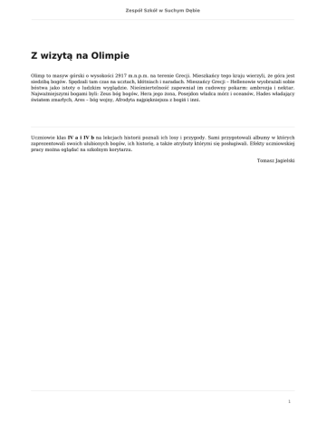 Zespół Szkół w Suchym Dębie Z wizytą na Olimpie Olimp to masyw górski o wysokości 2917 m.n.p.m. na terenie Grecji. Mieszkańcy tego kraju wierzyli, że góra jest siedzibą bogów. Spędzali tam czas na ucztach, kłótniach i naradach. Mieszańcy Grecji – Hellenowie wyobrażali sobie bóstwa jako istoty o ludzkim wyglądzie. Nieśmiertelność zapewniał im cudowny pokarm: ambrozja i nektar. Najważniejszymi bogami byli: Zeus bóg bogów, Hera jego żona, Posejdon władca mórz i oceanów, Hades władający światem zmarłych, Ares – bóg wojny, Afrodyta najpiękniejsza z bogiń i inni. Uczniowie klas IV a i IV b na lekcjach historii poznali ich losy i przygody. Sami przygotowali albumy w których zaprezentowali swoich ulubionych bogów, ich historię, a także atrybuty którymi się posługiwali. Efekty uczniowskiej pracy można oglądać na szkolnym korytarzu. Tomasz Jagielski 1