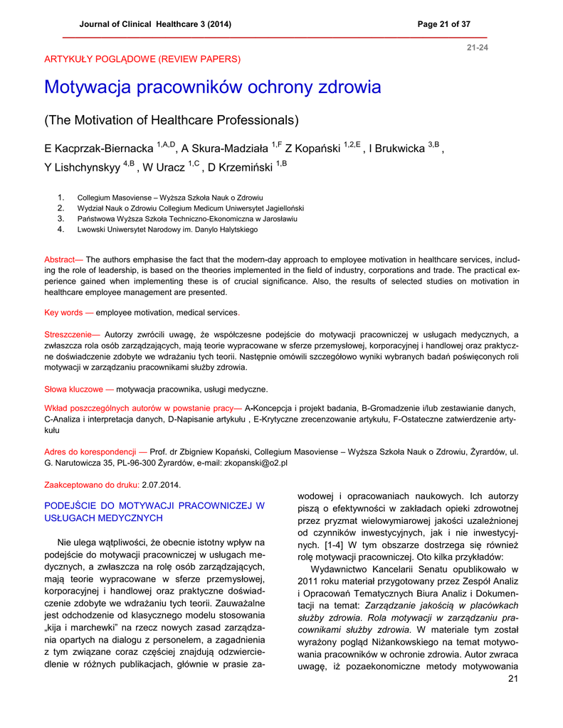 Journal of Clinical Healthcare 3 (2014) Page 21 of 37 ————————————————————————————————— 21-24 ARTYKUŁY POGLĄDOWE (REVIEW PAPERS) Motywacja pracowników ochrony zdrowia (The Motivation of Healthcare Professionals) E Kacprzak-Biernacka 1,A,D, A Skura-Madziała 1,F Z Kopański 1,2,E , I Brukwicka 3,B , Y Lishchynskyy 4,B , W Uracz 1,C , D Krzemiński 1,B 1. 2. 3. 4. Collegium Masoviense – Wyższa Szkoła Nauk o Zdrowiu Wydział Nauk o Zdrowiu Collegium Medicum Uniwersytet Jagielloński Państwowa Wyższa Szkoła Techniczno-Ekonomiczna w Jarosławiu Lwowski Uniwersytet Narodowy im. Danylo Halytskiego Abstract— The authors emphasise the fact that the modern-day approach to employee motivation in healthcare services, including the role of leadership, is based on the theories implemented in the field of industry, corporations and trade. The practical experience gained when implementing these is of crucial significance. Also, the results of selected studies on motivation in healthcare employee management are presented. Key words — employee motivation, medical services. Streszczenie— Autorzy zwrócili uwagę, że współczesne podejście do motywacji pracowniczej w usługach medycznych, a zwłaszcza rola osób zarządzających, mają teorie wypracowane w sferze przemysłowej, korporacyjnej i handlowej oraz praktyczne doświadczenie zdobyte we wdrażaniu tych teorii. Następnie omówili szczegółowo wyniki wybranych badań poświęconych roli motywacji w zarządzaniu pracownikami służby zdrowia. Słowa kluczowe — motywacja pracownika, usługi medyczne. Wkład poszczególnych autorów w powstanie pracy— A-Koncepcja i projekt badania, B-Gromadzenie i/lub zestawianie danych, C-Analiza i interpretacja danych, D-Napisanie artykułu , E-Krytyczne zrecenzowanie artykułu, F-Ostateczne zatwierdzenie artykułu Adres do korespondencji — Prof. dr Zbigniew Kopański, Collegium Masoviense – Wyższa Szkoła Nauk o Zdrowiu, Żyrardów, ul. G. Narutowicza 35, PL-96-300 Żyrardów, e-mail: [email protected] Zaakceptowano do druku: 2.07.2014. PODEJŚCIE DO MOTYWACJI PRACOWNICZEJ W USŁUGACH MEDYCZNYCH Nie ulega wątpliwości, że obecnie istotny wpływ na podejście do motywacji pracowniczej w usługach medycznych, a zwłaszcza na rolę osób zarządzających, mają teorie wypracowane w sferze przemysłowej, korporacyjnej i handlowej oraz praktyczne doświadczenie zdobyte we wdrażaniu tych teorii. Zauważalne jest odchodzenie od klasycznego modelu stosowania „kija i marchewki” na rzecz nowych zasad zarządzania opartych na dialogu z personelem, a zagadnienia z tym związane coraz częściej znajdują odzwierciedlenie w różnych publikacjach, głównie w prasie za- wodowej i opracowaniach naukowych. Ich autorzy piszą o efektywności w zakładach opieki zdrowotnej przez pryzmat wielowymiarowej jakości uzależnionej od czynników inwestycyjnych, jak i nie inwestycyjnych. [1-4] W tym obszarze dostrzega się również rolę motywacji pracowniczej. Oto kilka przykładów: Wydawnictwo Kancelarii Senatu opublikowało w 2011 roku materiał przygotowany przez Zespół Analiz i Opracowań Tematycznych Biura Analiz i Dokumentacji na temat: Zarządzanie jakością w placówkach służby zdrowia. Rola motywacji w zarządzaniu pracownikami służby zdrowia. W materiale tym został wyrażony pogląd Niżankowskiego na temat motywowania pracowników w ochronie zdrowia. Autor zwraca uwagę, iż pozaekonomiczne metody motywowania 21 Journal of Clinical Healthcare 3 (2014) Page 22 of 37 ————————————————————————————————— mogą daleko silniej oddziaływać, niż nagroda czy kara pieniężna. Jego zdaniem przykładanie nadmiernej wagi do sterowania bodźcami finansowymi prowadzi do nieskuteczności w sterowaniu pracownikami z zastrzeżeniem jednak, że bodźce finansowe mają długotrwałe działanie, w przeciwieństwie do innych, których efekt dość szybko zanika. Niżankowski odnosi się także do problemu, czy pracownicy powinni być wynagradzani za własną pracę, czy też stosownie do osiągnięć zespołu pracowniczego. Wskazuje, iż nadmierne podkreślanie indywidualnych osiągnięć rodzi postawy egoistyczne i skutkuje brakiem współpracy pomiędzy pracownikami. Według niego należy zachować umiar i równowagę pomiędzy motywowaniem do indywidualnego wysiłku a motywowaniem do działania w grupie i wspierania innych członków zespołu. Problemem dominującym, szczególnie w publicznej ochronie zdrowia, w naszym kraju jest całkowity brak mechanizmów systematycznej motywacji. Niżankowski uważa, że przełożony czasem pochwali pracownika, ale w większości szpitali i dużych placówek medycznych zauważalny jest brak systematycznego wskazywania wyróżniających się pracowników. Co więcej autor twierdzi, iż tego typu praktyki są obśmiewane jako pomysły rodem z PRL–u. Autor negatywnie również ocenia powszechny system opłaty pracowników, w którym dominuje stała część wynagrodzenia. Jego zdaniem do takiego stanu rzeczy niewątpliwie przyczyniają się naciski związków zawodowych [5]. Dynamiczne zmiany w ochronie zdrowia w Polsce skłaniają kierujących szpitalami i przychodniami do nowego spojrzenia na pozyskiwane, utrzymanie i rozwój zatrudnionych pracowników. Inspiruje to również teoretyków i praktyków zarządzania do badania procesu motywacji w sektorze zdrowia. W literaturze przedmiotu coraz częściej publikowane są wyniki tych badań i możliwości ich wykorzystania. Przybliżane są teorie motywacji oraz ich zastosowanie w praktyce.[6,7] Warto w tym miejscu podać przykład wyników badań ankietowych przeprowadzonych wśród pielęgniarek i położnych zatrudnionych w Klinice Akademii Medycznej we Wrocławiu.[6] Sondażem objęto 91,8% ogółu zatrudnionych w klinice pielęgniarek. Dla osiągnięcia celów badawczych rodzaje pyt