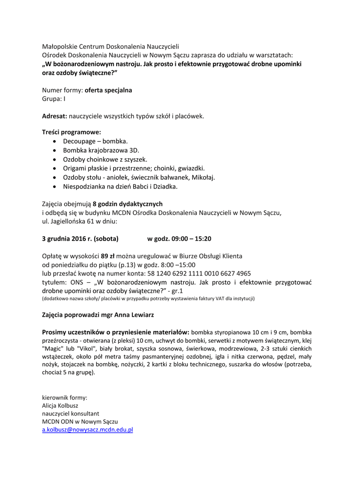 Małopolskie Centrum Doskonalenia Nauczycieli Ośrodek Doskonalenia Nauczycieli w Nowym Sączu zaprasza do udziału w warsztatach: „W bożonarodzeniowym nastroju. Jak prosto i efektownie przygotować drobne upominki oraz ozdoby świąteczne?” Numer formy: oferta specjalna Grupa: I Adresat: nauczyciele wszystkich typów szkół i placówek. Treści programowe: Decoupage – bombka. Bombka krajobrazowa 3D. Ozdoby choinkowe z szyszek. Origami płaskie i przestrzenne; choinki, gwiazdki. Ozdoby stołu - aniołek, świecznik bałwanek, Mikołaj. Niespodzianka na dzień Babci i Dziadka. Zajęcia obejmują 8 godzin dydaktycznych i odbędą się w budynku MCDN Ośrodka Doskonalenia Nauczycieli w Nowym Sączu, ul. Jagiellońska 61 w dniu: 3 grudnia 2016 r. (sobota) w godz. 09:00 – 15:20 Opłatę w wysokości 89 zł można uregulować w Biurze Obsługi Klienta od poniedziałku do piątku (p.13) w godz. 8:00 –15:00 lub przesłać kwotę na numer konta: 58 1240 6292 1111 0010 6627 4965 tytułem: ONS – „W bożonarodzeniowym nastroju. Jak prosto i efektownie przygotować drobne upominki oraz ozdoby świąteczne?” - gr.1 (dodatkowo nazwa szkoły/ placówki w przypadku potrzeby wystawienia faktury VAT dla instytucji) Zajęcia poprowadzi mgr Anna Lewiarz Prosimy uczestników o przyniesienie materiałów: bombka styropianowa 10 cm i 9 cm, bombka przeźroczysta - otwierana (z pleksi) 10 cm, uchwyt do bombki, serwetki z motywem świątecznym, klej "Magic" lub "Vikol", biały brokat, szyszka sosnowa, świerkowa, modrzewiowa, 2-3 sztuki cienkich wstążeczek, około pół metra taśmy pasmanteryjnej ozdobnej, igła i nitka czerwona, pędzel, mały nożyk, stojaczek na bombkę, nożyczki, 2 kartki z bloku technicznego, suszarka do włosów (potrzeba, chociaż 5 na grupę). kierownik formy: Alicja Kolbusz nauczyciel konsultant MCDN ODN w Nowym Sączu [email protected]