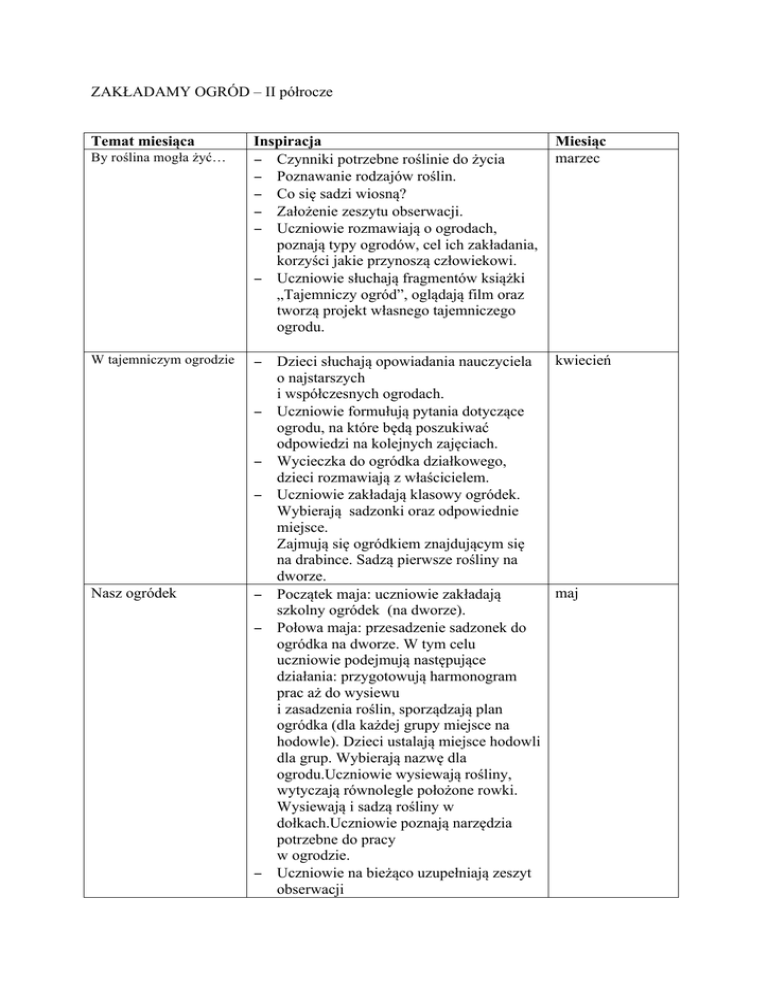 ZAKŁADAMY OGRÓD – II półrocze Temat miesiąca By roślina mogła żyć… W tajemniczym ogrodzie Nasz ogródek Inspiracja − Czynniki potrzebne roślinie do życia − Poznawanie rodzajów roślin. − Co się sadzi wiosną? − Założenie zeszytu obserwacji. − Uczniowie rozmawiają o ogrodach, poznają typy ogrodów, cel ich zakładania, korzyści jakie przynoszą człowiekowi. − Uczniowie słuchają fragmentów książki „Tajemniczy ogród”, oglądają film oraz tworzą projekt własnego tajemniczego ogrodu. Miesiąc marzec kwiecień − Dzieci słuchają opowiadania nauczyciela o najstarszych i współczesnych ogrodach. − Uczniowie formułują pytania dotyczące ogrodu, na które będą poszukiwać odpowiedzi na kolejnych zajęciach. − Wycieczka do ogródka działkowego, dzieci rozmawiają z właścicielem. − Uczniowie zakładają klasowy ogródek. Wybierają sadzonki oraz odpowiednie miejsce. Zajmują się ogródkiem znajdującym się na drabince. Sadzą pierwsze rośliny na dworze. maj − Początek maja: uczniowie zakładają szkolny ogródek (na dworze). − Połowa maja: przesadzenie sadzonek do ogródka na dworze. W tym celu uczniowie podejmują następujące działania: przygotowują harmonogram prac aż do wysiewu i zasadzenia roślin, sporządzają plan ogródka (dla każdej grupy miejsce na hodowle). Dzieci ustalają miejsce hodowli dla grup. Wybierają nazwę dla ogrodu.Uczniowie wysiewają rośliny, wytyczają równolegle położone rowki. Wysiewają i sadzą rośliny w dołkach.Uczniowie poznają narzędzia potrzebne do pracy w ogrodzie. − Uczniowie na bieżąco uzupełniają zeszyt obserwacji Prace w ogrodzie . − Uczniowie pielęgnują ogródek szkolny (podlewanie, pielenie itd.) − Uczniowie pielęgnują ogródek szkolny (podlewanie, pielenie itd.) − Obserwacja ogrodu, zapis zmian w zeszycie obserwacji. − Degustacja warzyw z ogródka szkolnego. czerwiec